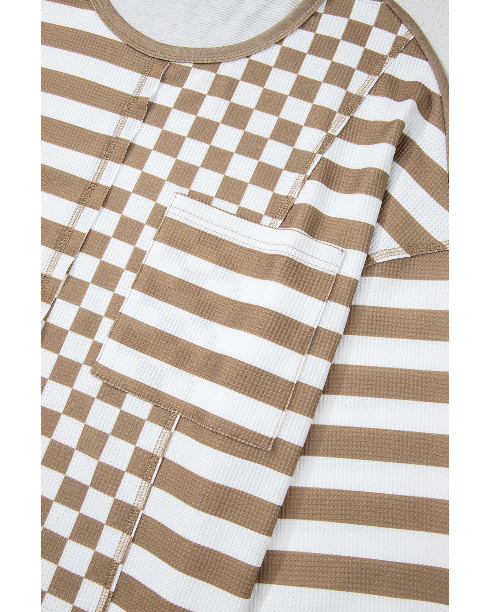 - Khaki checkerboard striped patchwork blouse