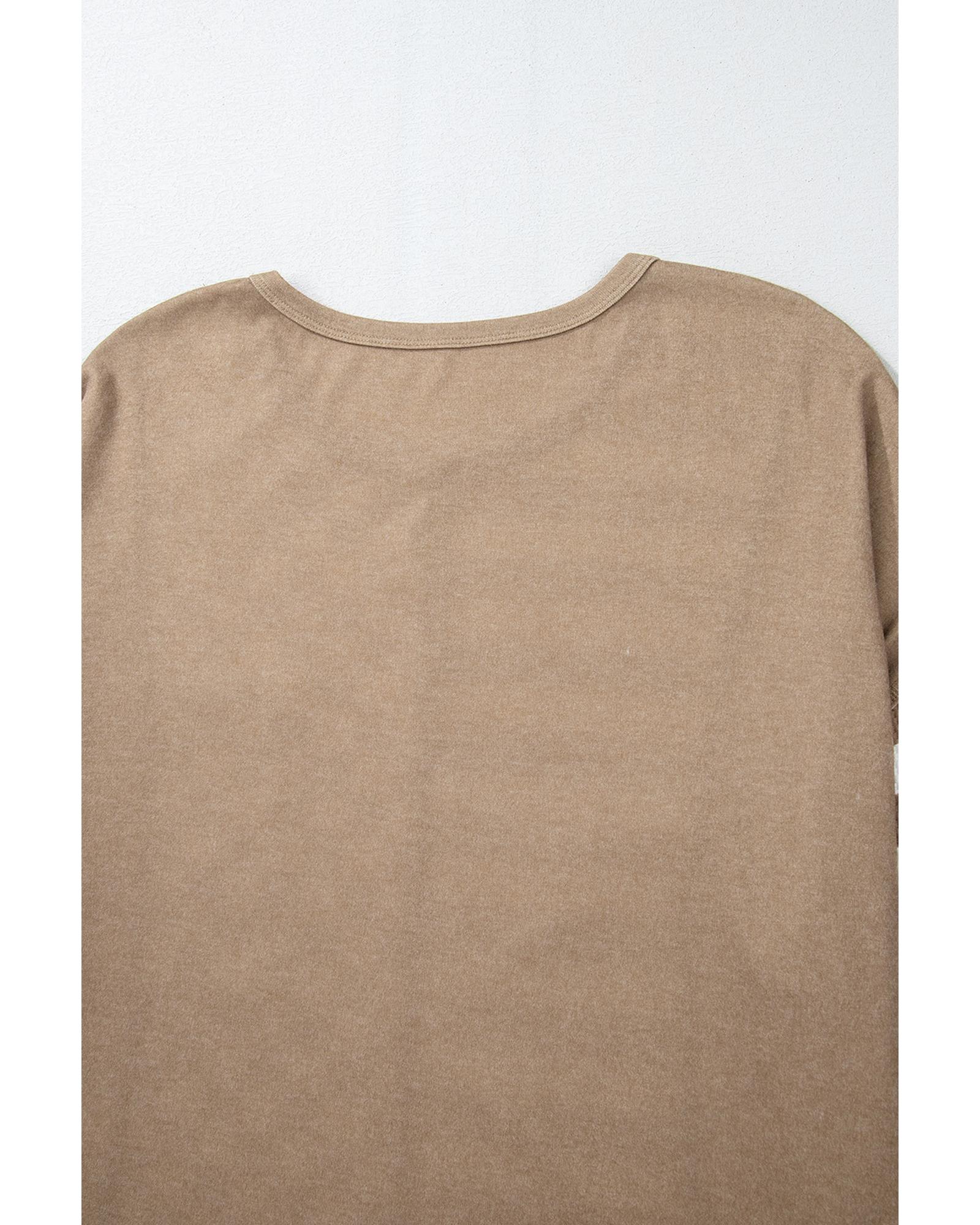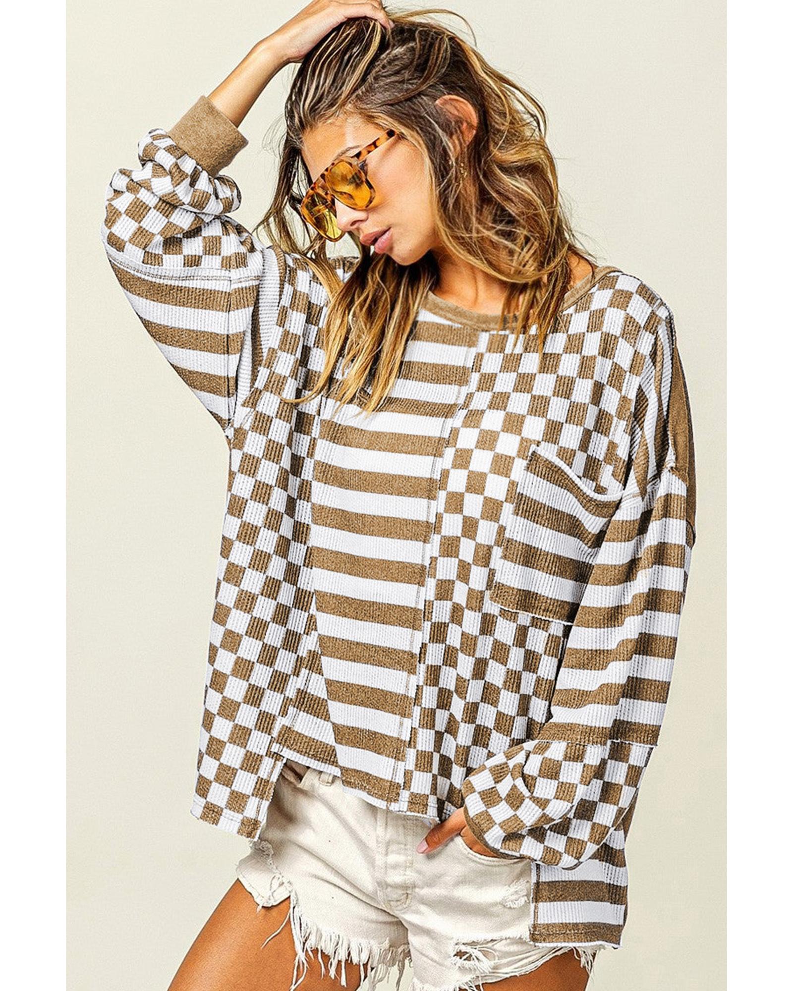 Khaki Checkerboard Striped Patchwork Lantern Sleeve Pocketed Blouse – S