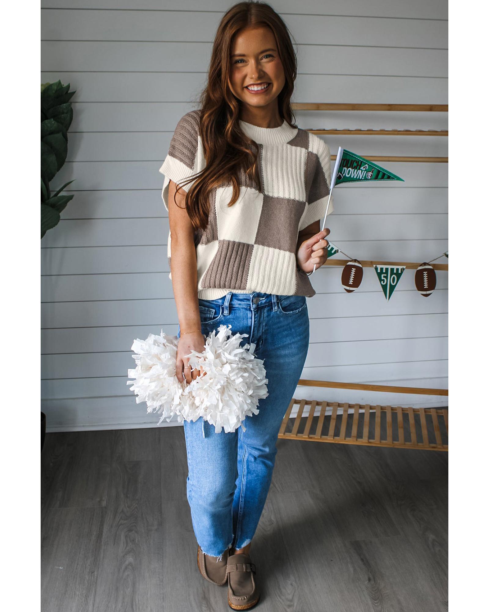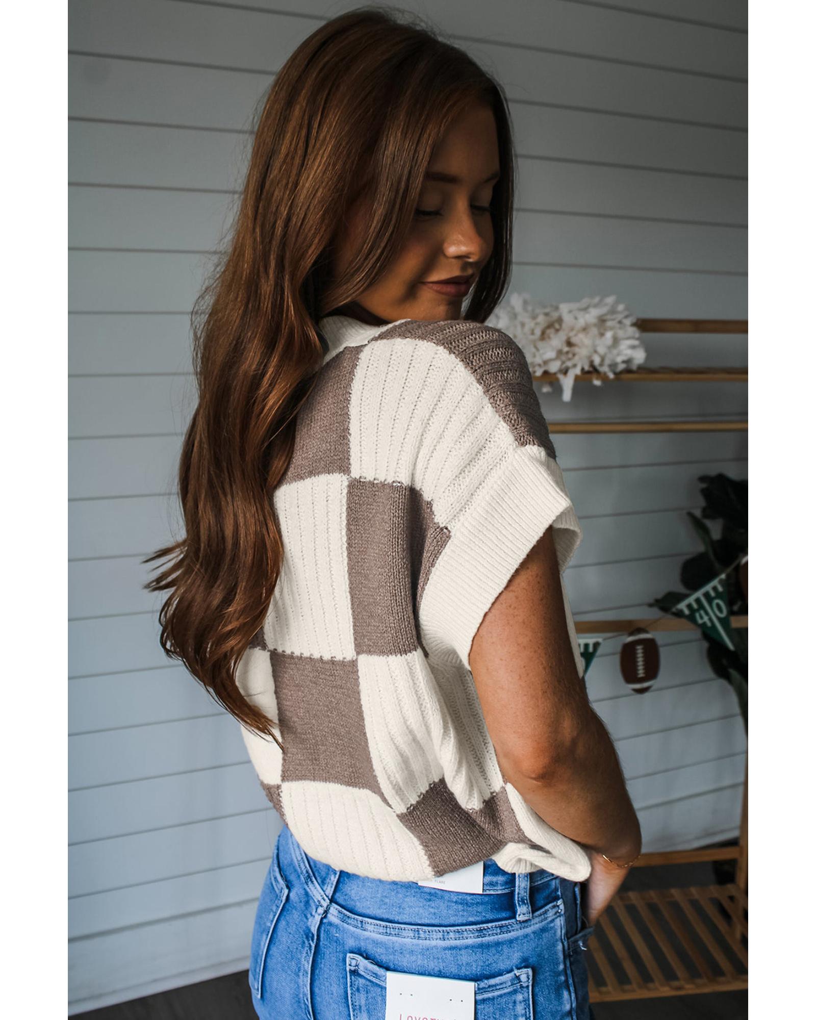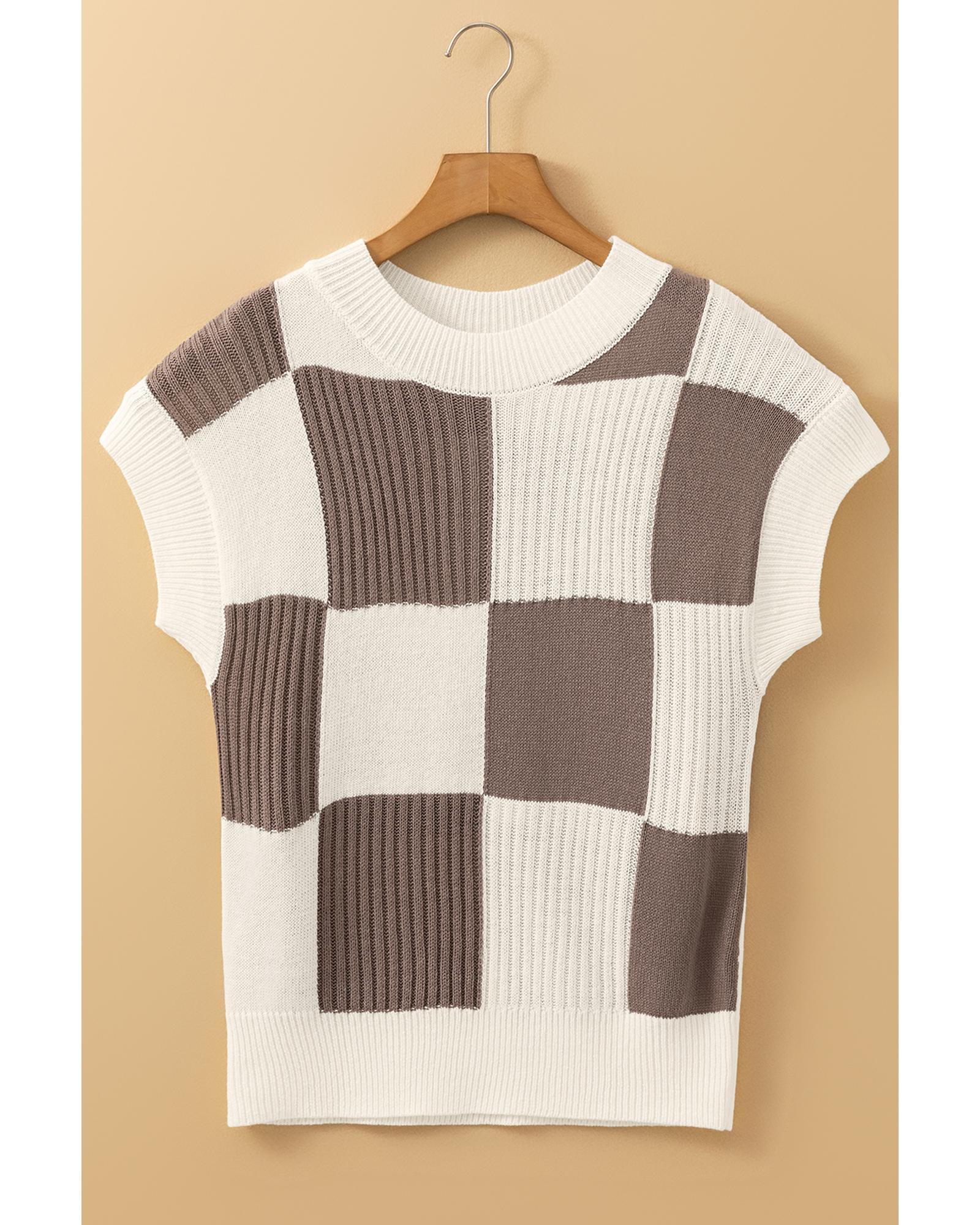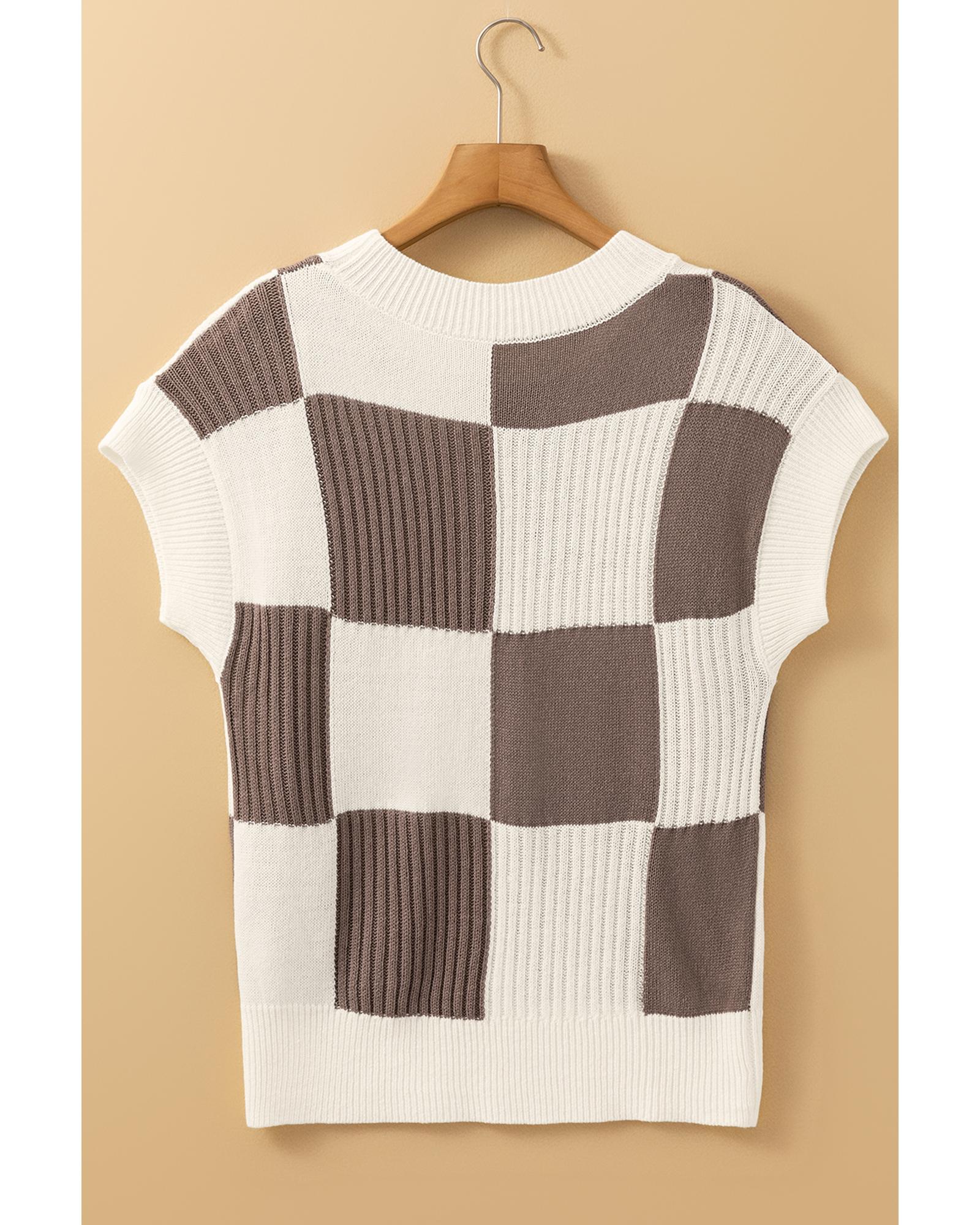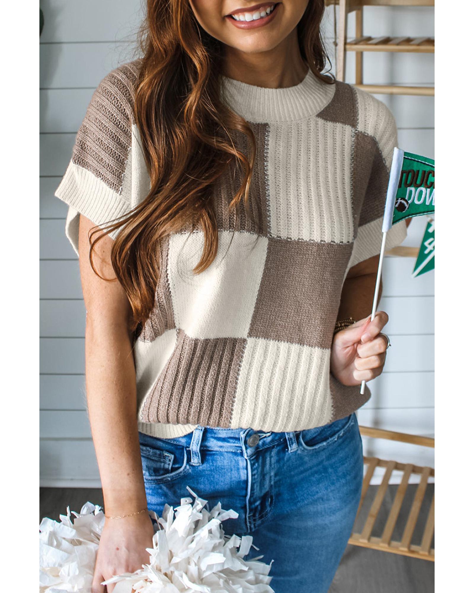 Khaki Checkered Color Block Crew Neck Short Sleeve Sweater – M