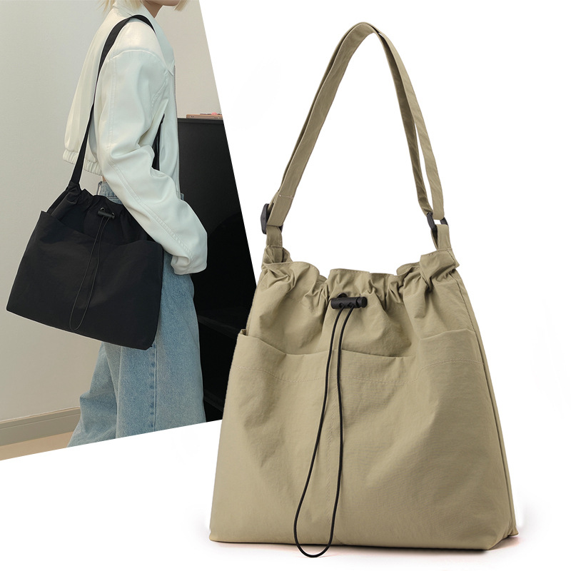 Khaki Chic Lightweight Nylon Drawstring Tote Bag – Multi-Pocket Casual Shoulder & Crossbody