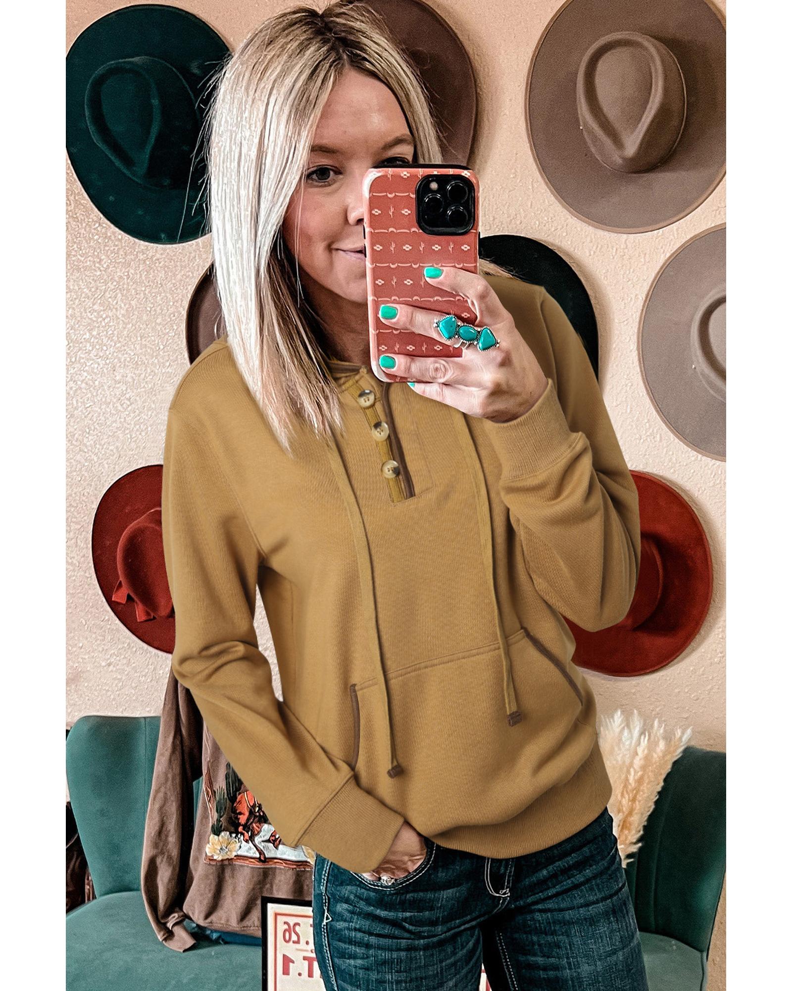 Khaki Drawstring Kangaroo Pocket Henley Hoodie – L