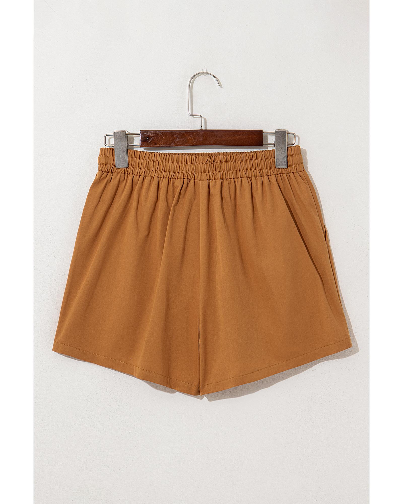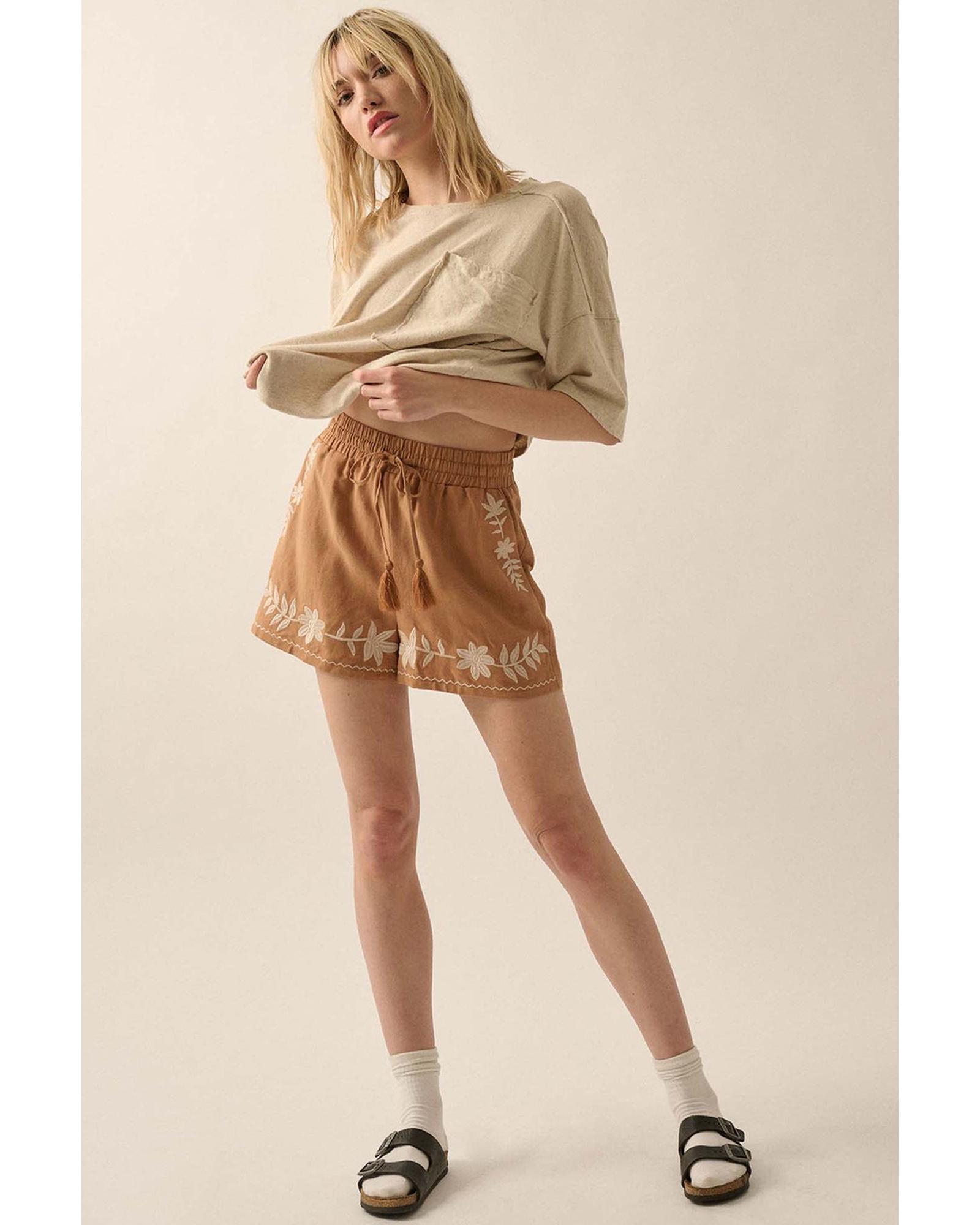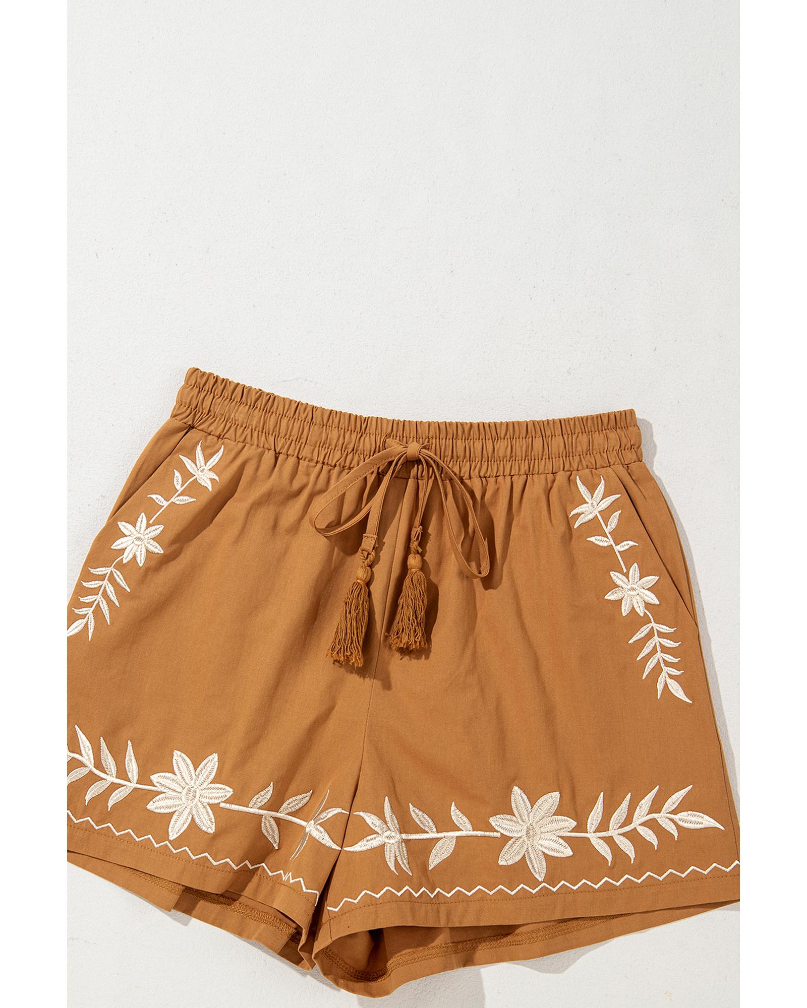 Khaki Embroidered Boho Tasseled Drawstring Elastic Waist Casual shorts – S