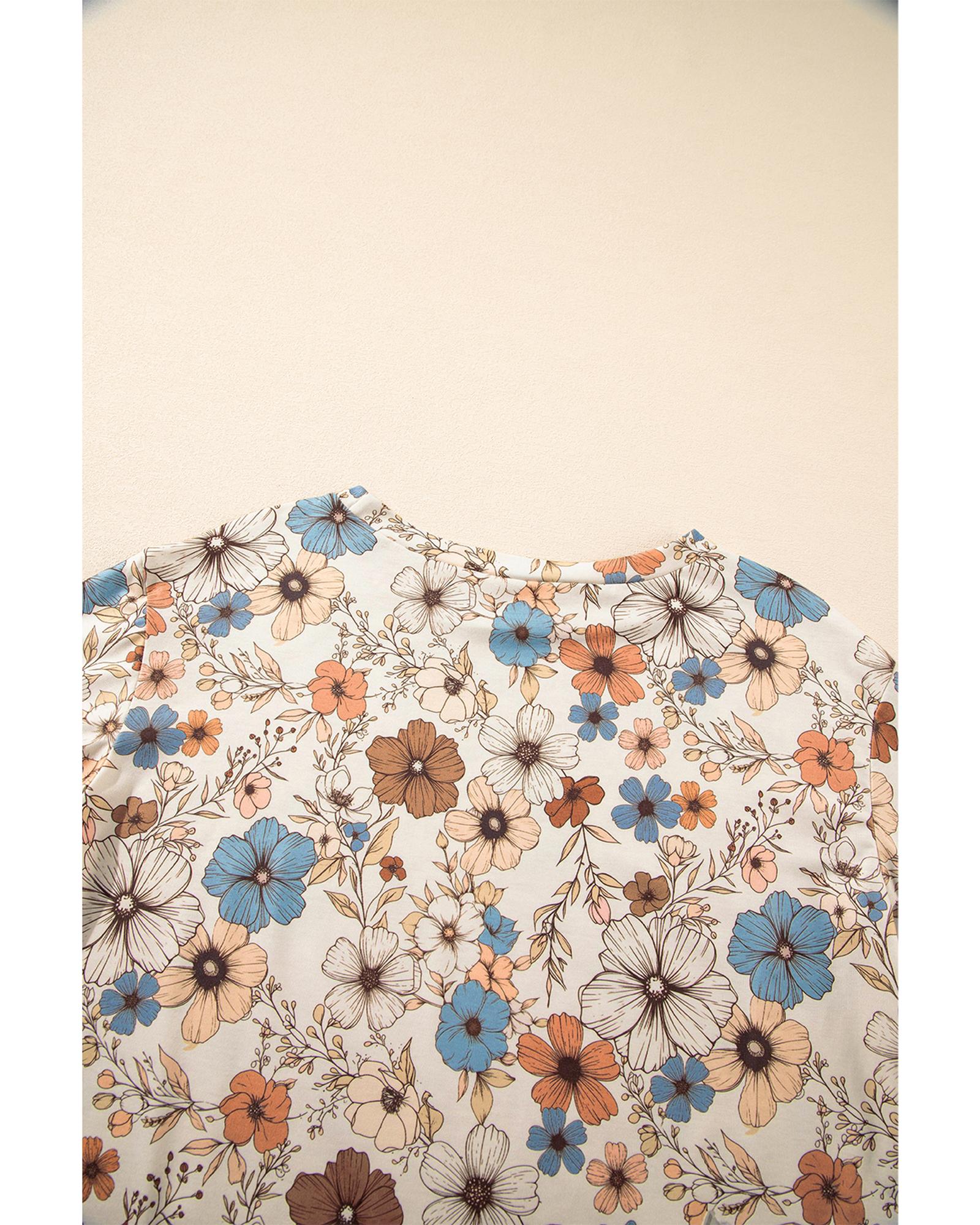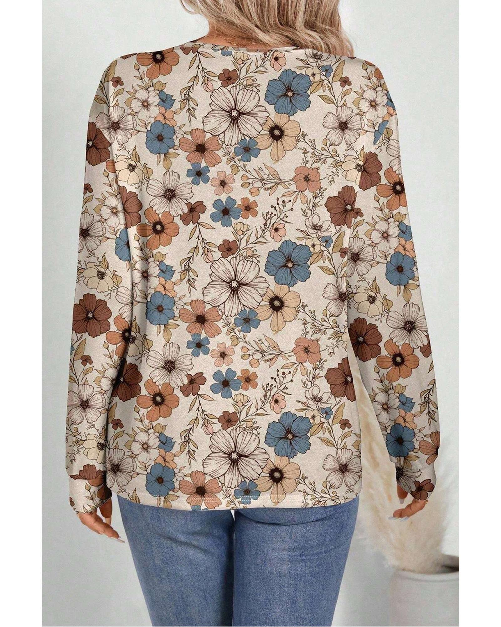 Khaki Floral Print Loose Crew Neck Long Sleeve T Shirt – L