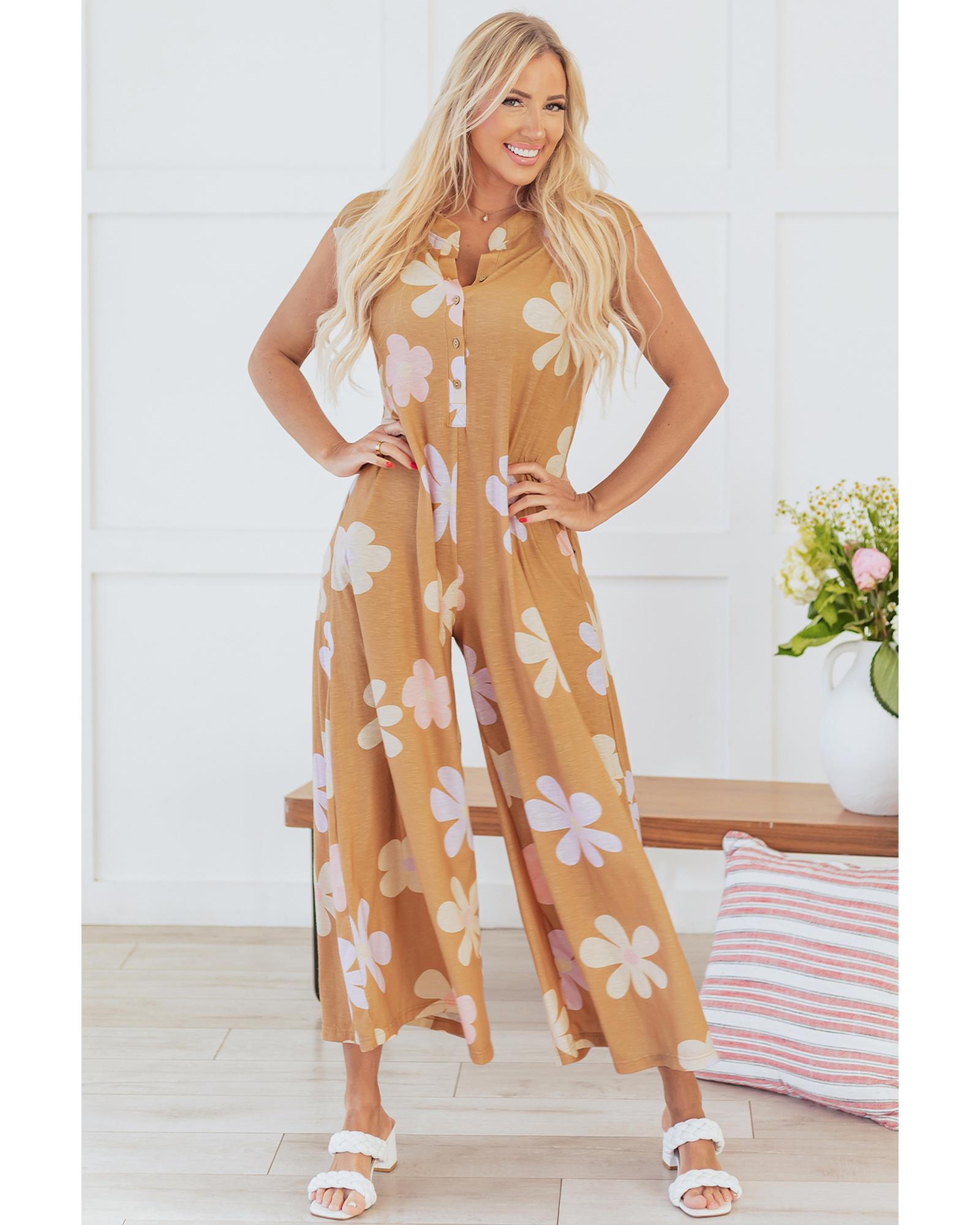 Khaki Floral Print Sleeveless Button up Wide Leg Loose Jumpsuit – L