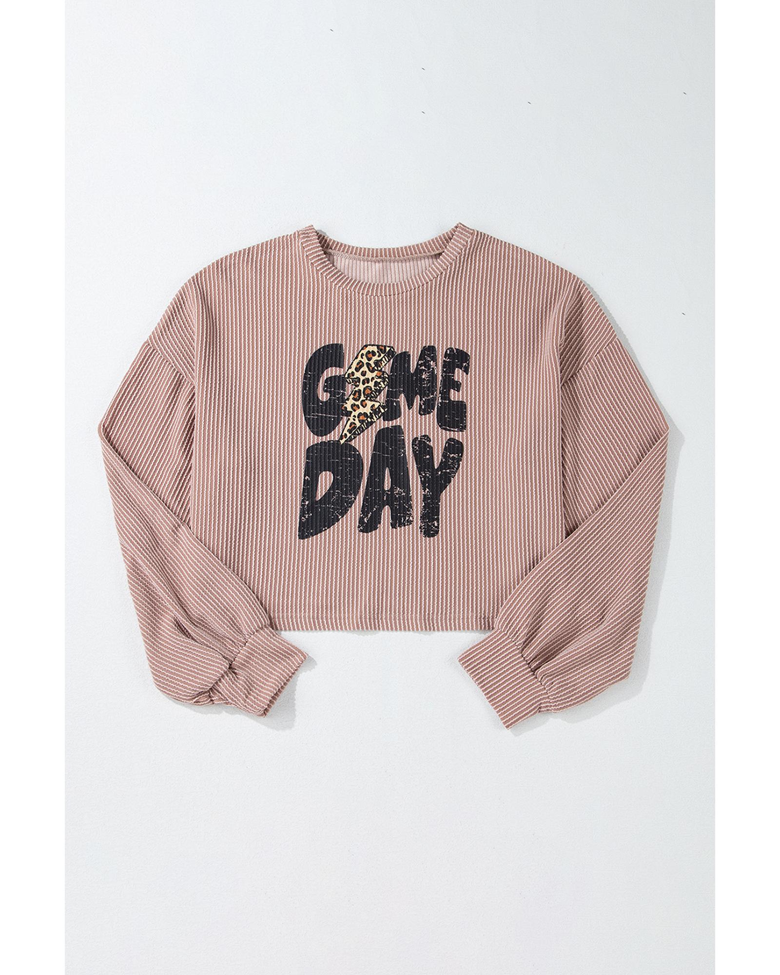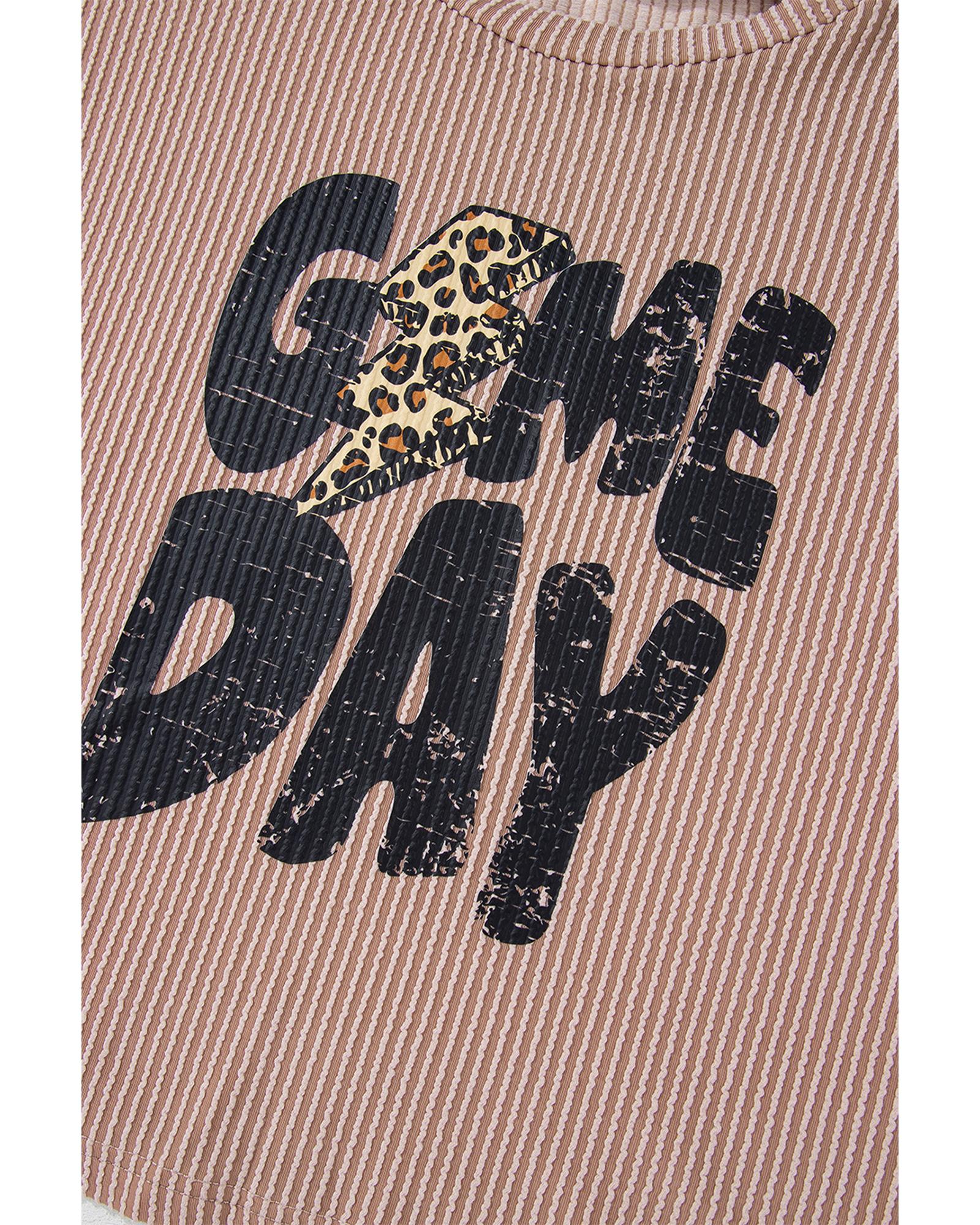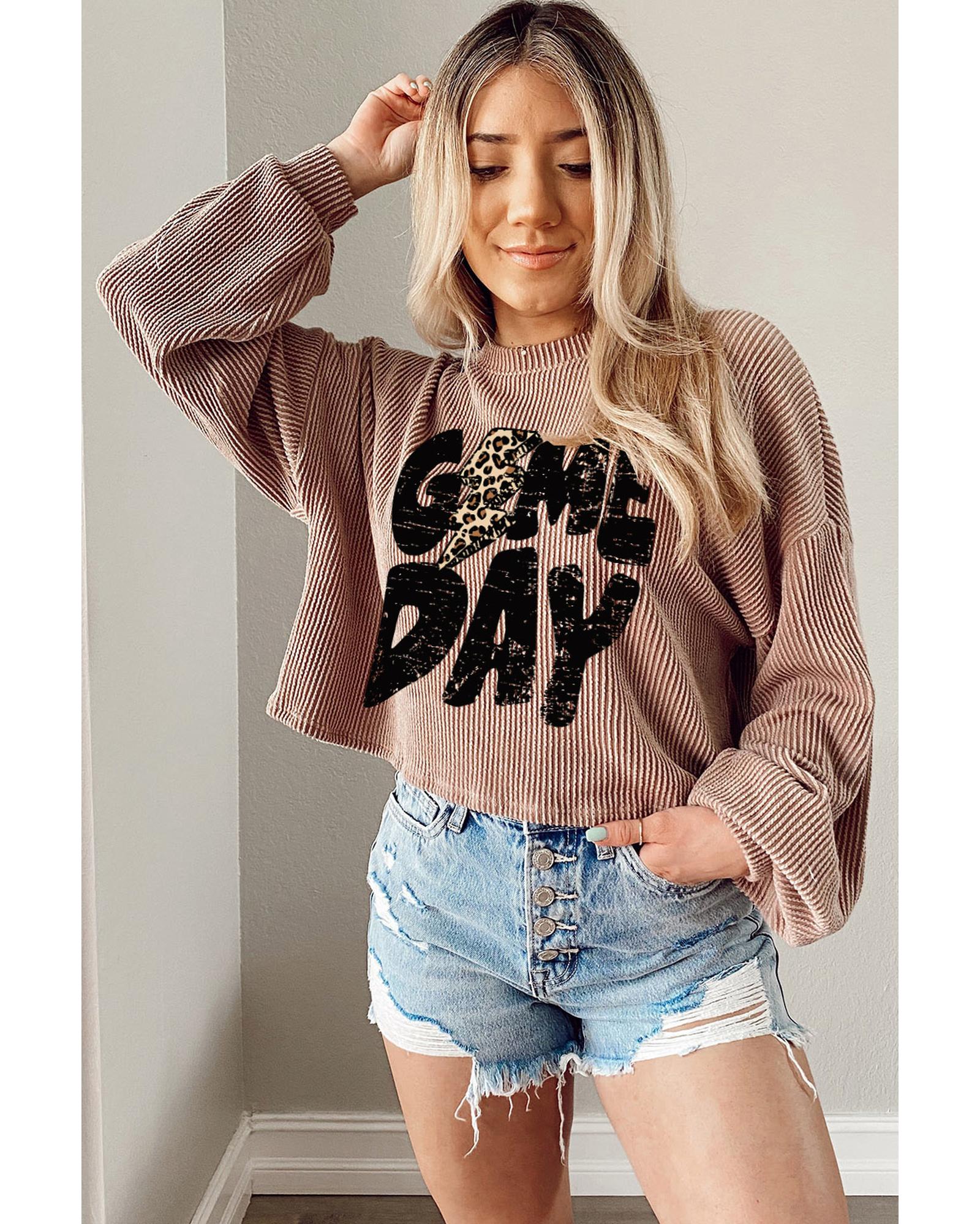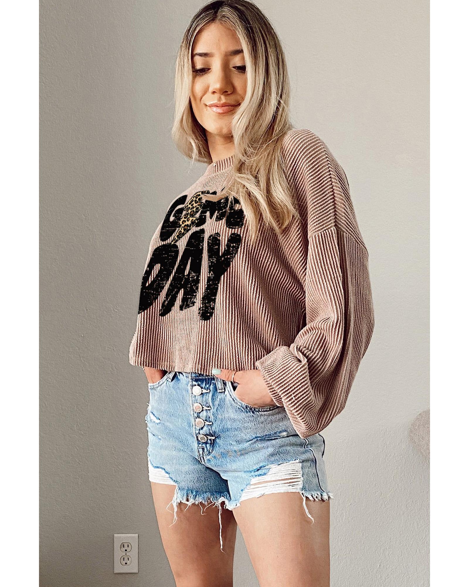 - Khaki Game Day Graphic Crop Rugby Football Corded Knit Top
