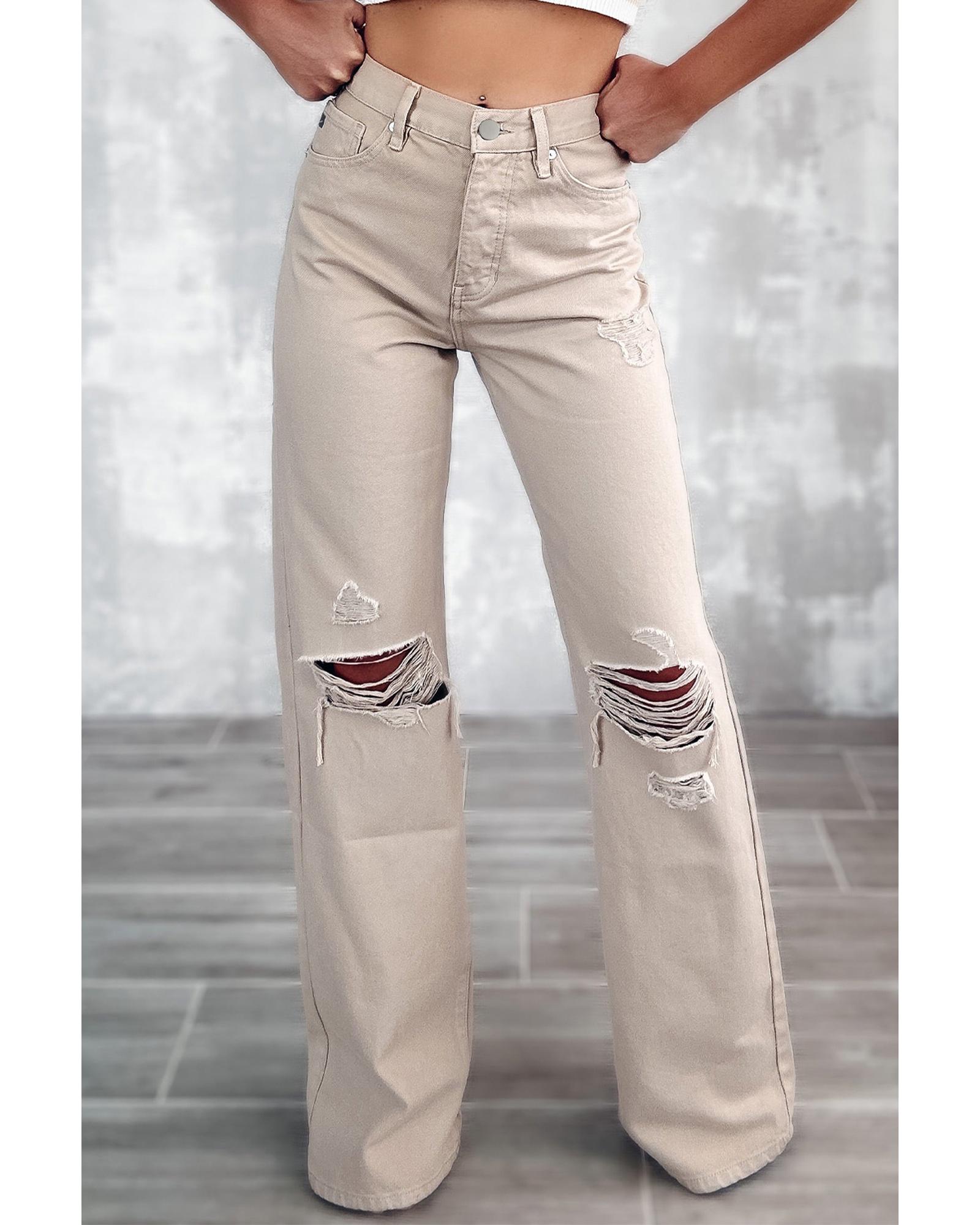 Khaki High Waist Ripped Wide-Leg Jeans - 12 US