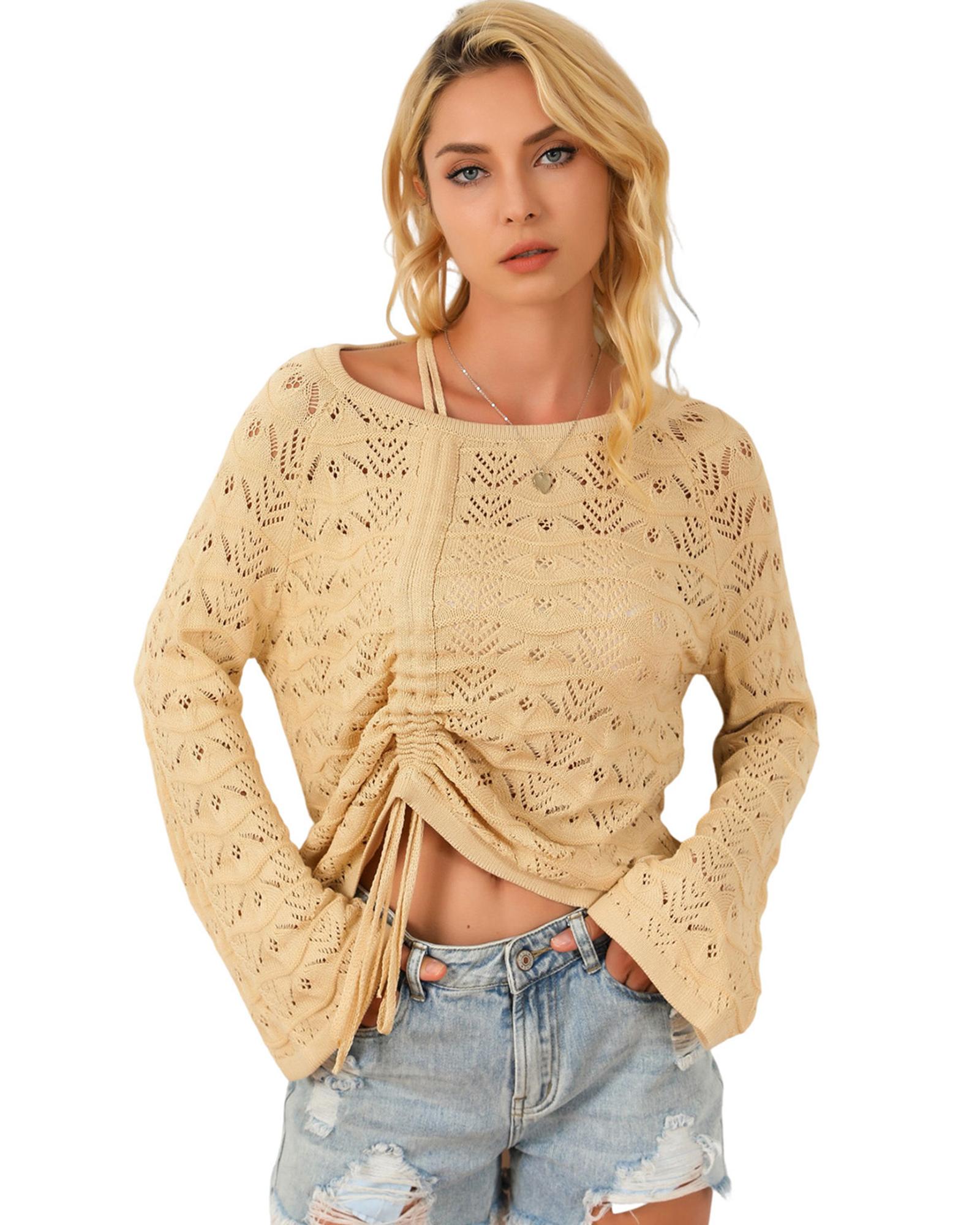Khaki Hollowed Knit Asymmetric Drawstring Sweater – S