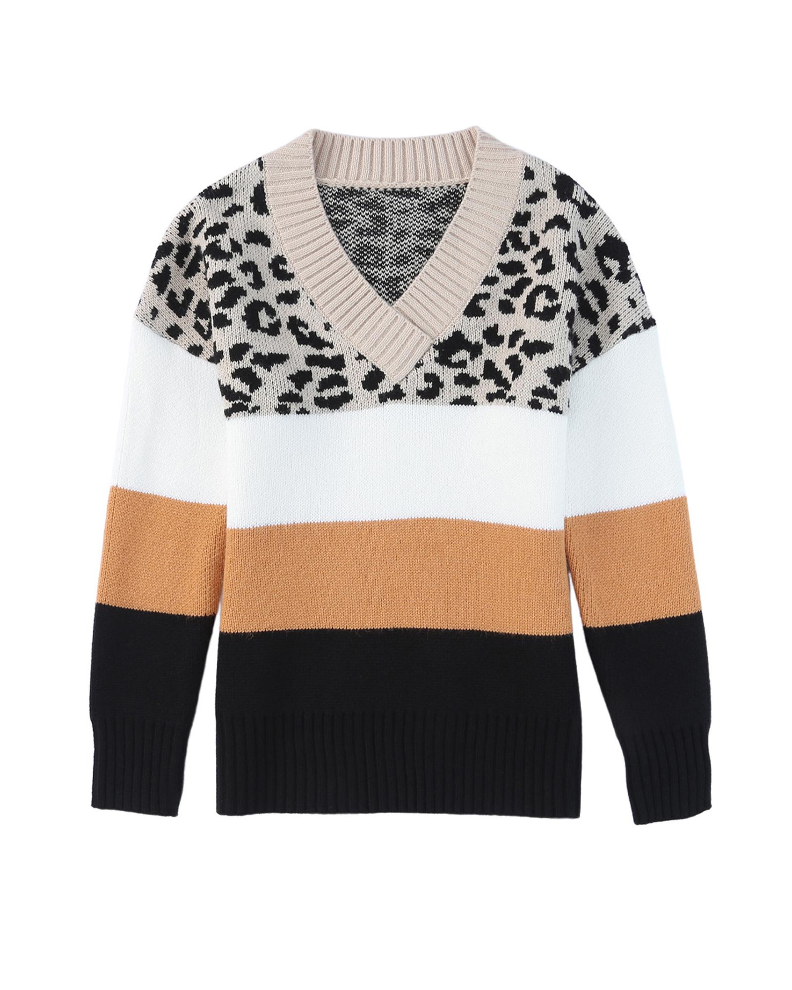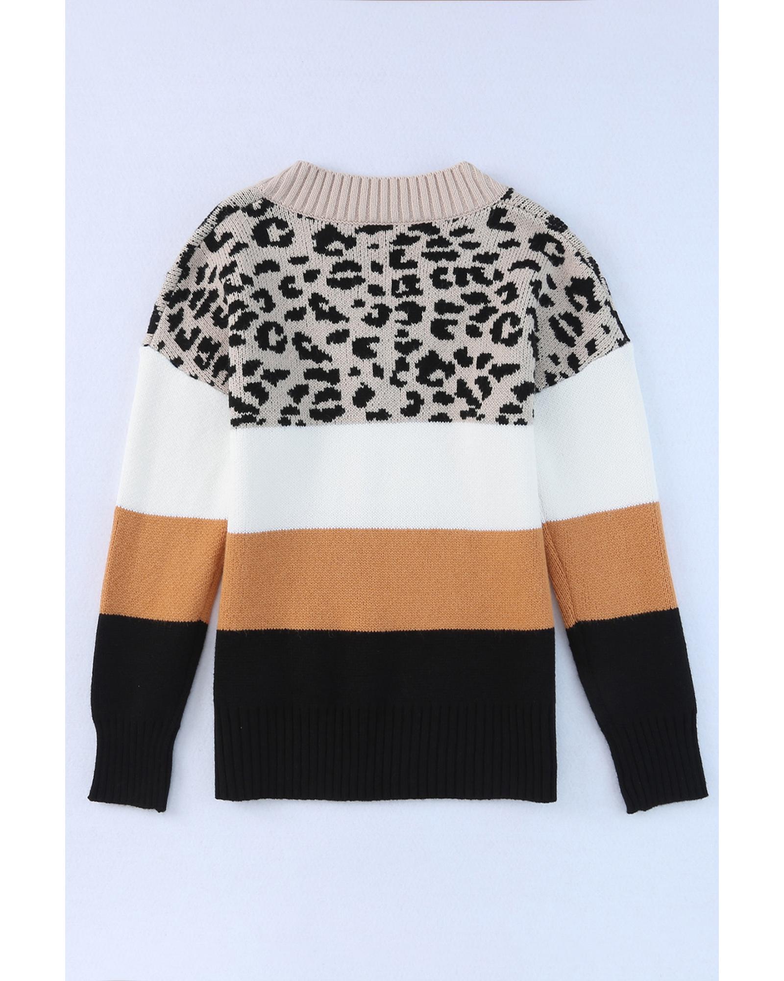 Khaki Leopard Color Block Long Sleeve Sweater – L
