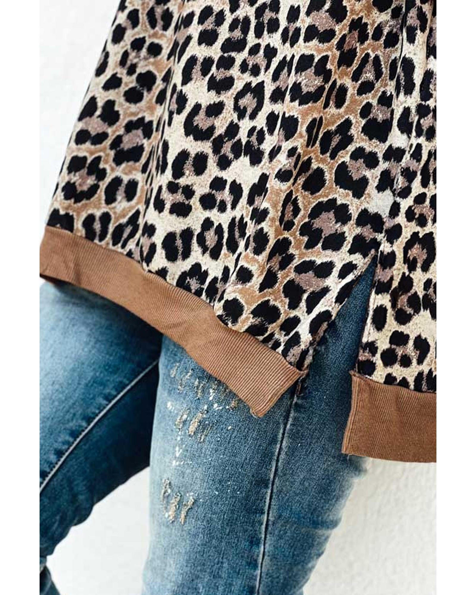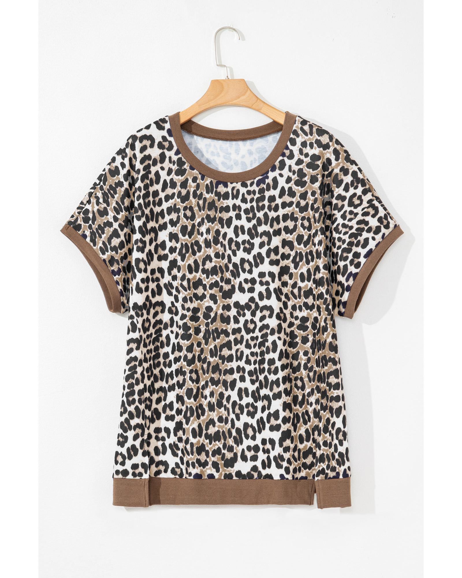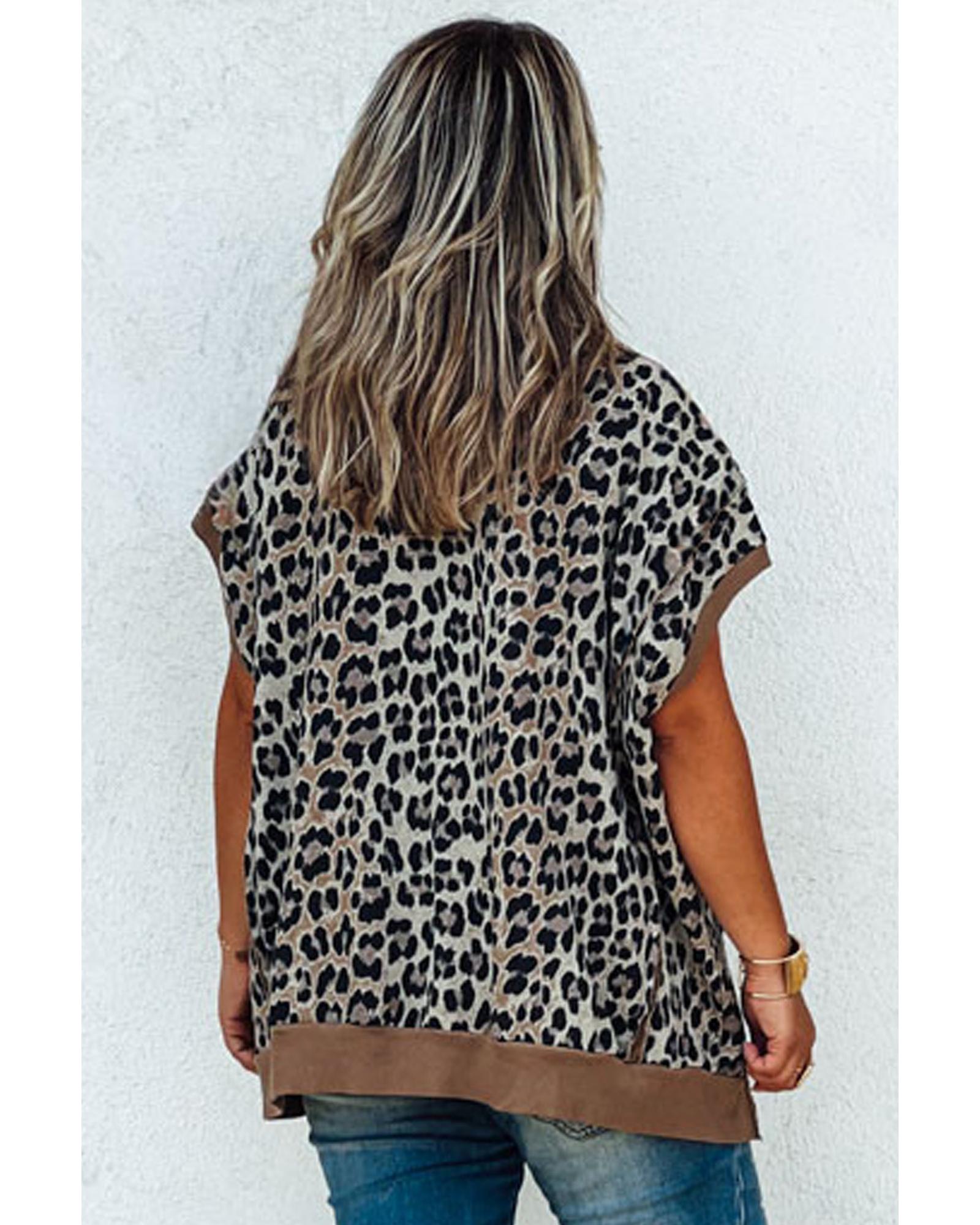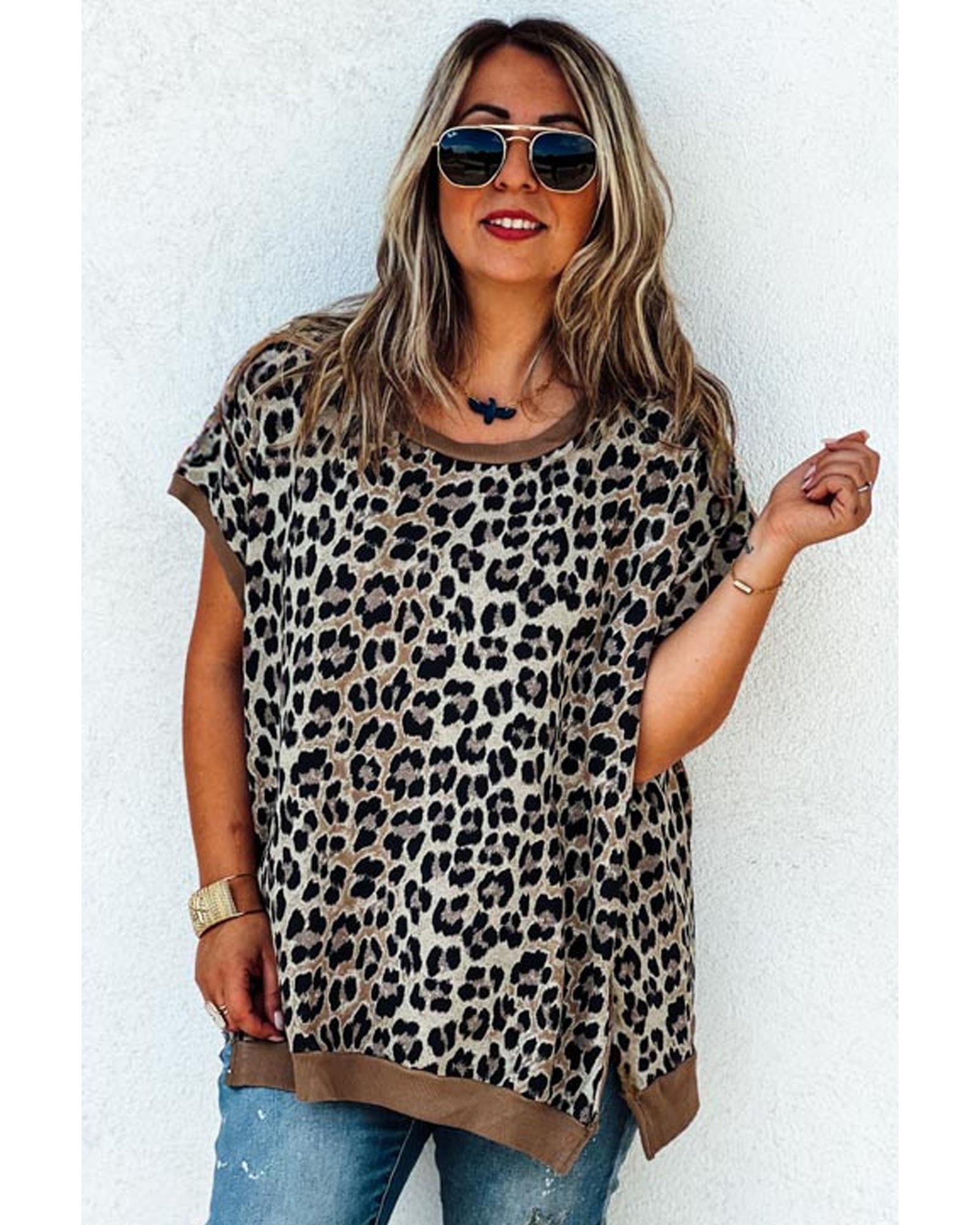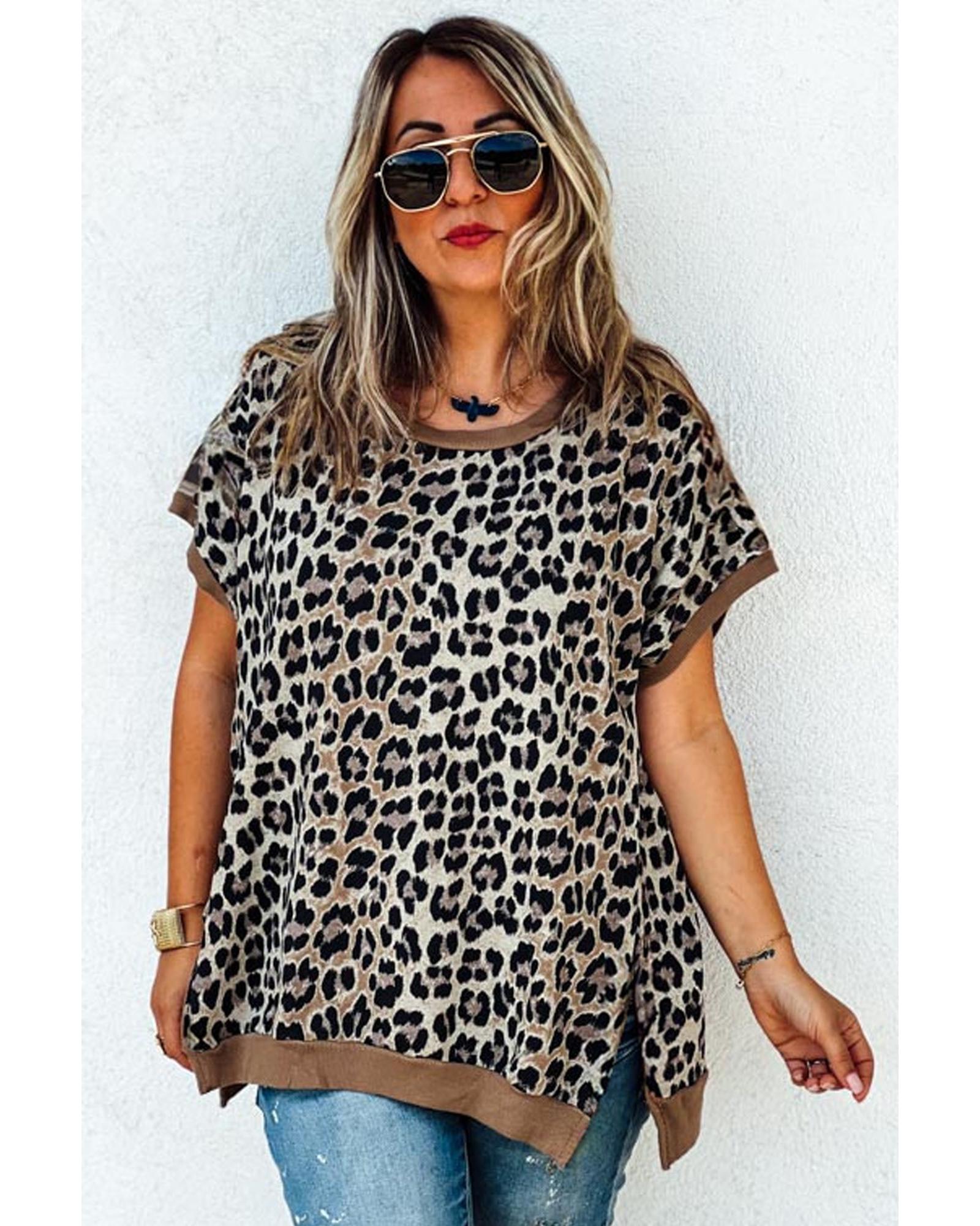 Khaki Leopard Contrast Trim Short Sleeve Loose Plus Size Top – 3X