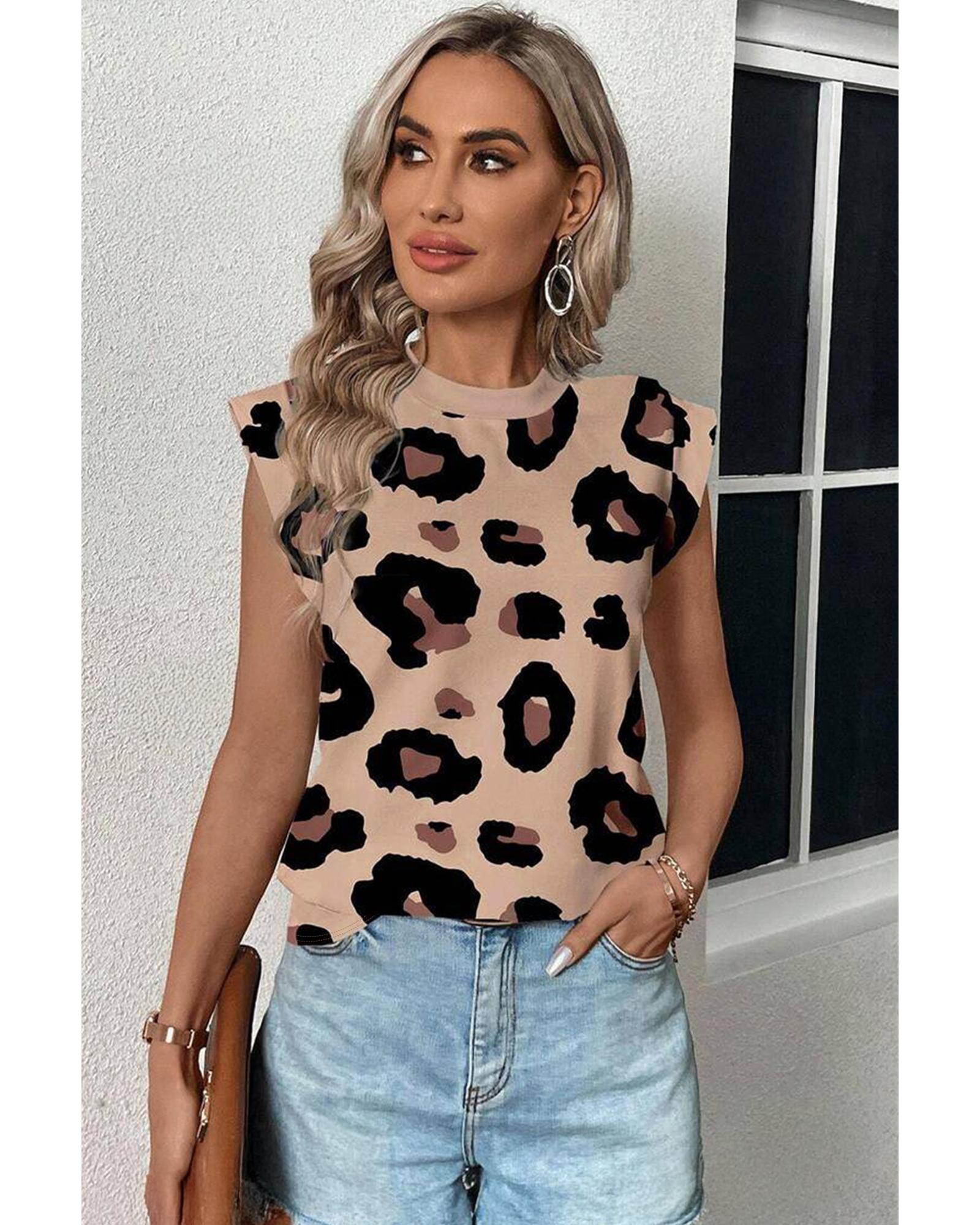 - Khaki Leopard Crew Neck Cap Sleeve Casual Tee