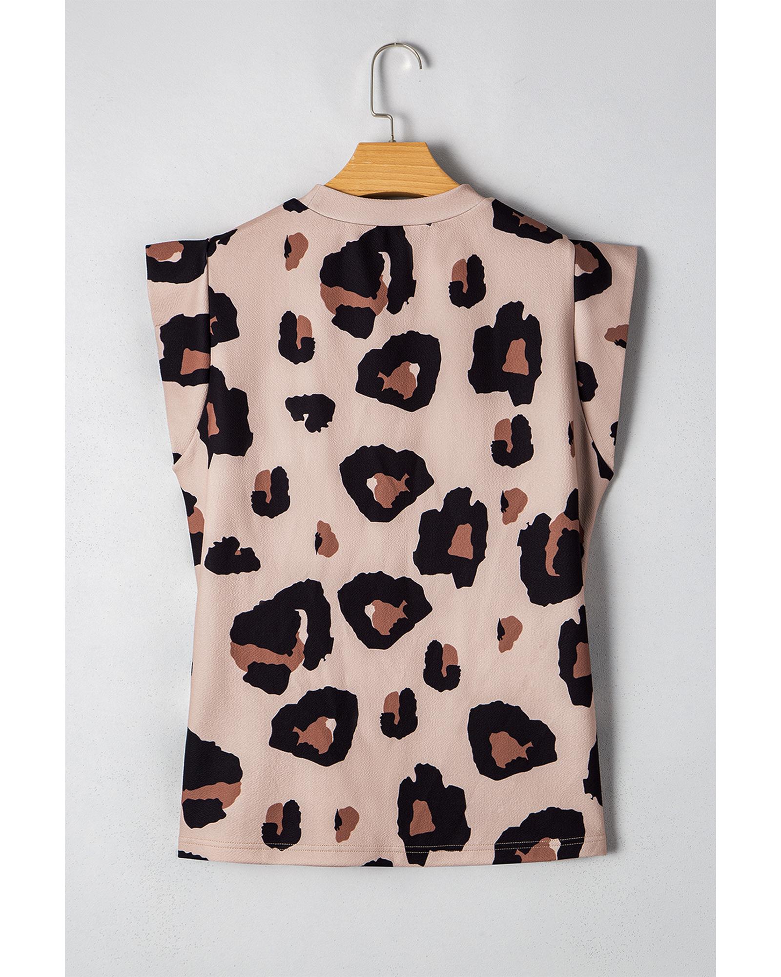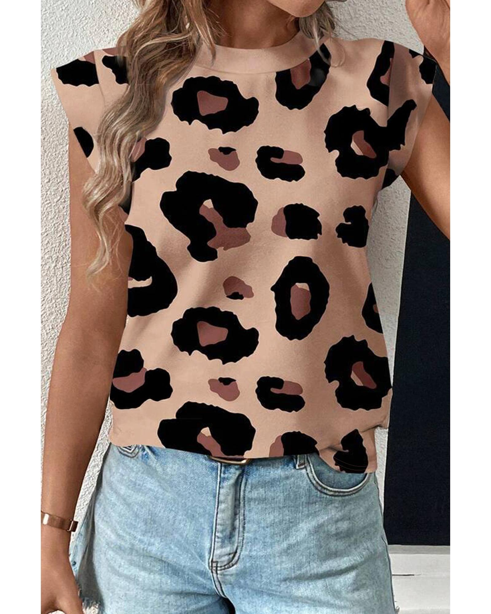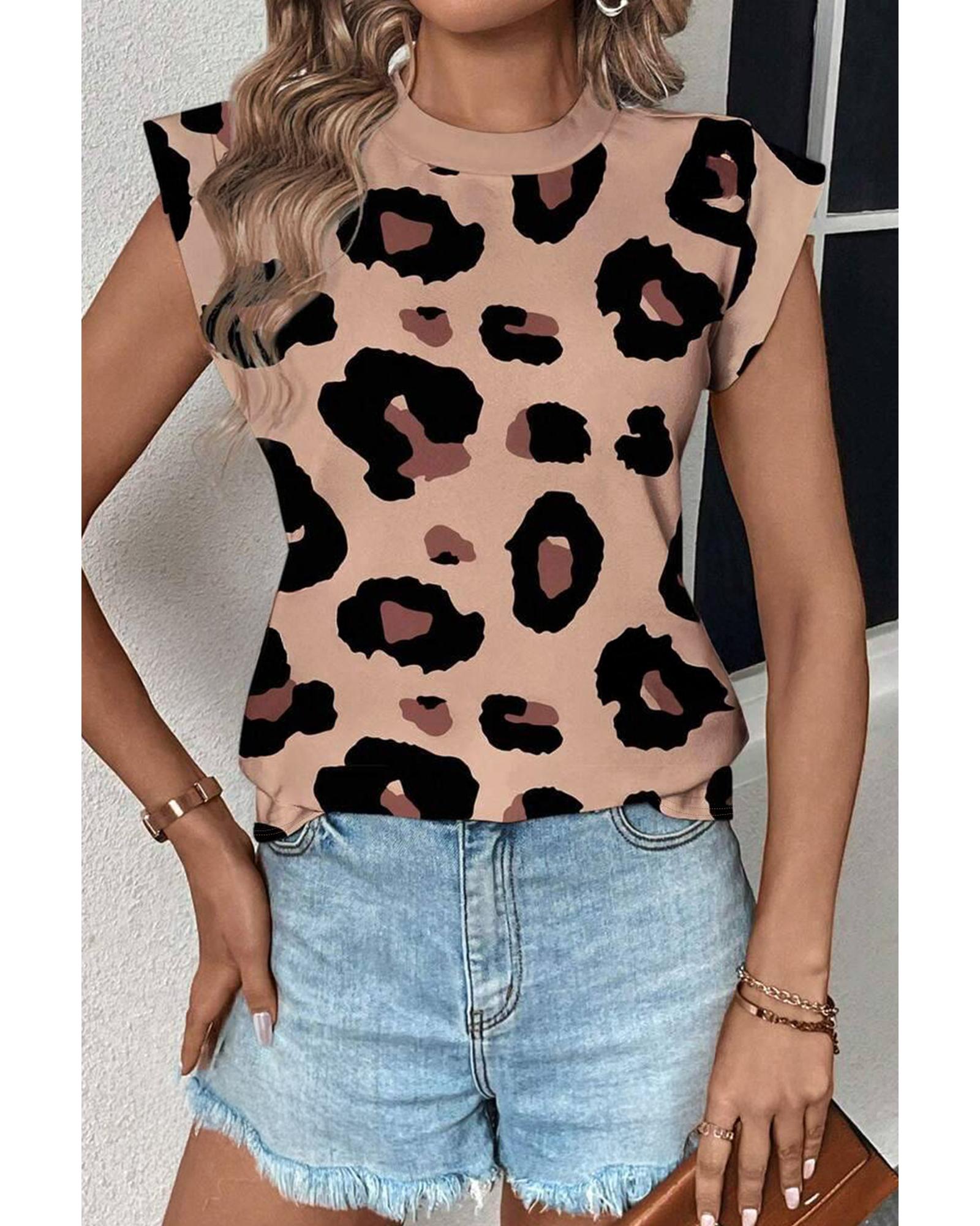 • Khaki Leopard Crew Neck Cap Sleeve Casual Tee