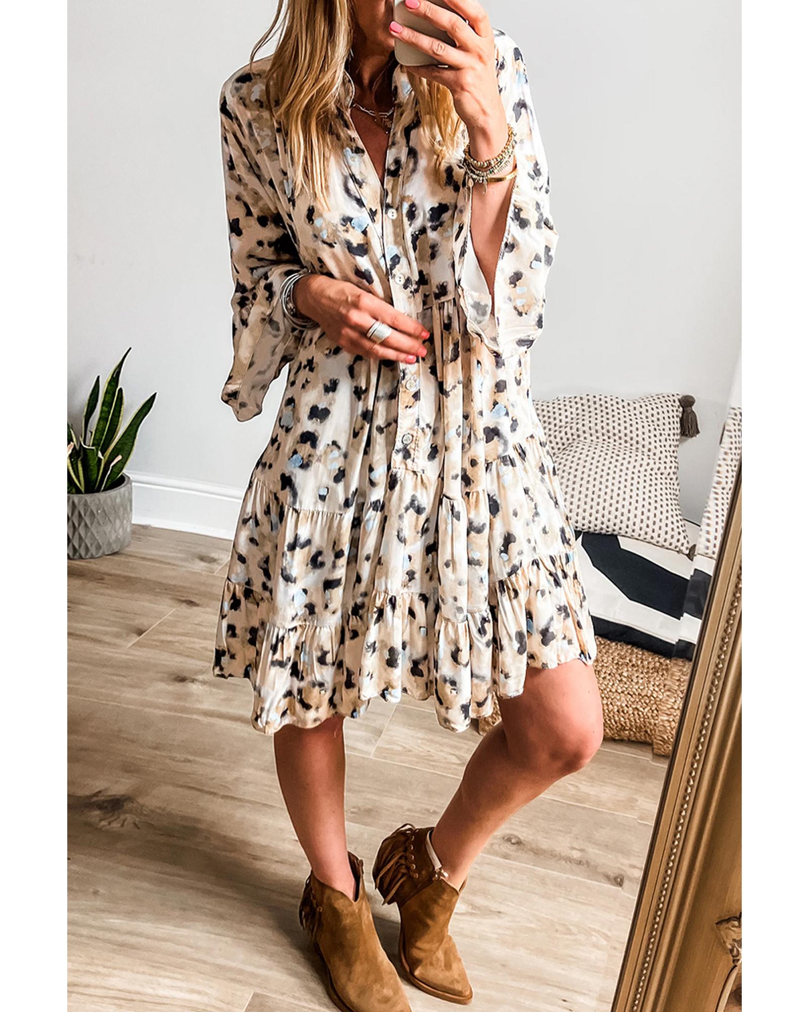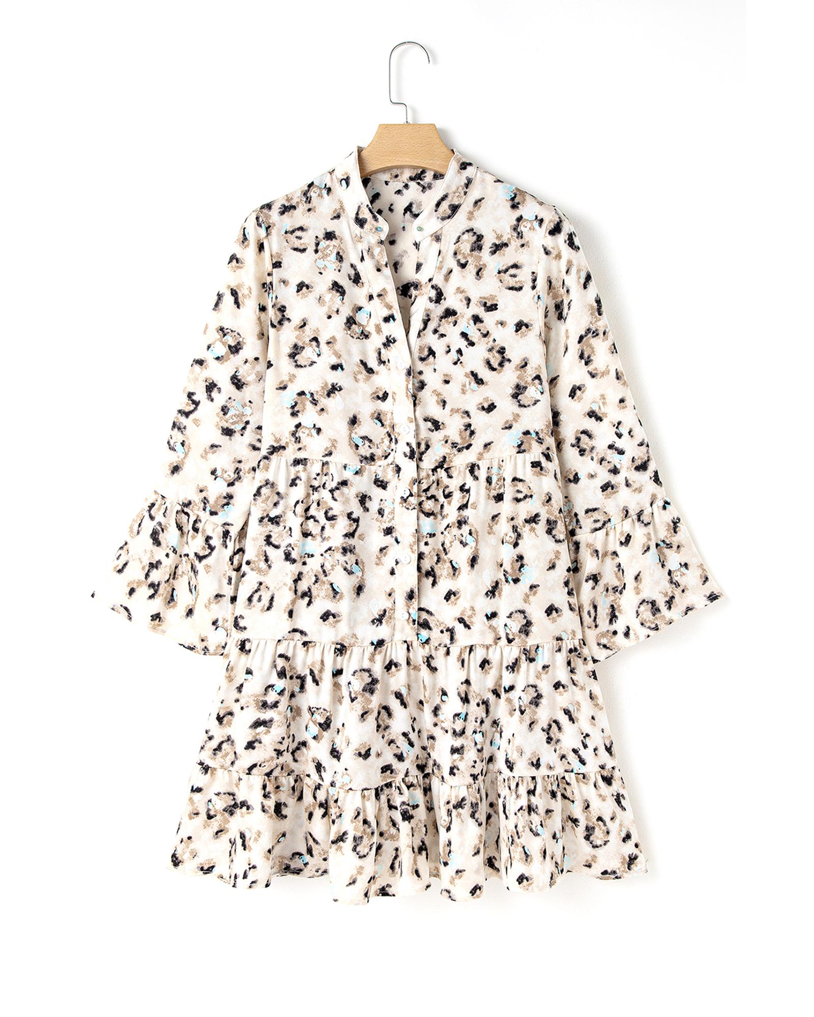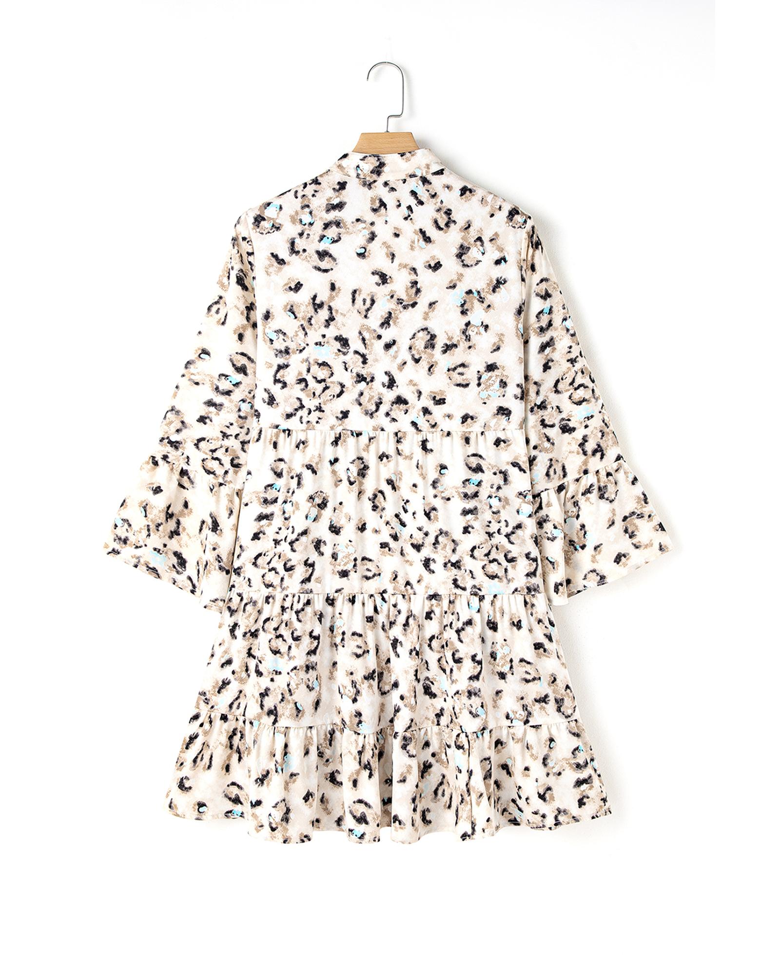 Khaki Leopard Print Buttoned Front 3/4 Sleeve Tiered Ruffled Hem Dress – 2XL