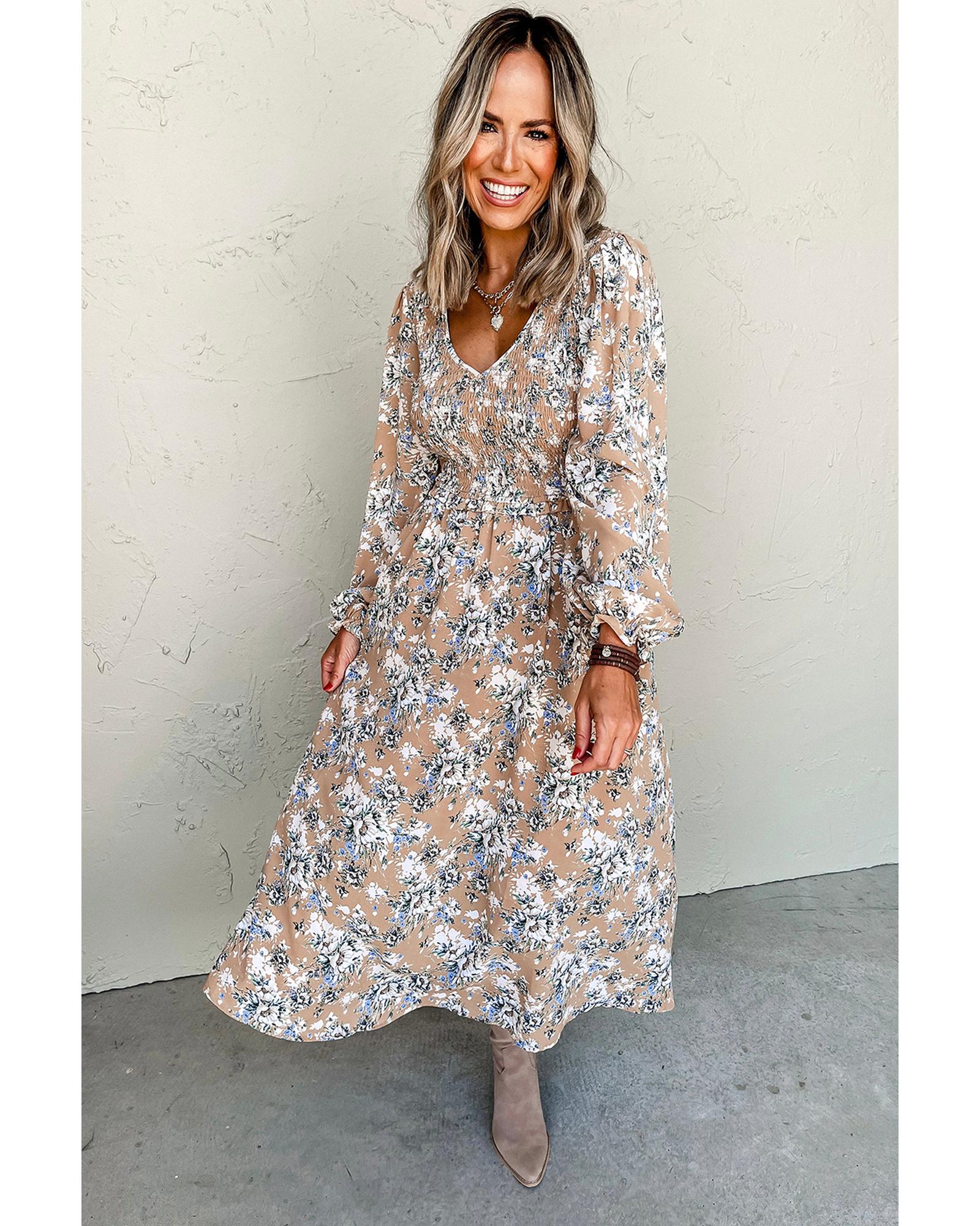 - Khaki Maple Grove Floral Smocked Puff Sleeve Long Dress