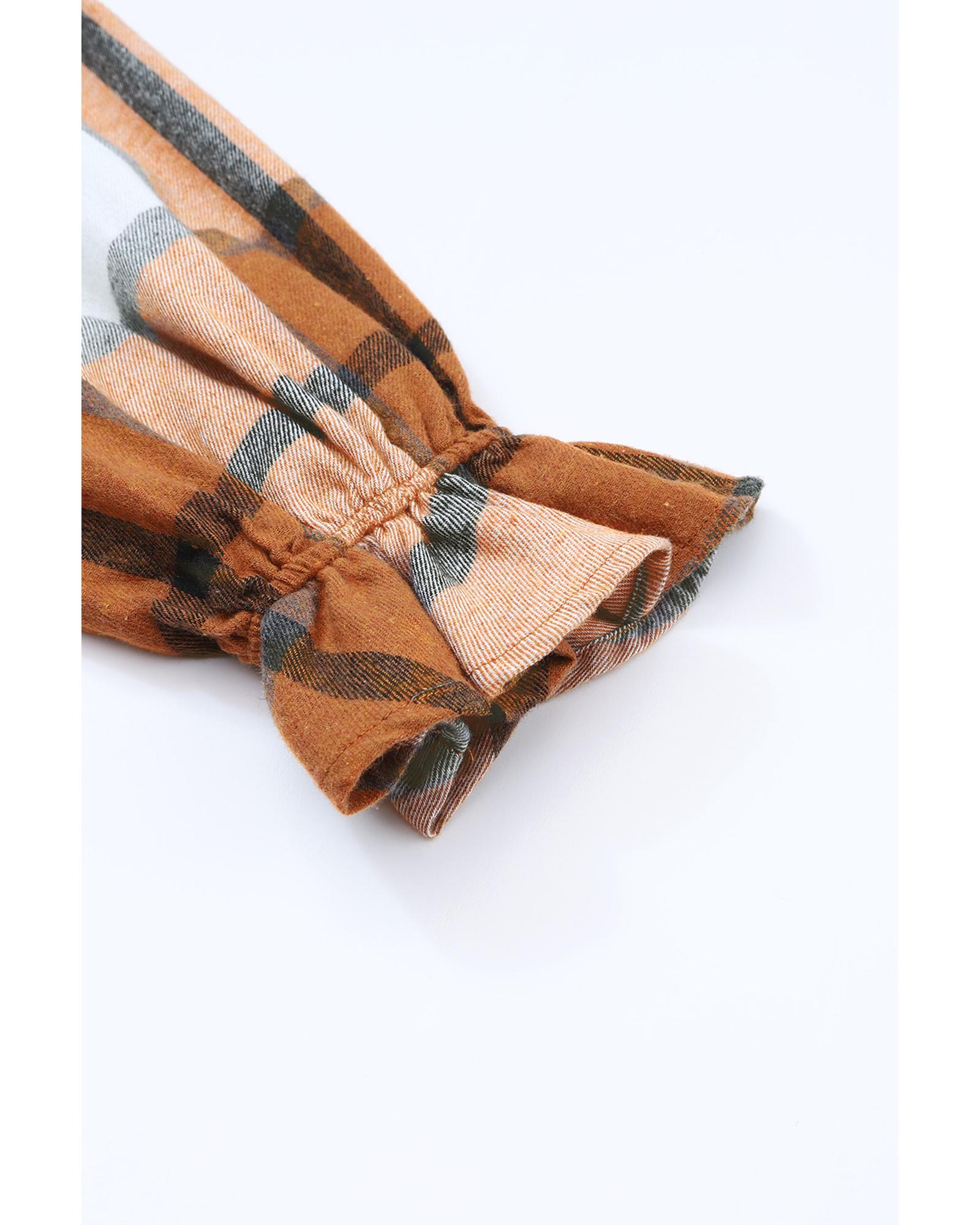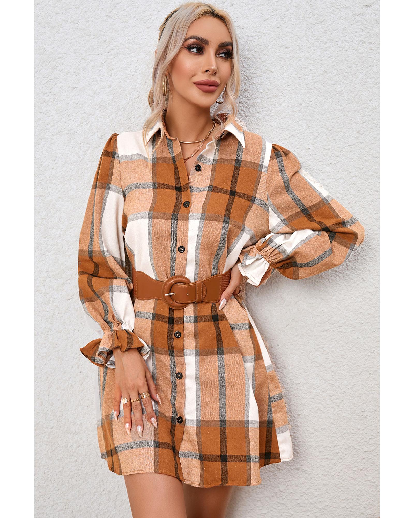 Khaki Plaid Pattern Collared Neck Ruffled Sleeve Shirt Dress – L