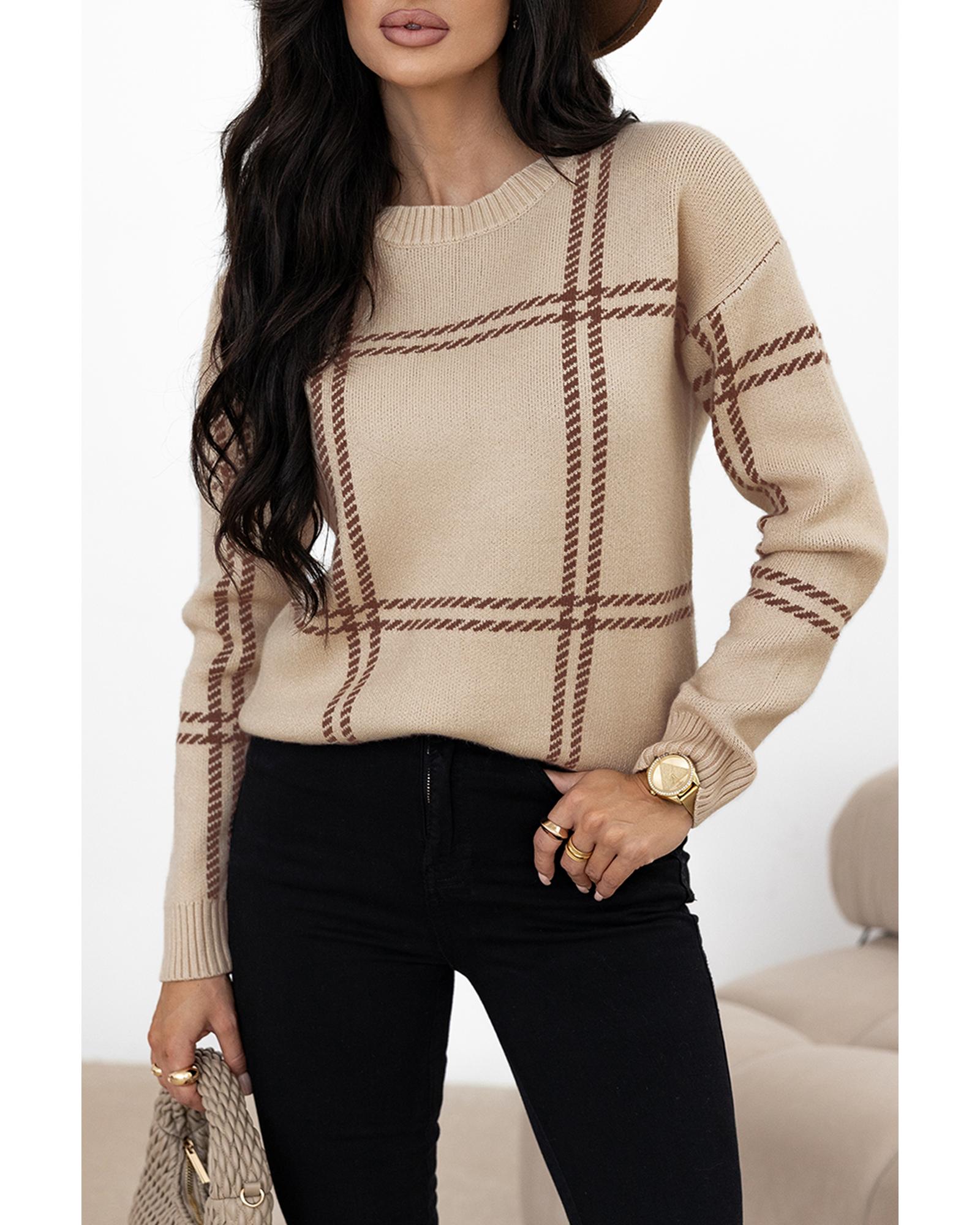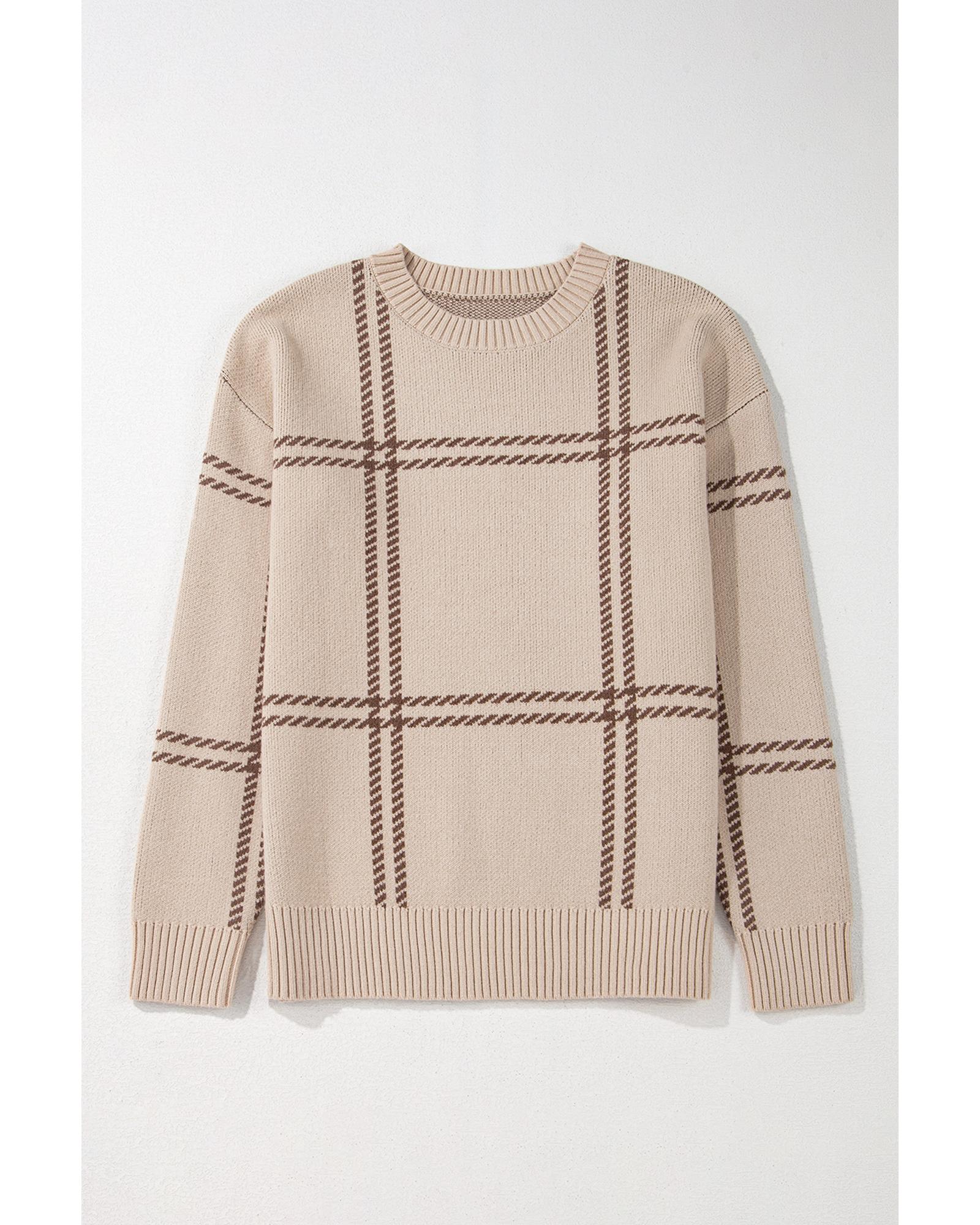 Khaki Plaid Pattern Knitted Drop Shoulder Sweater – XL