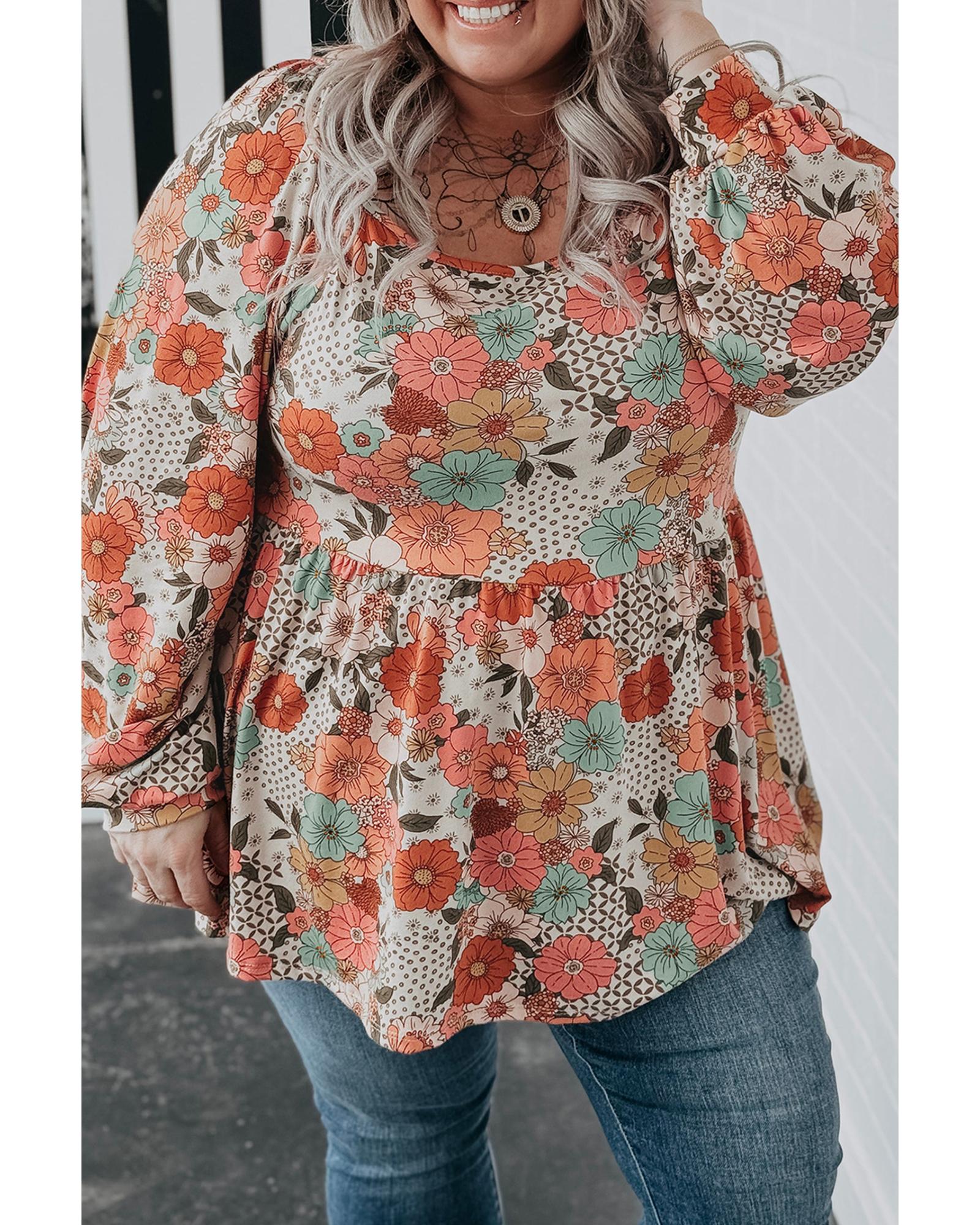 Khaki Plus Size Flower Print Square Neck Peplum Blouse – 3X