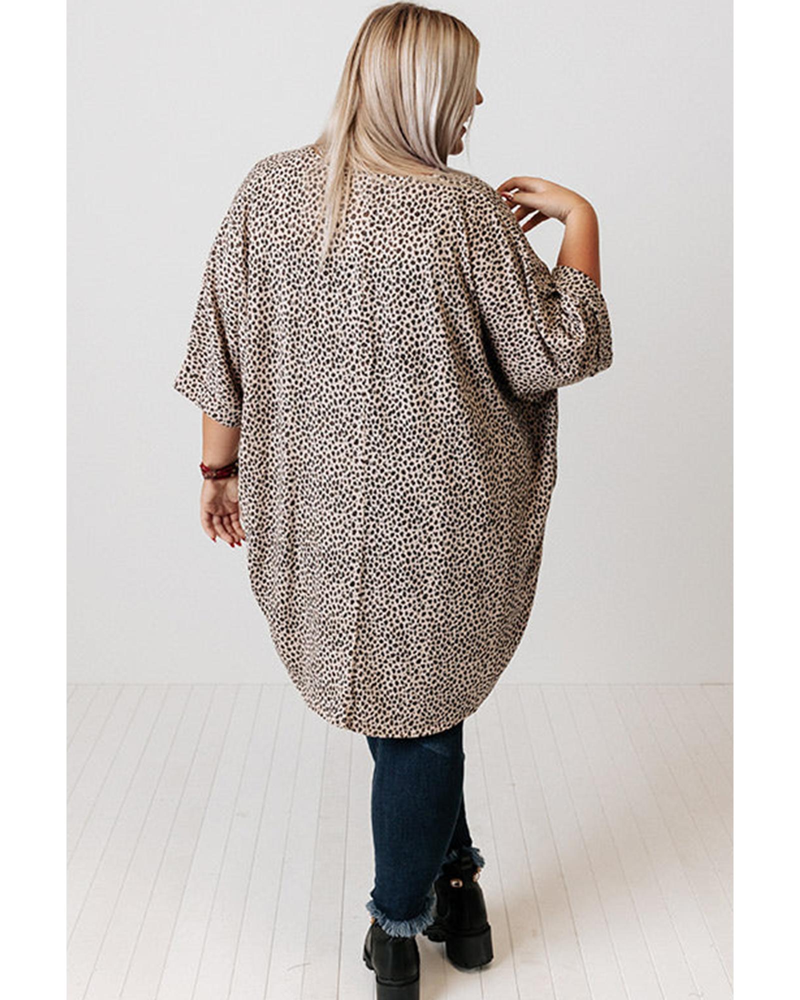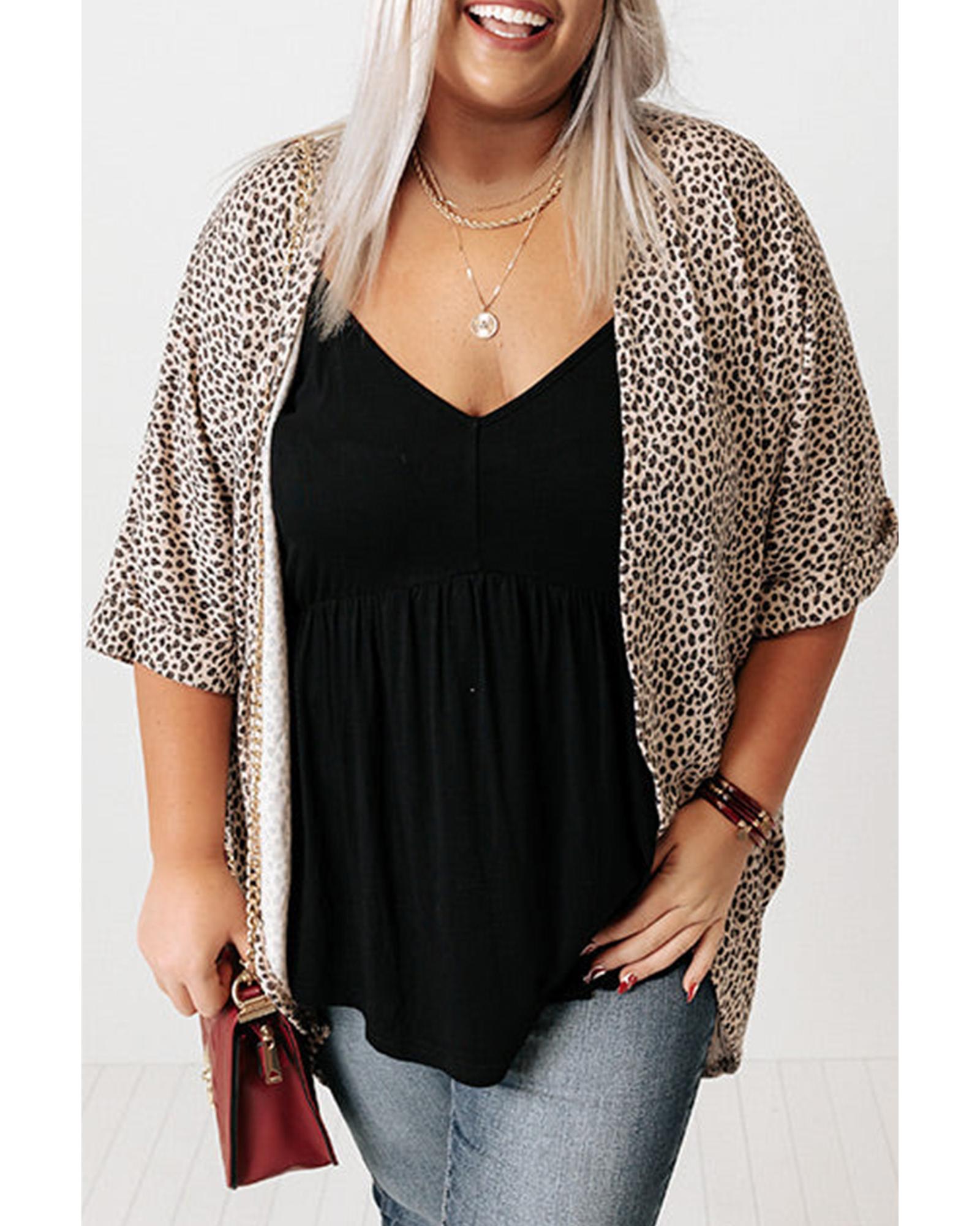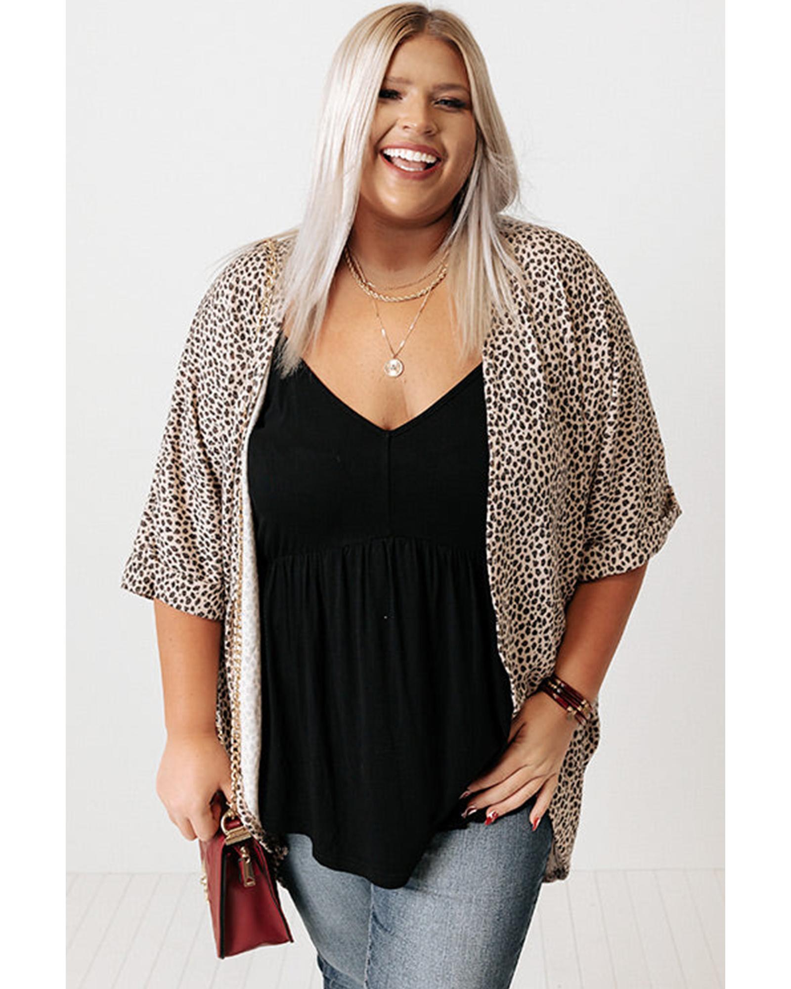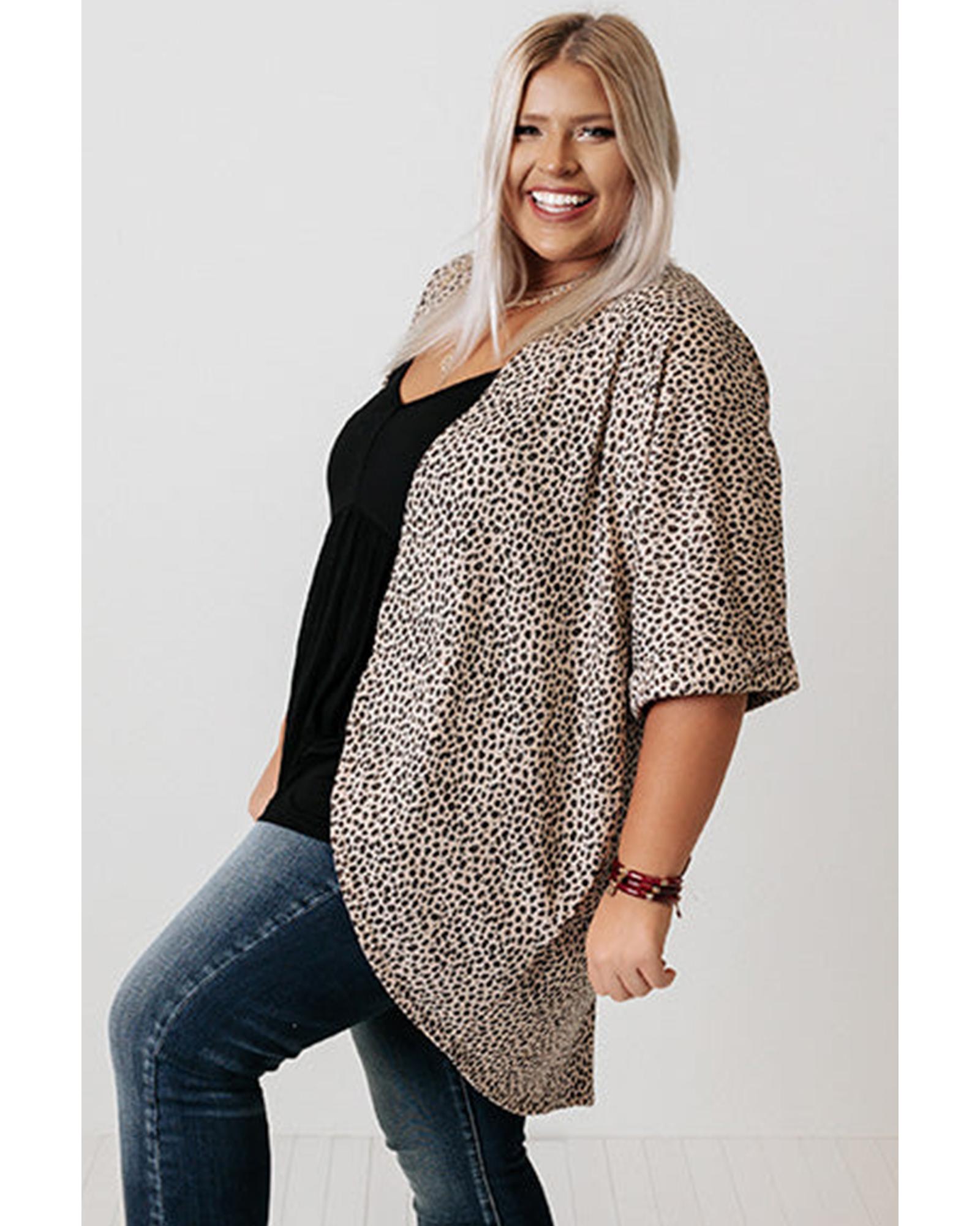 Khaki Plus Size Leopard Print Half Sleeve Open Front Cardigan – 1X