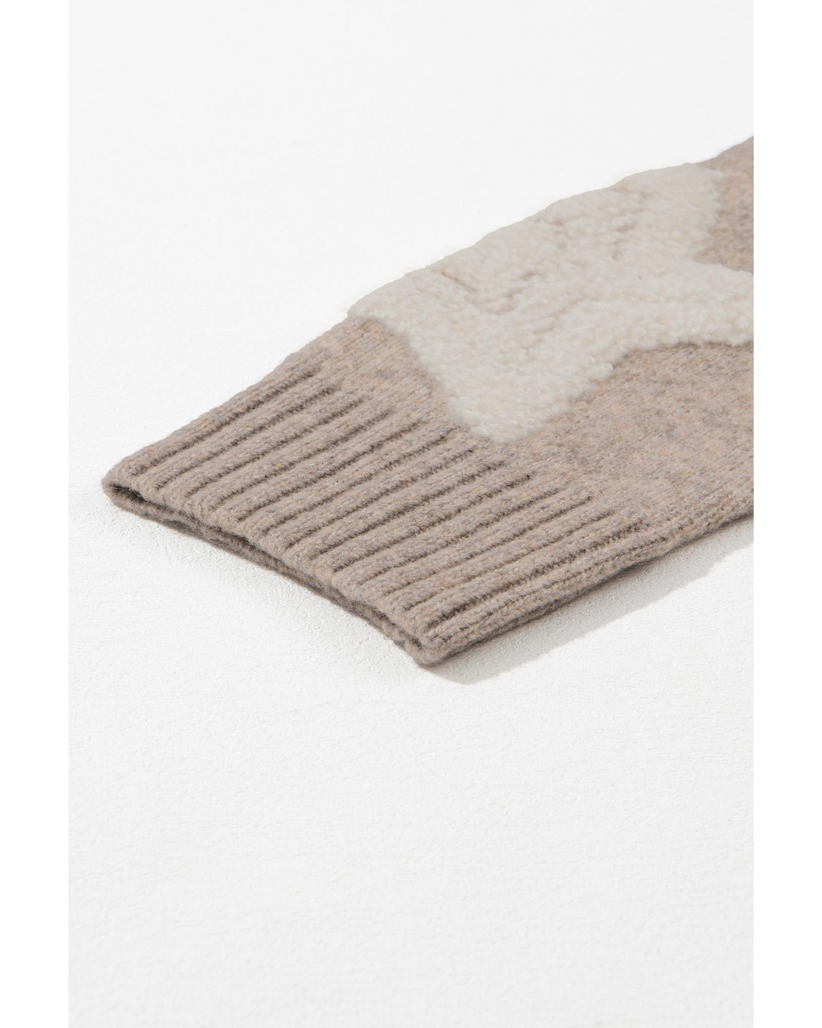 Khaki Sherpa Star Pattern Textured Sweater Cardigan with Pockets – S
