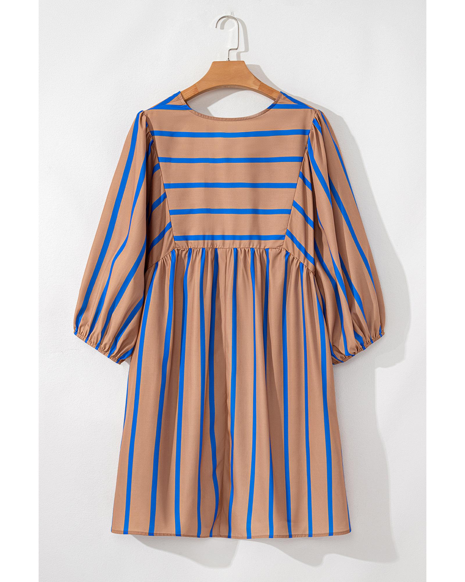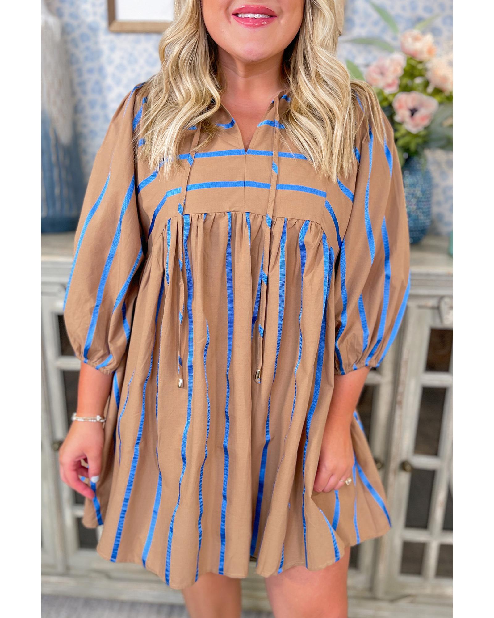 Khaki Stripe Contrast Striped Print 3/4 Sleeve Babydoll Plus Size Dress – 2X