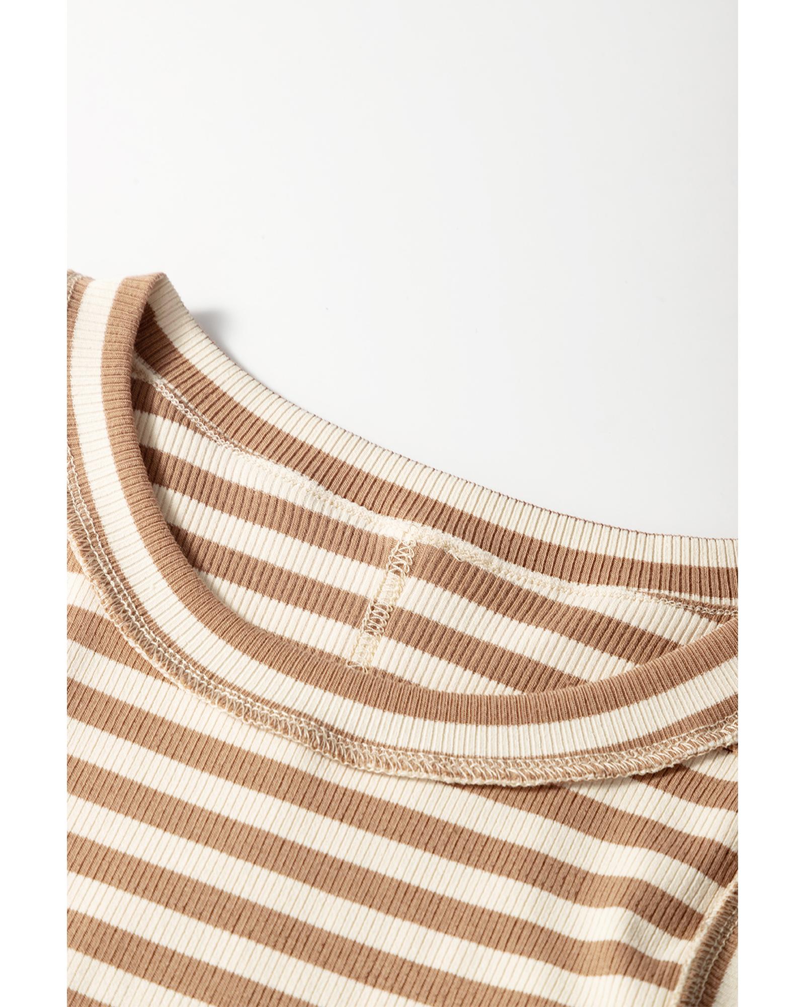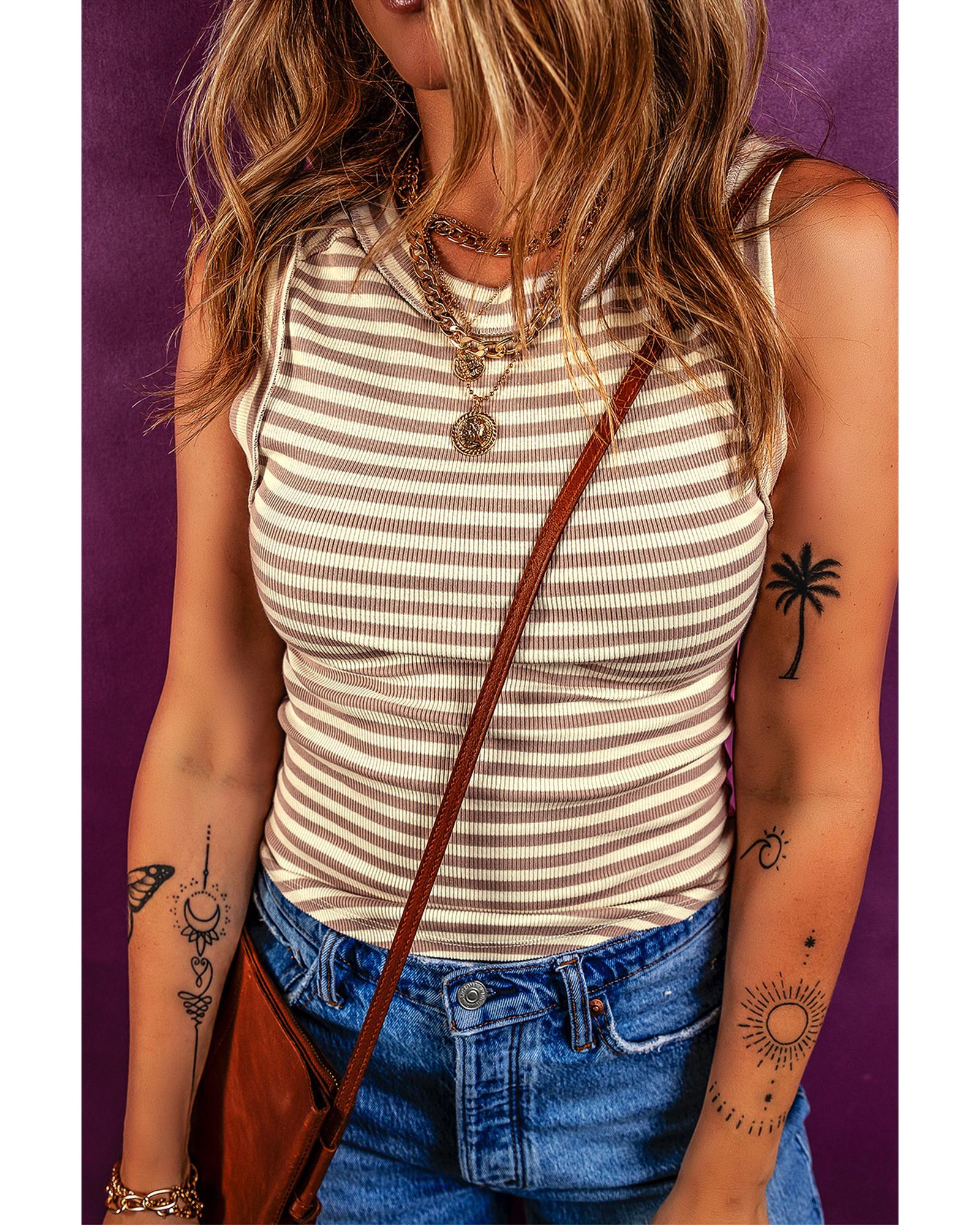 Khaki Stripe Exposed Seam Trim Round Neck Sleeveless Top – L