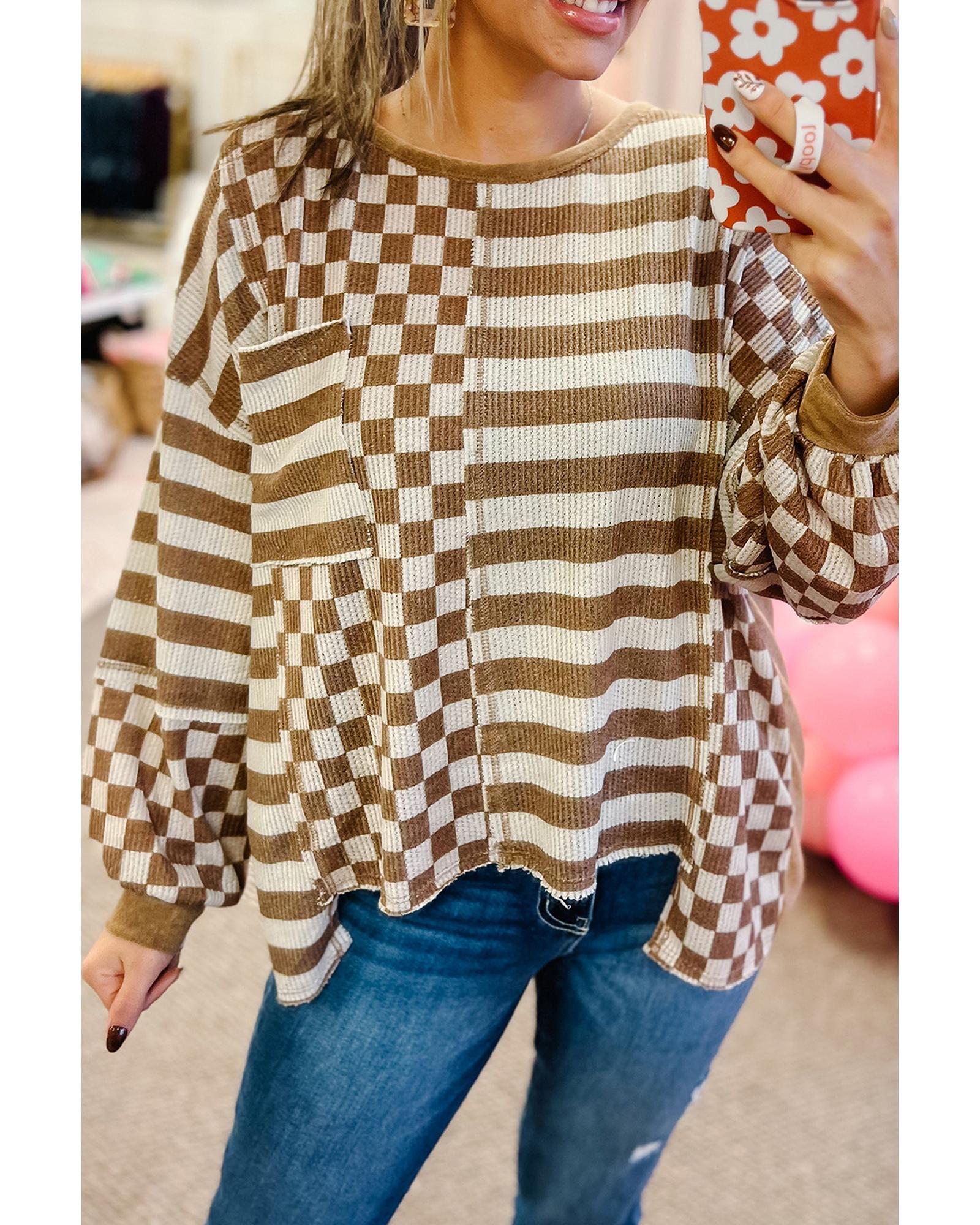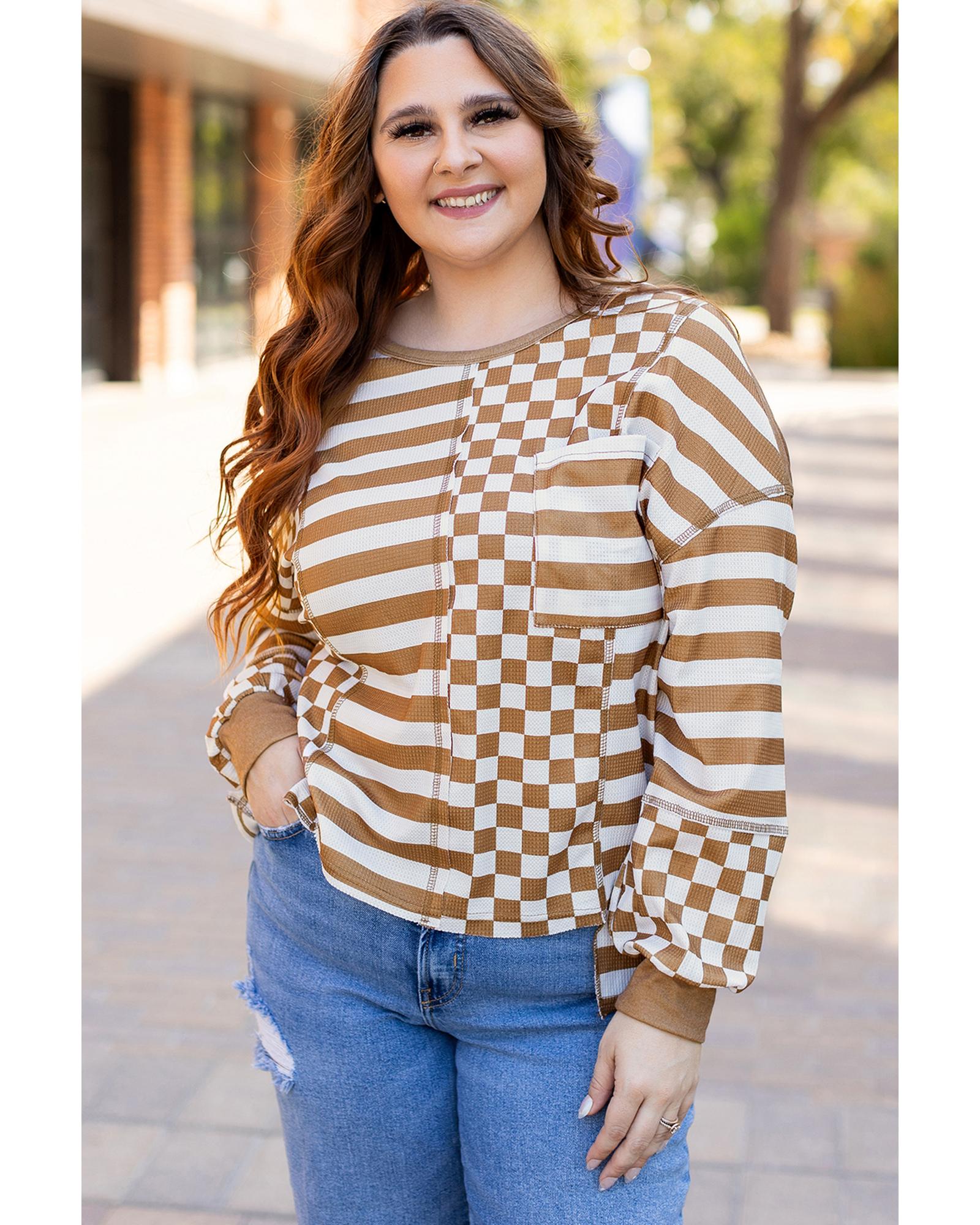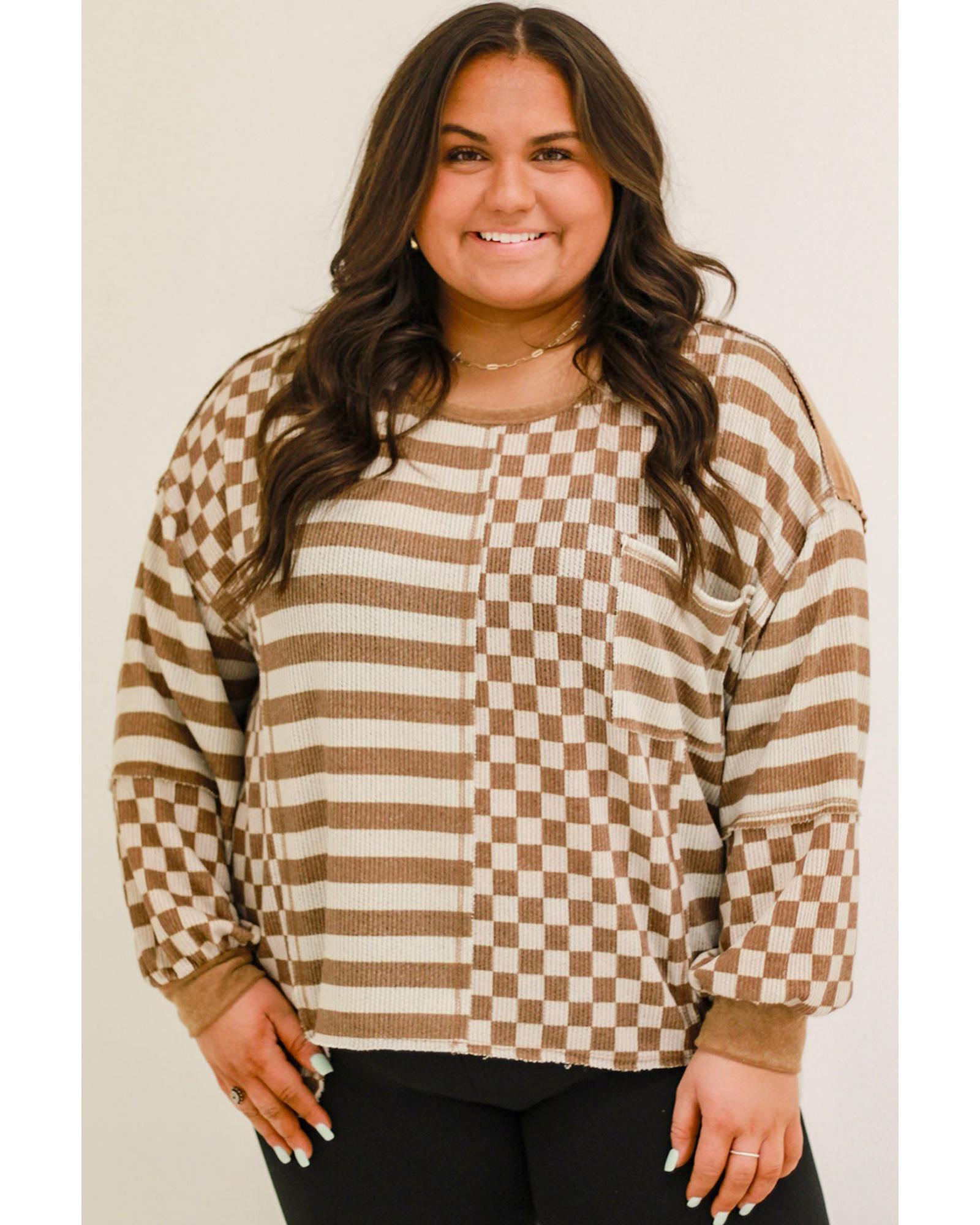 Khaki Striped Checkered Mixed Print Chest Pocket Casual Plus Size Top – 1X
