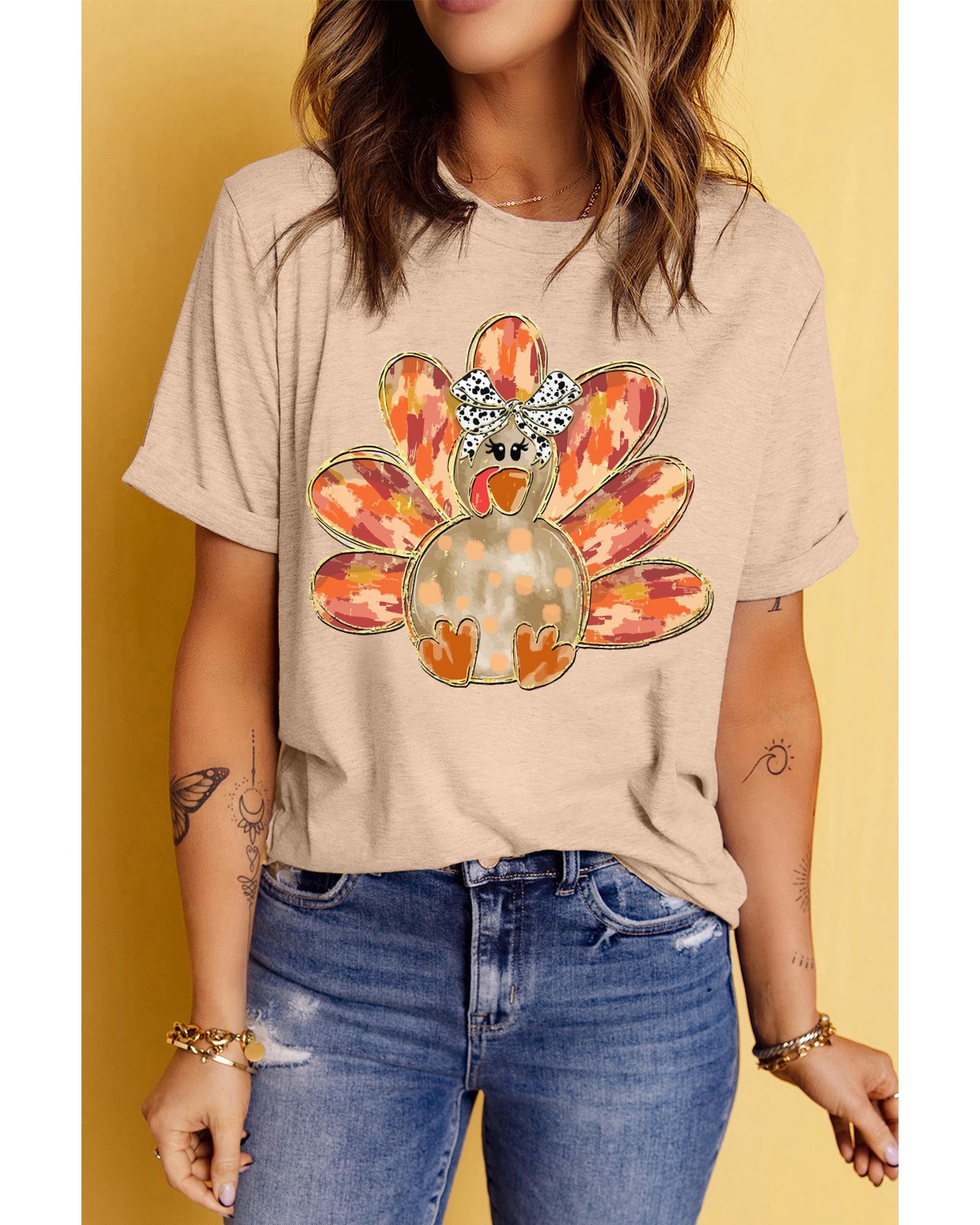 Khaki Thanksgiving Bowknot Turkey Graphic Crewneck Tee – M