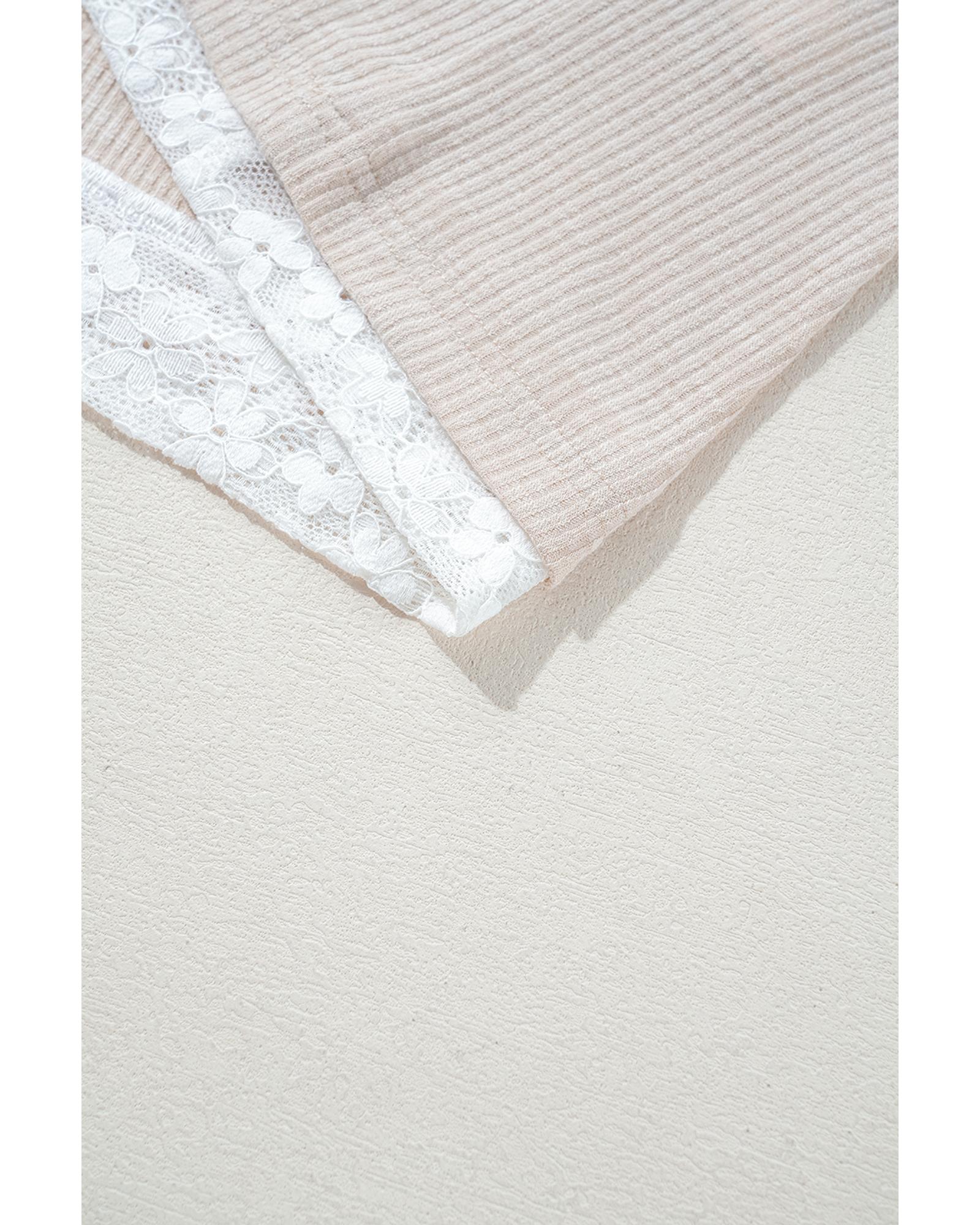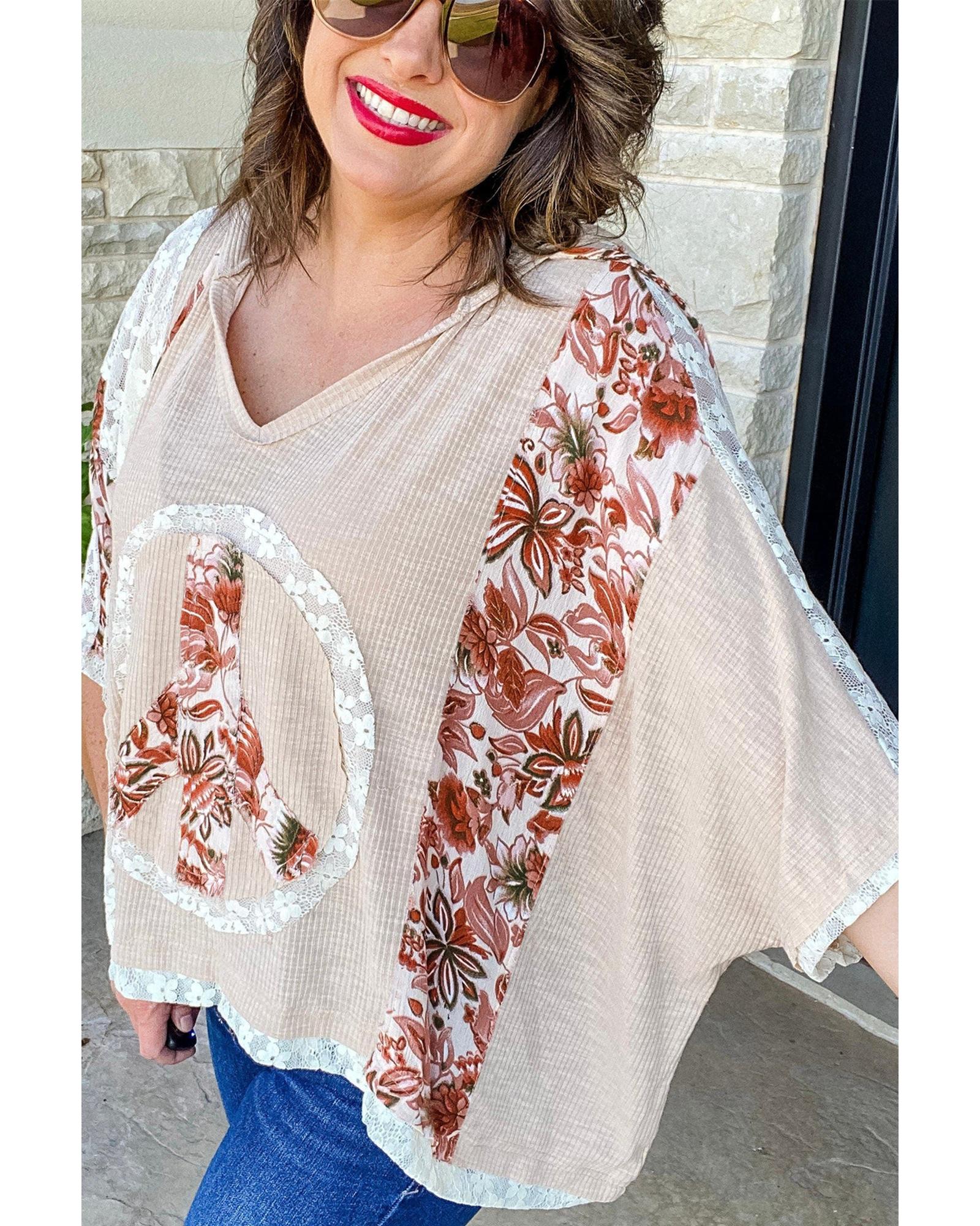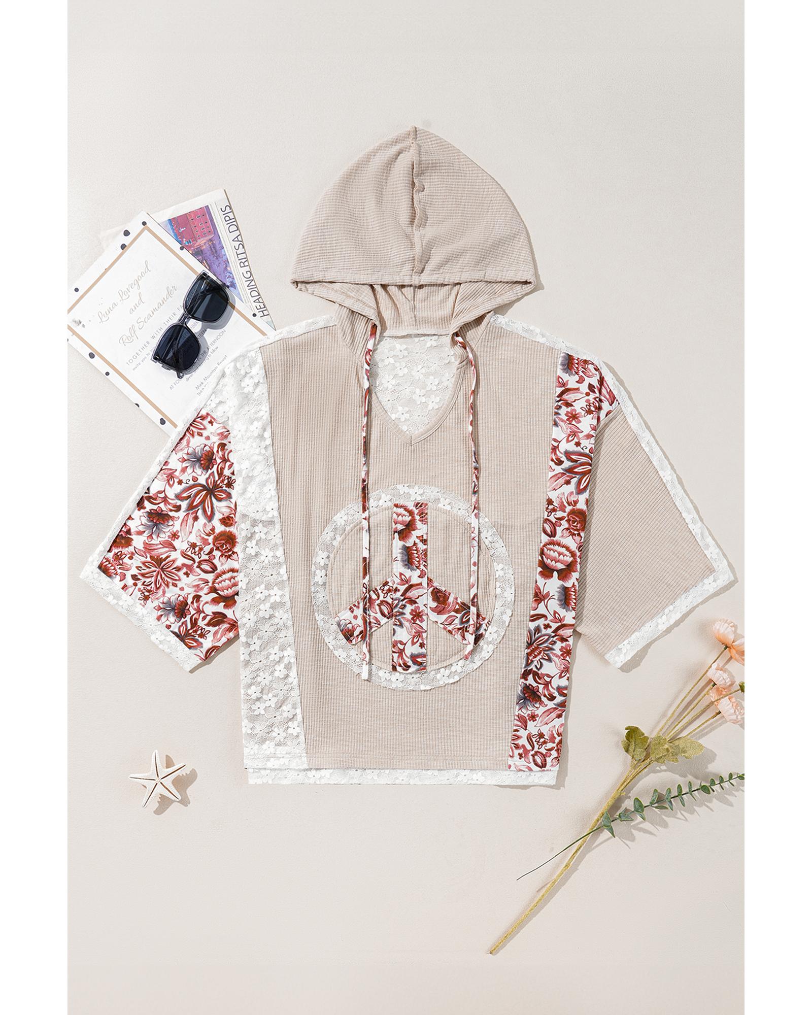 Khaki V Neck Floral Peace Sign Graphic Lace Patch Ribbed Plus Size Hooded Top – 4X