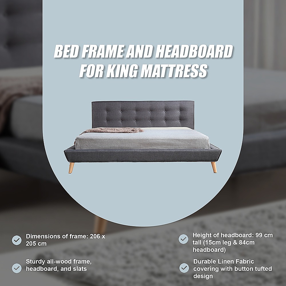An exceptionally sturdy all-wood frame and support slats provide a rock-solid foundation for your mattress that will surely lead to many restful nights. The Linen Fabric covering is similarly durable, not to mention easy to clean. The frame is designed to accommodate standard King-sized mattresses with dimensions of 183 x 203 cm (mattress and linens not included). The headboard is 99 cm tall (15cm leg 84cm headboard) from top to bottom, and the overall dimensions of the bed frame are 206 cm x 205 cm.