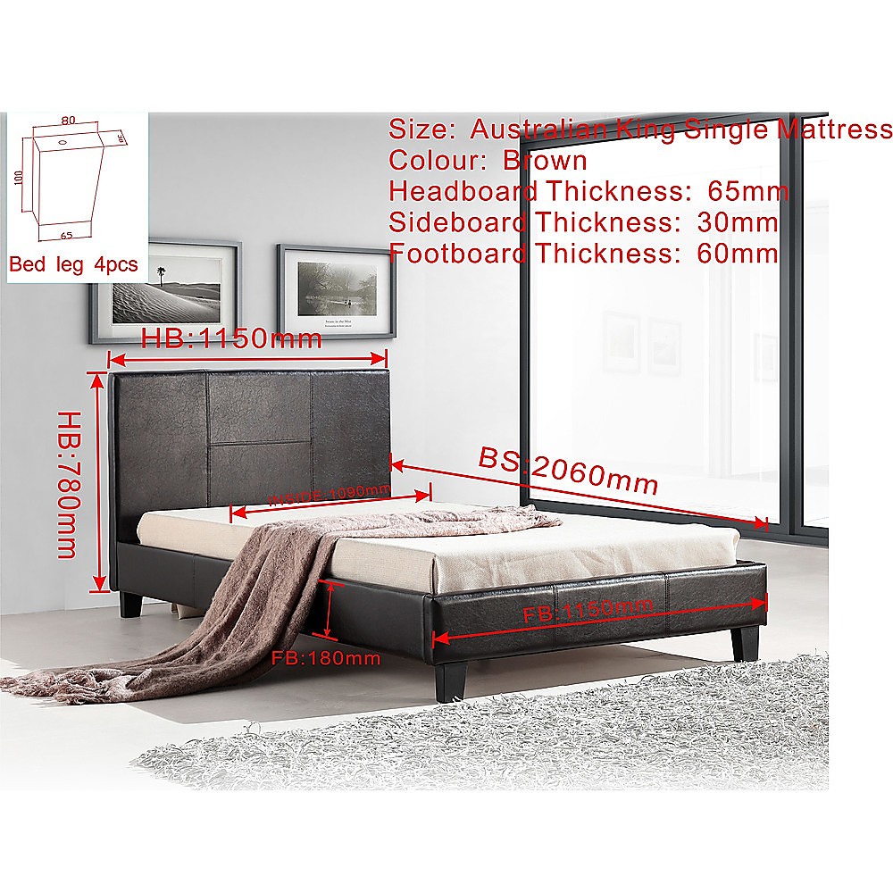 This bed from the expert craftspeople at Palermo measures 115 cm wide by 206 cm long, with a headboard that measures 88 cm tall (10cm leg 78cm headboard) from top to bottom. It fits a king single mattress measuring 106 x 203 cm. The frame and headboard feature a durable PU Leather covering that's easy to clean and that will look great for many years to come. The headboard is padded for comfort while sitting up and reading or watching TV. An attractive stitched-together look and clean, simple lines make this bed frame a perfect complement to the modern bedroom. And the brown colour adds visual appeal without being ostentatious.