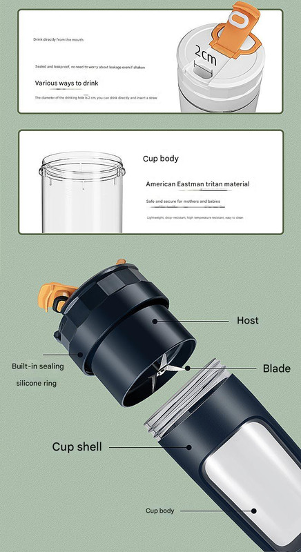 - Material: Cup Body – TRITAN, Outer Shell – ABS, Blade – 304 Stainless Steel