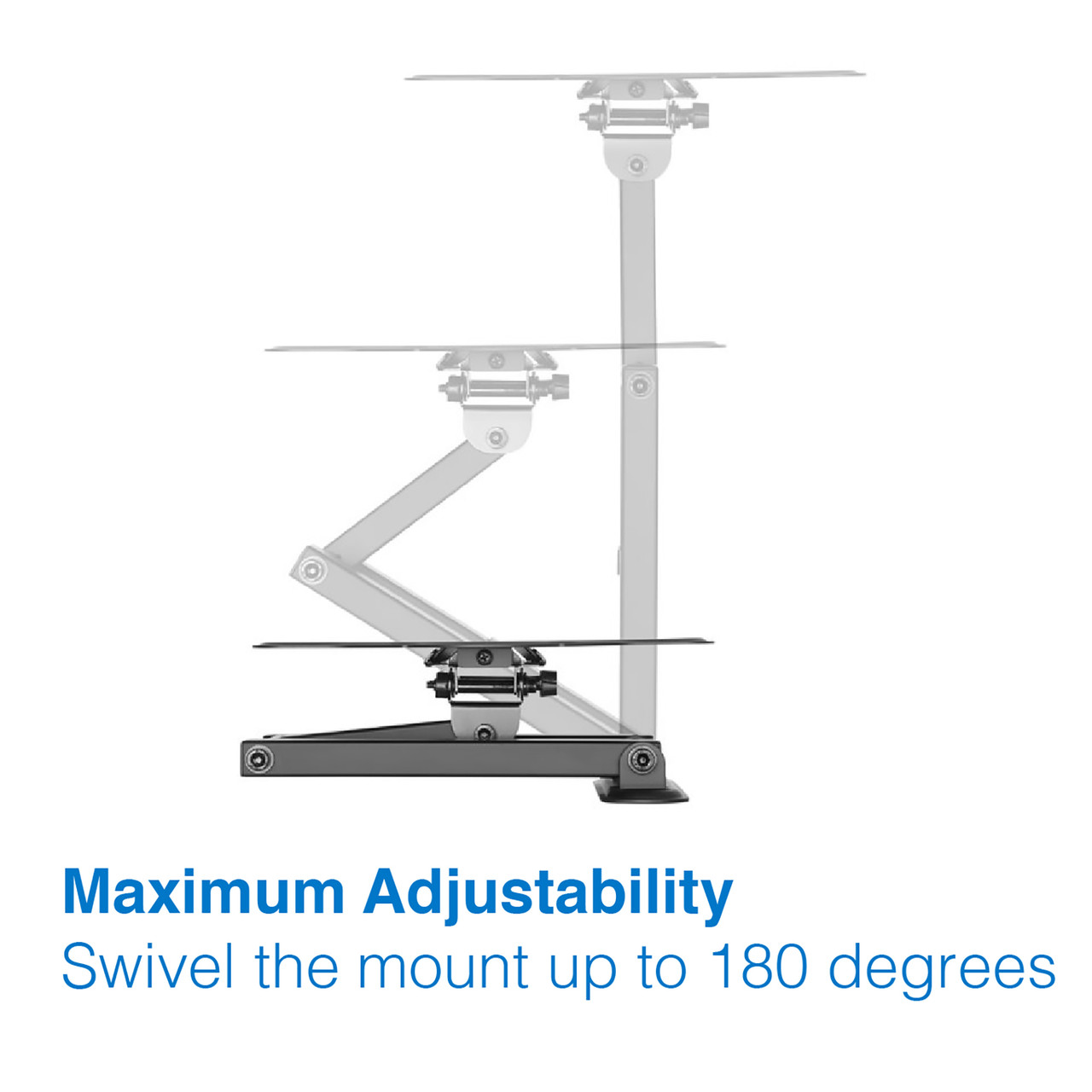 • Maximum Adjustability With the ability to swivel the mount up to 180 degrees you get an extreme range of horizontal adjustment potential. A maximum tilt of up to 12 degrees will help cater to a variety of viewing setups and desktop seating heights.