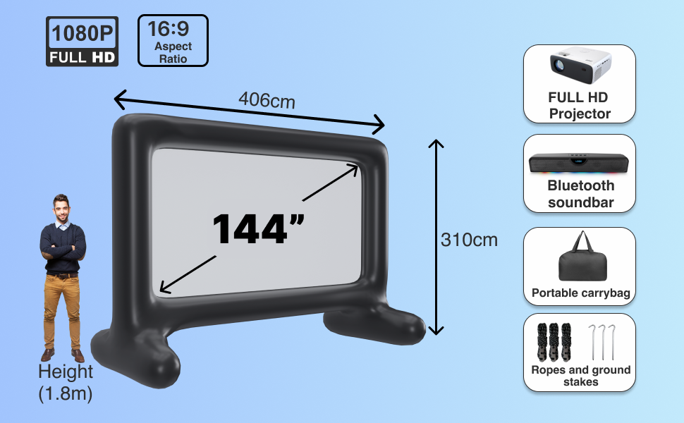 Transform your outdoor events with our bundled 144-inch inflatable screen. This easy-to-install screen has its own electric air pump and rope tie-downs, simplifying the setup process. Find a suitable location, ideally sheltered from the wind, and enjoy movies on the big screen. Remember, you must ensure there is a sufficient distance (throw) between the projector and the screen. The further you position the projector, the larger the screen image, although brightness may decrease accordingly. Ideal for creating unforgettable outdoor movie nights.