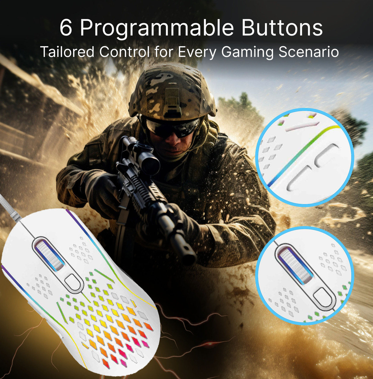 With 13 different lighting modes, 6 individual buttons and DPI settings youll have all the flexibility to customise the mouse to your specific needs. Laser Gaming is here to ensure your tools wont let you down in the heat of battle.