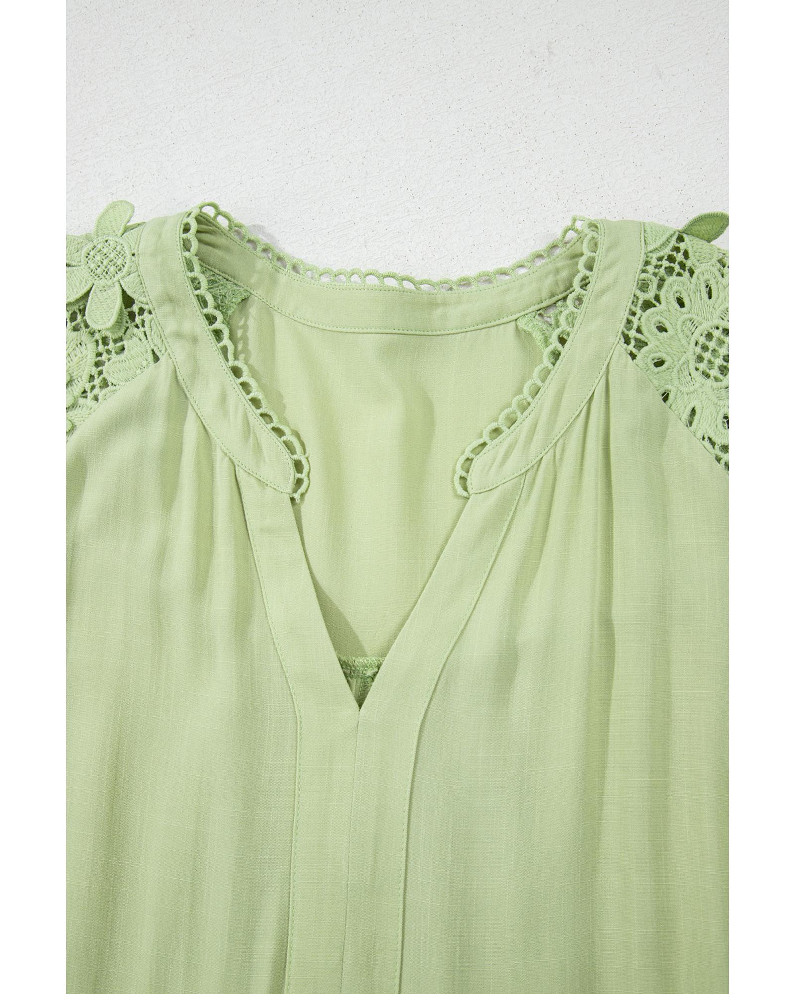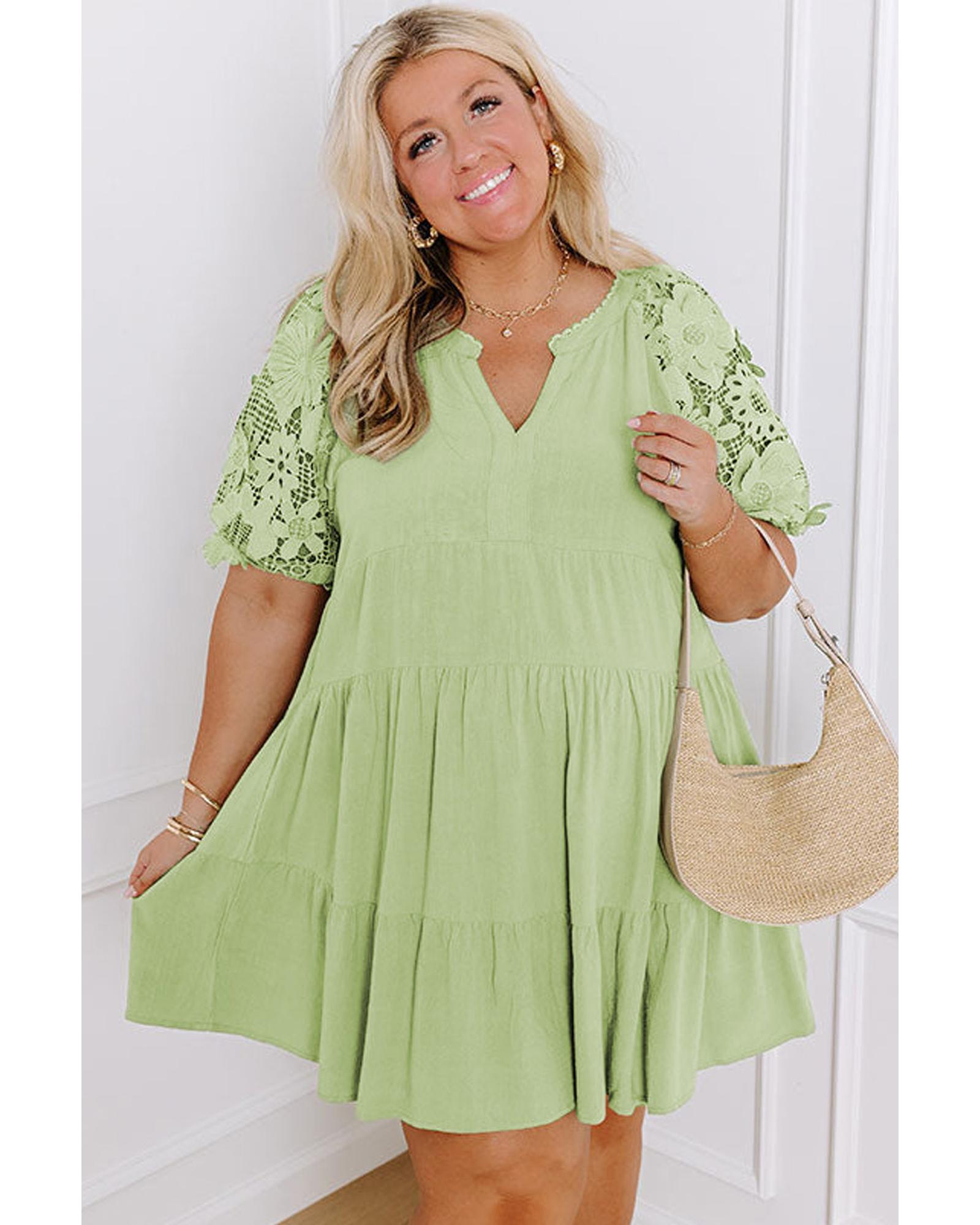 - Laurel Green Floral Crochet Short Sleeve Notch V Neck Tiered Plus Size Mini Dress