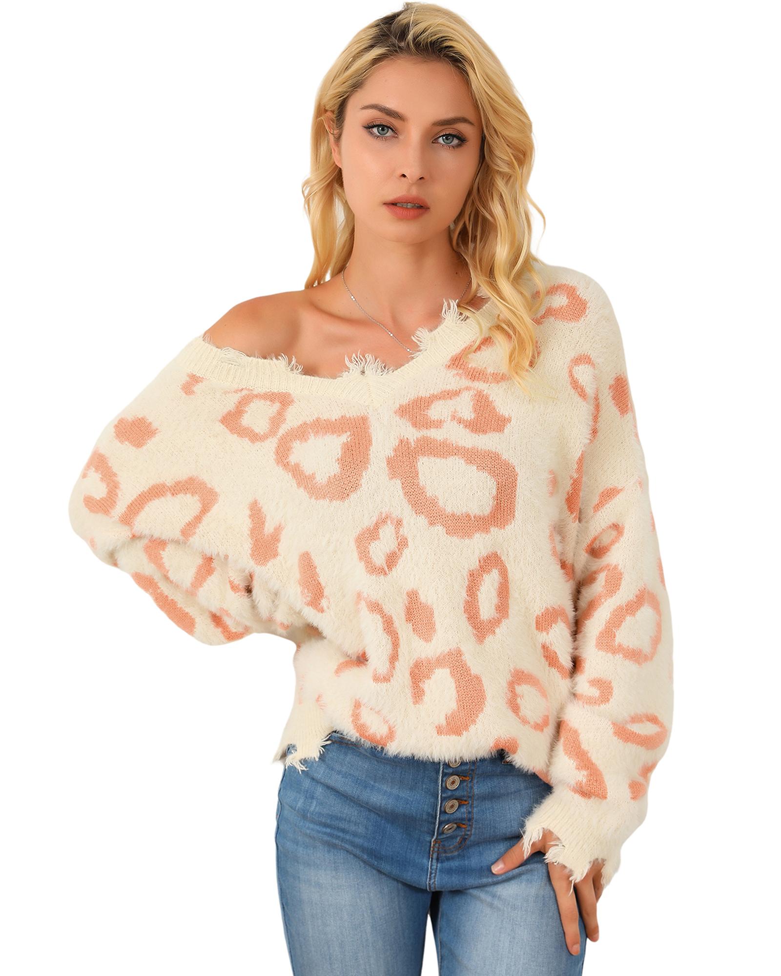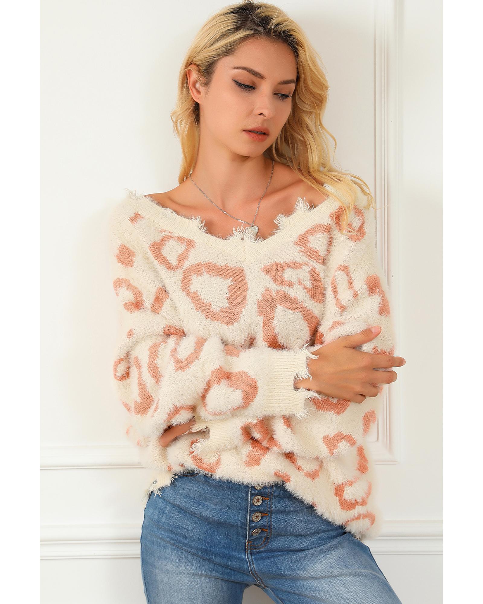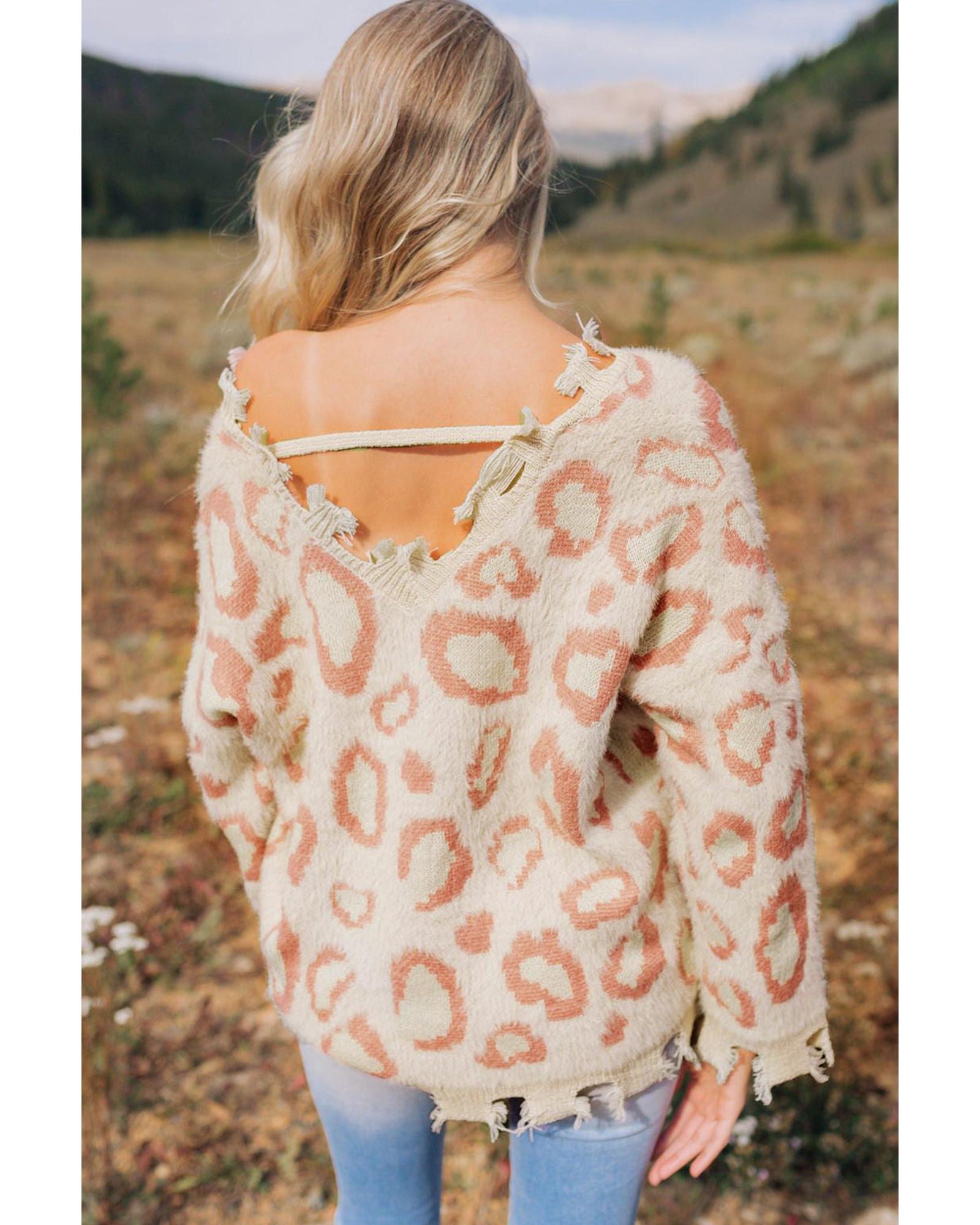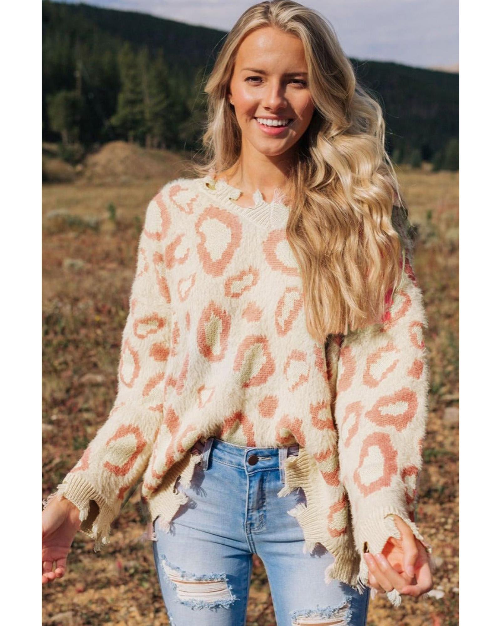 - Leopard Animal Print Distressed Trim Fuzzy Sweater