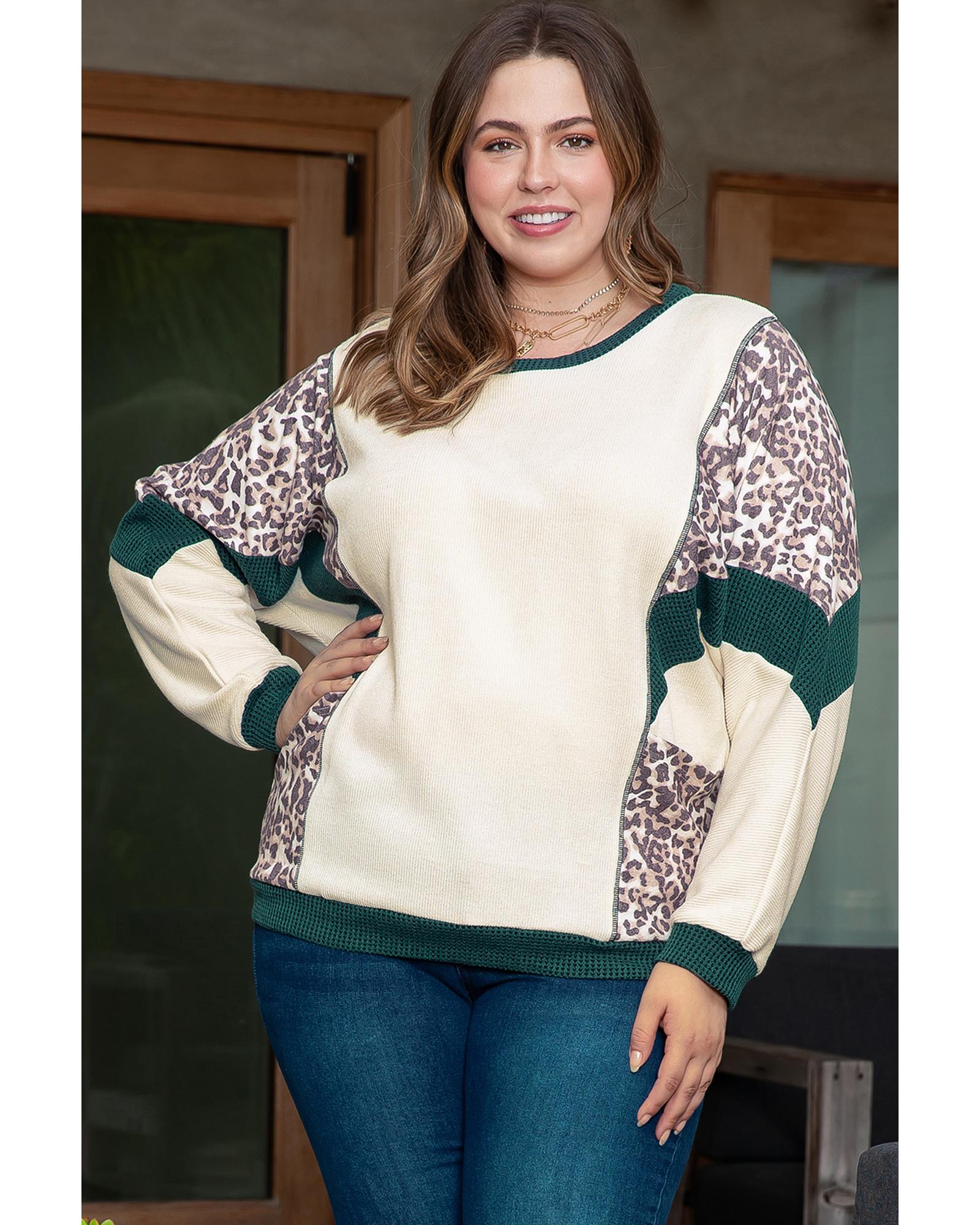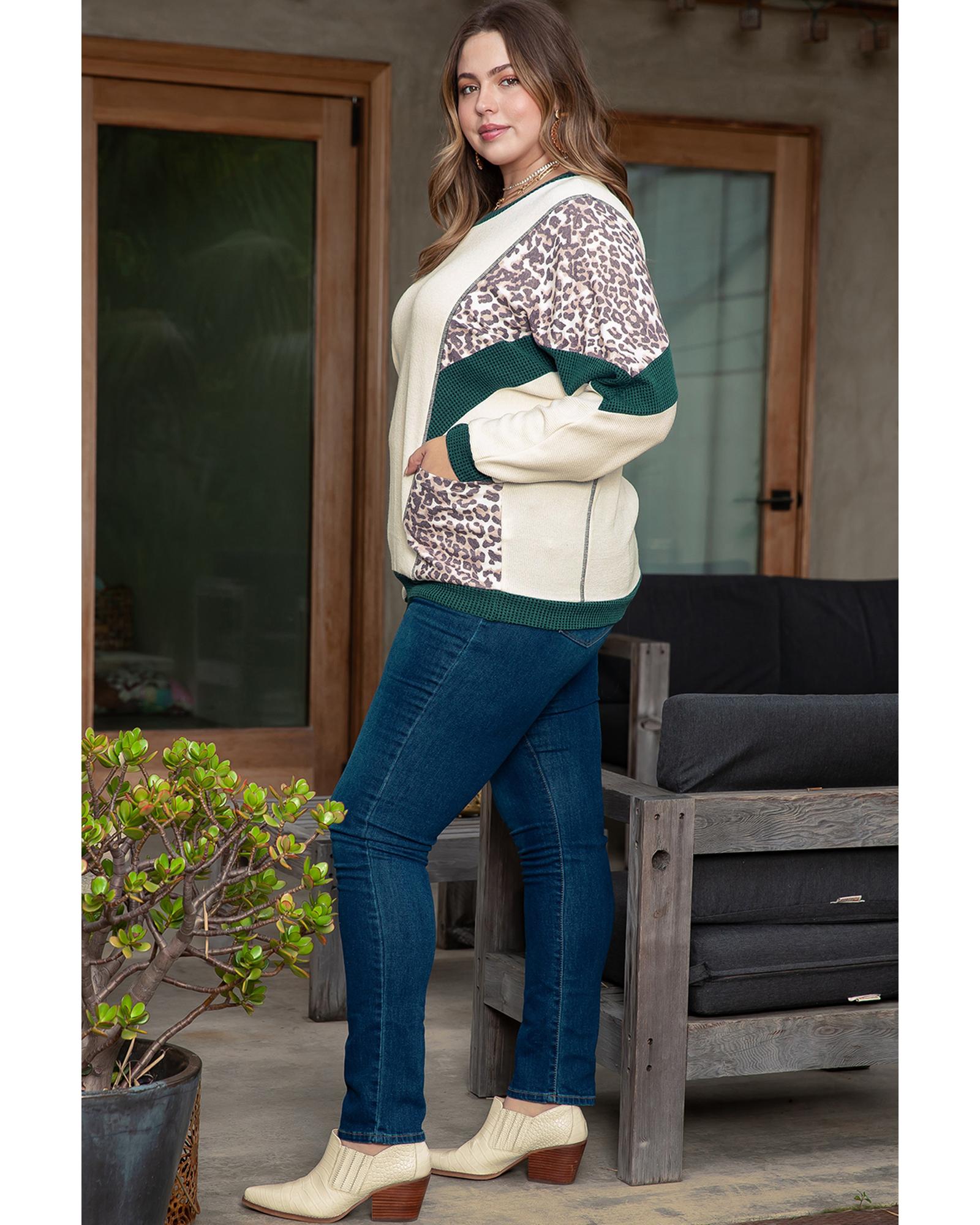 Leopard colorblock patchwork design Chic and romantic dolman sleeve Lightweight and cozy material Available in plus sizes for different ages - Size on Tag: 1X