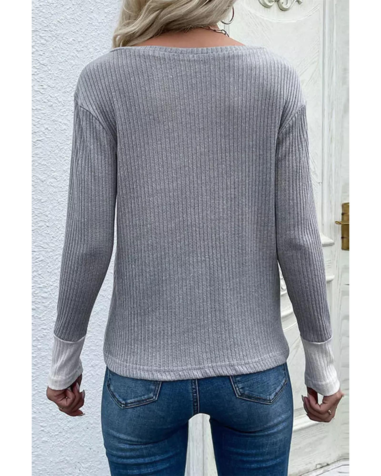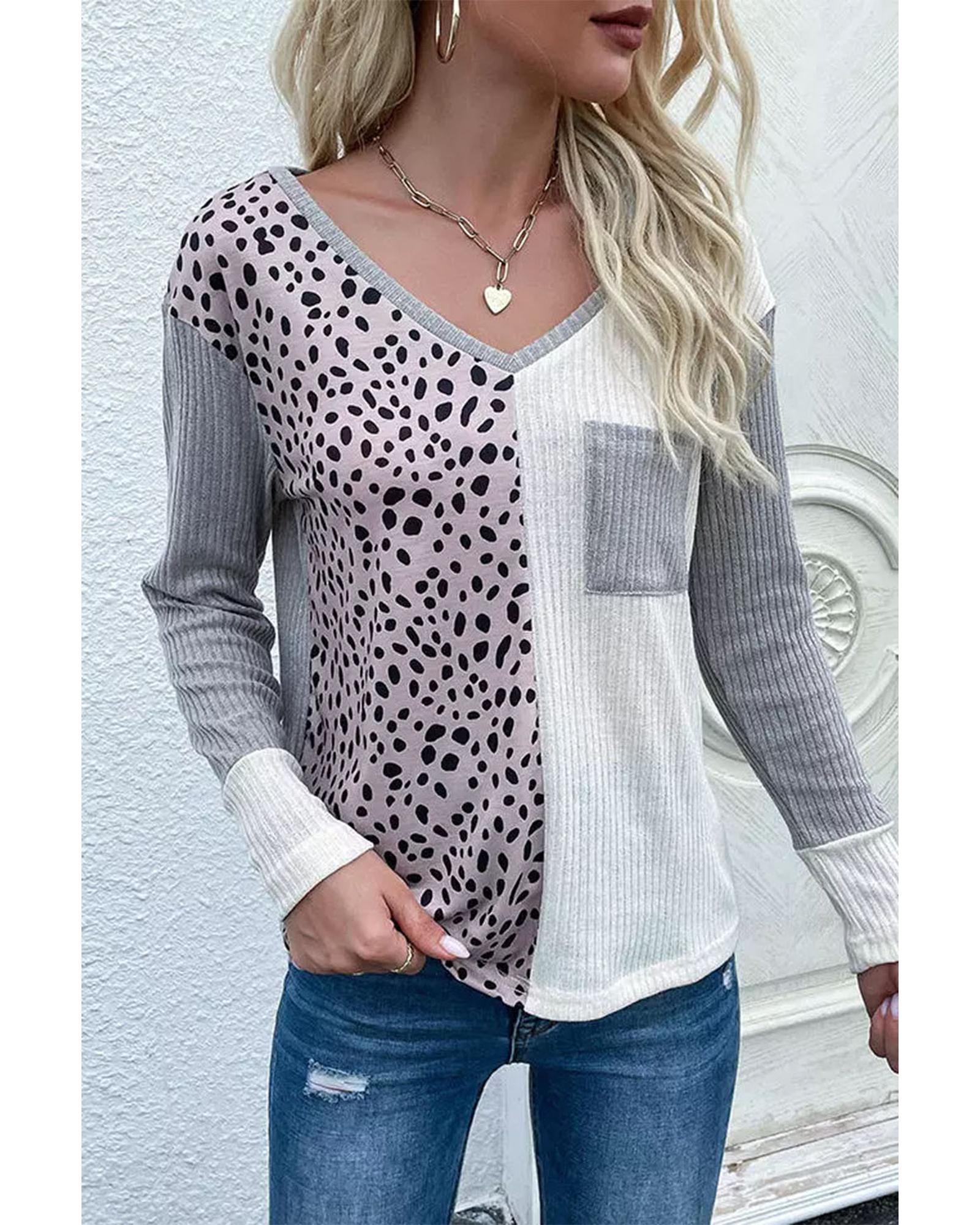 Leopard Patchwork Ribbed Color Block V Neck Top – L