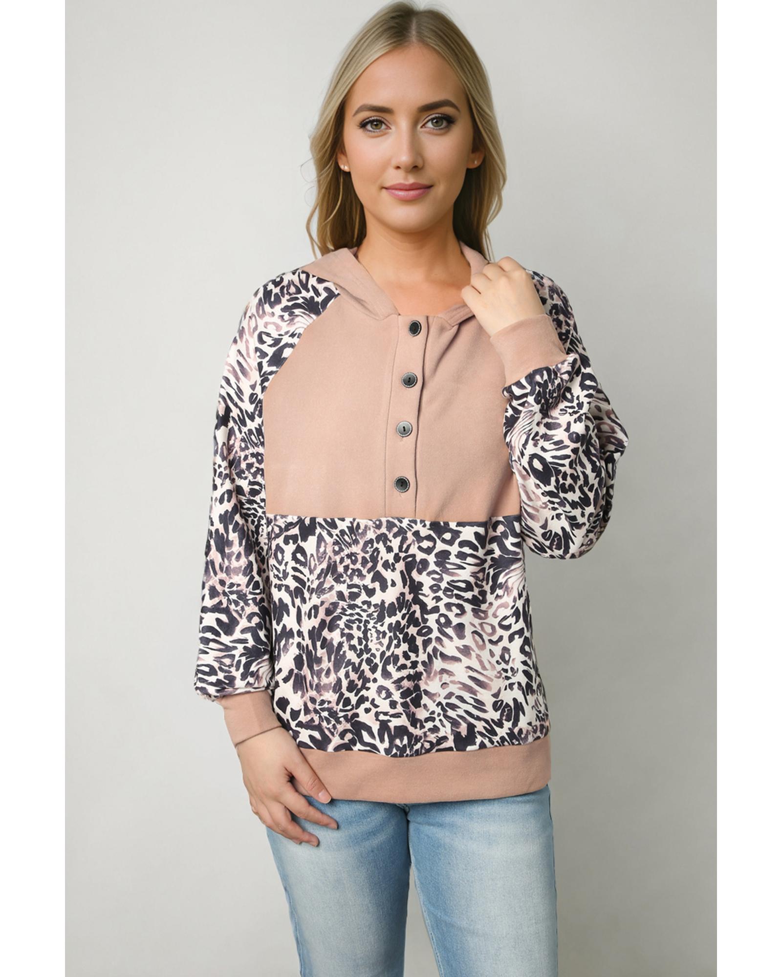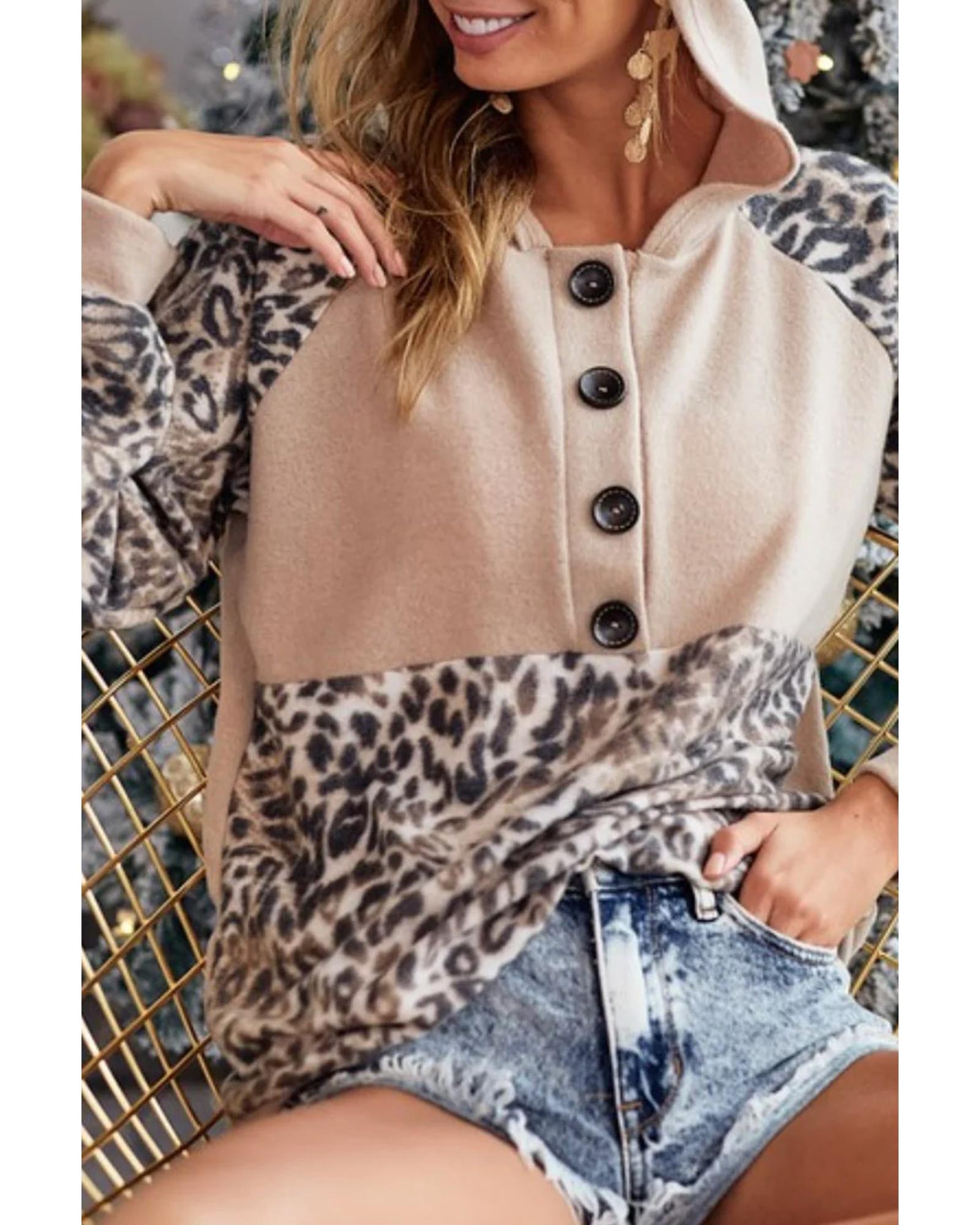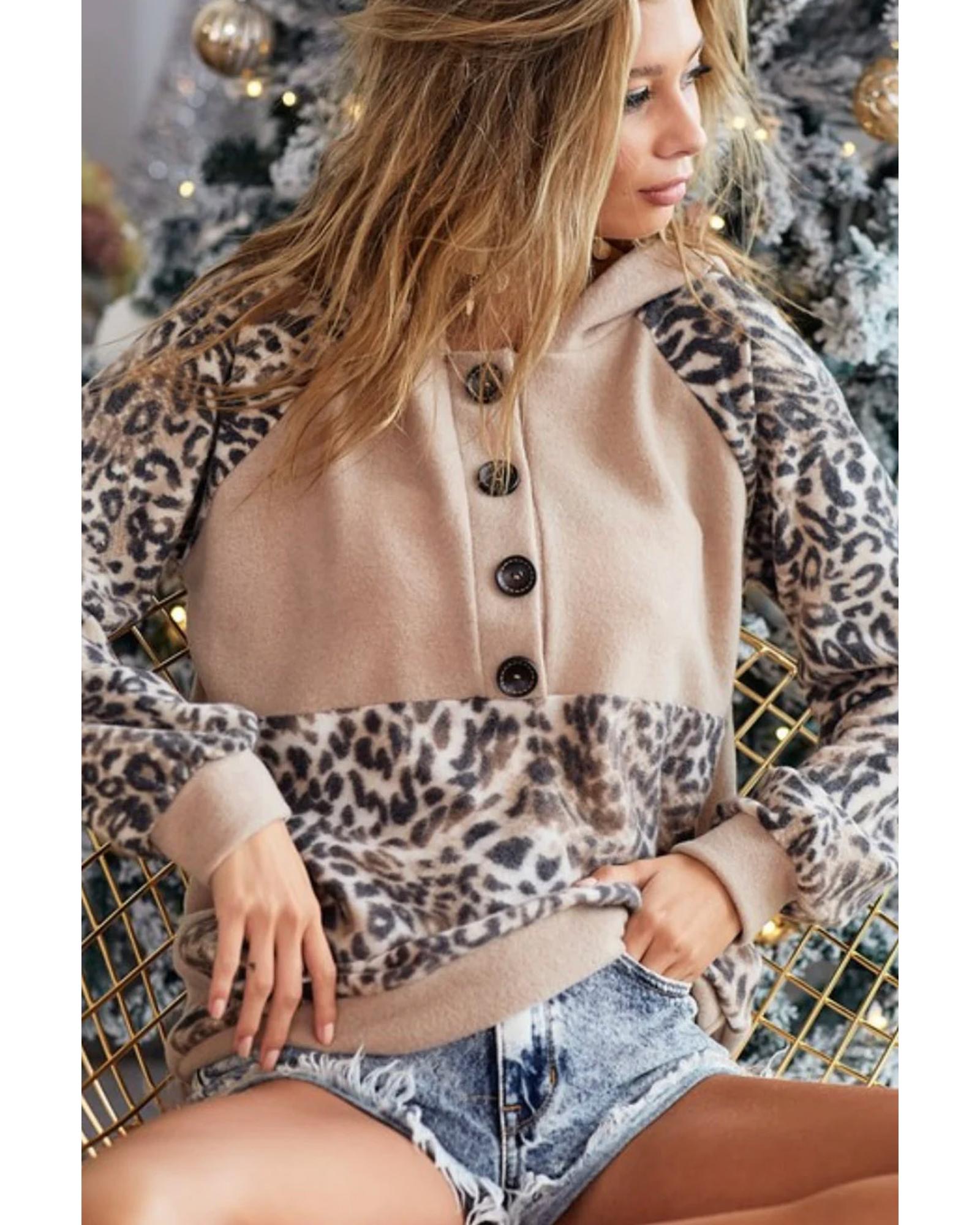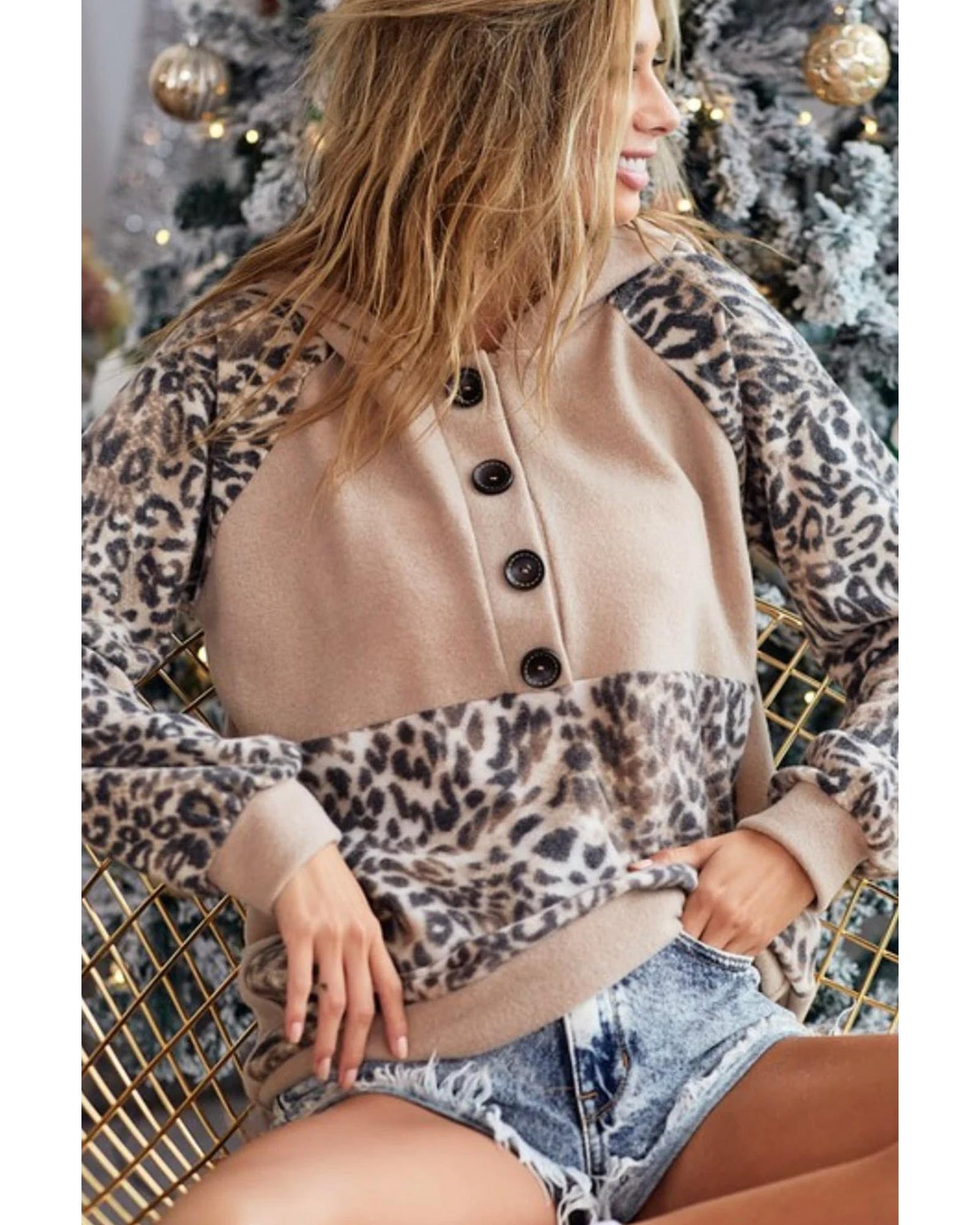 Leopard Print Buttoned Neckline Raglan Sleeve Hoodie – S