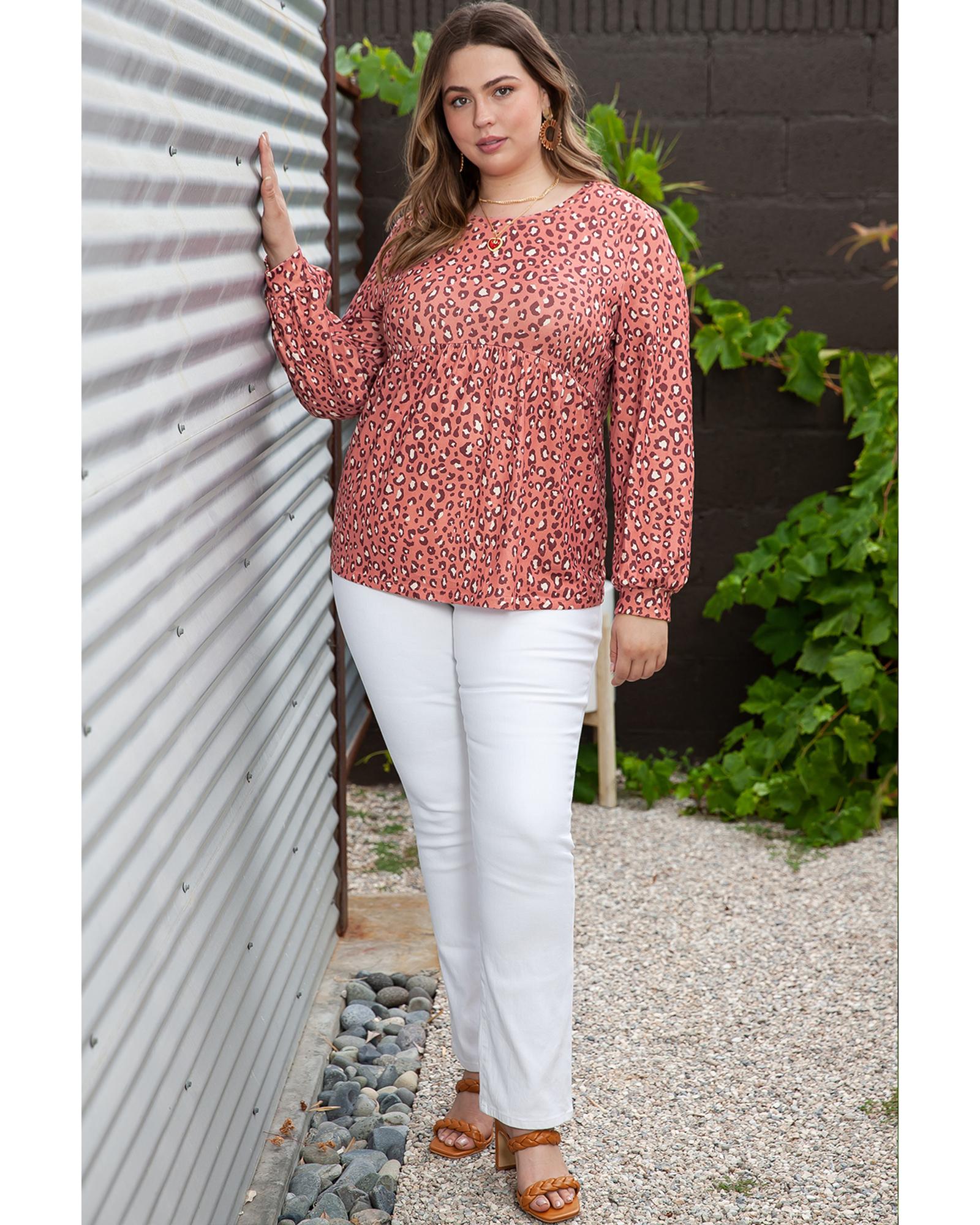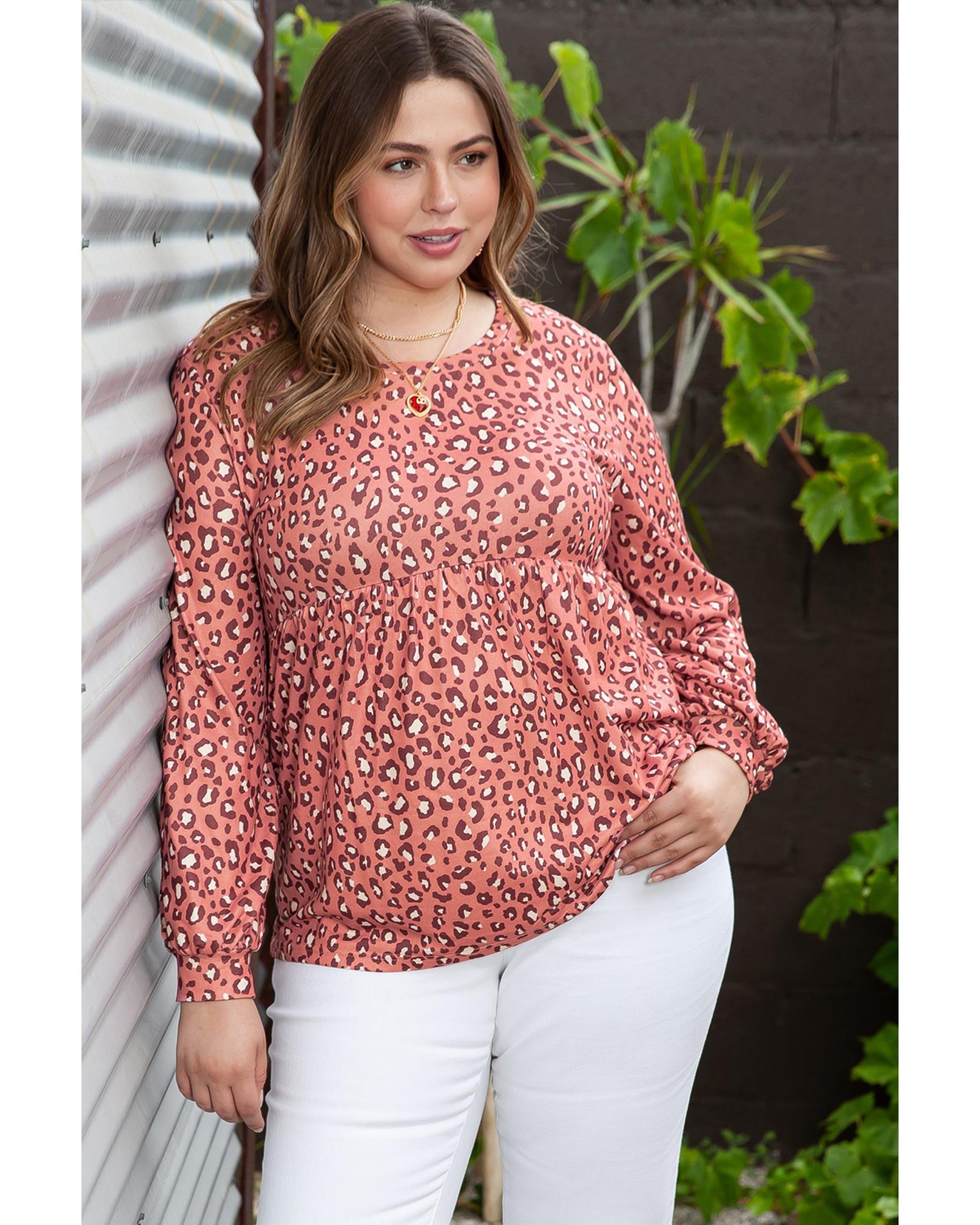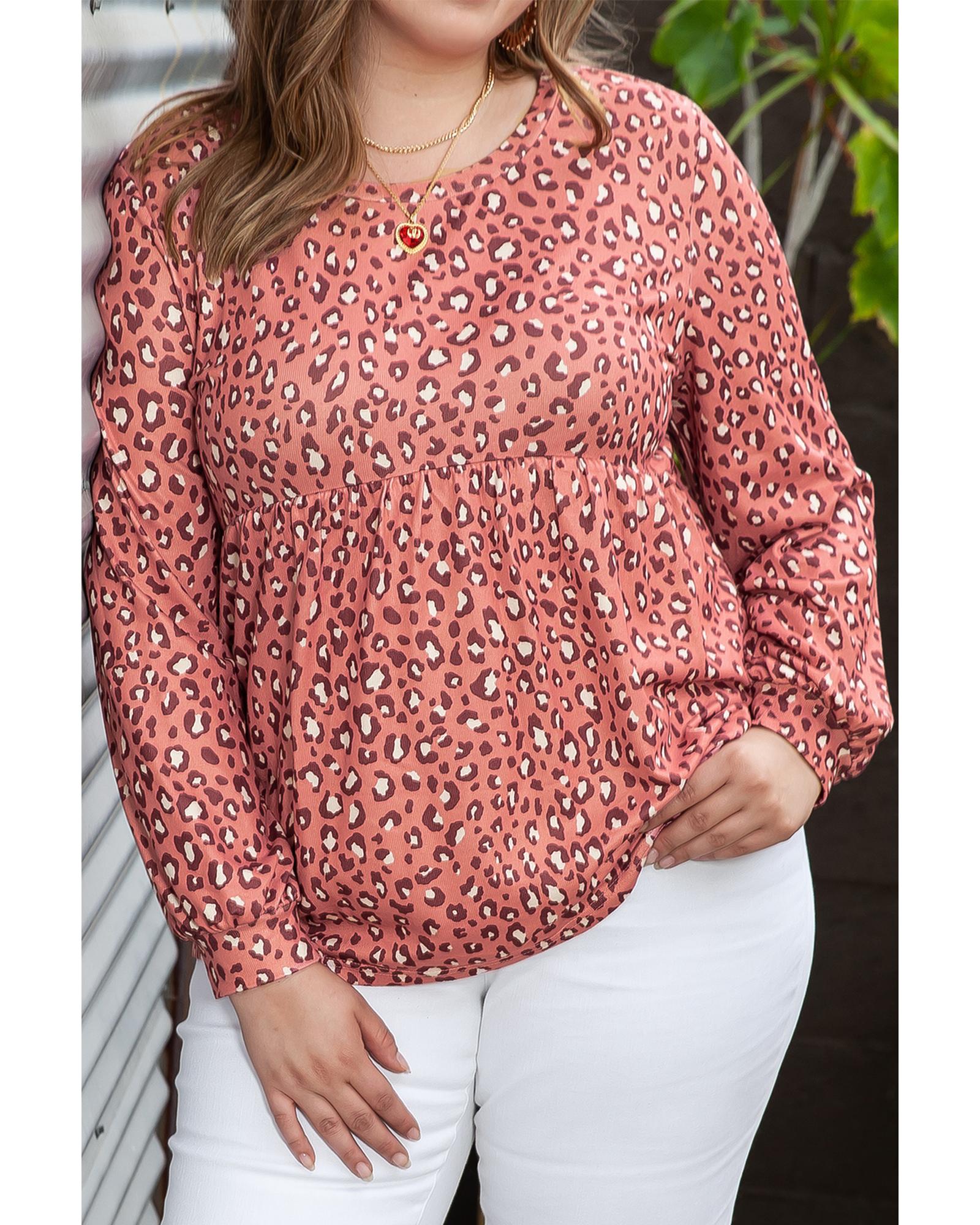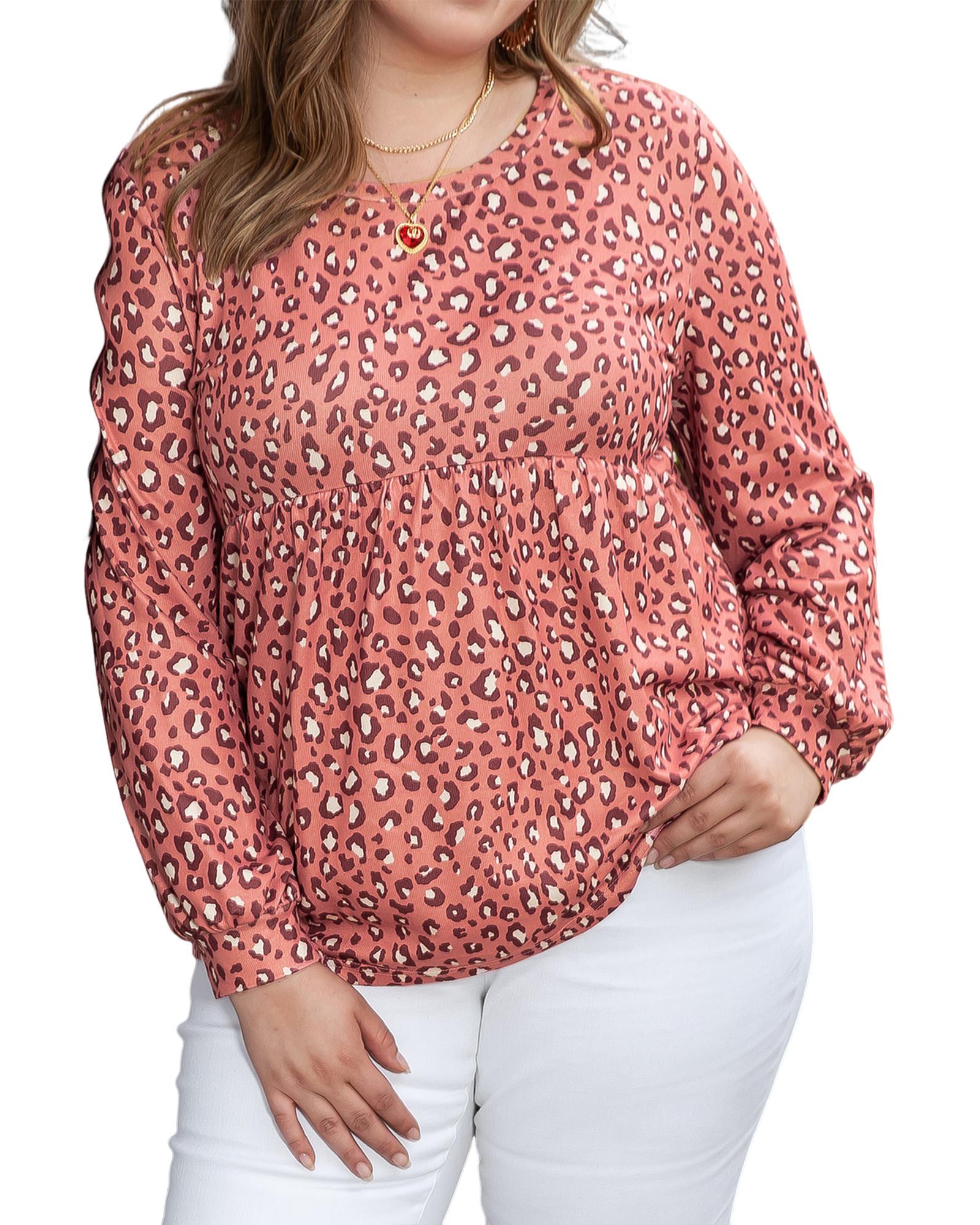 Leopard Print Long Sleeve Ruffled Babydoll Plus Size Blouse – 2X
