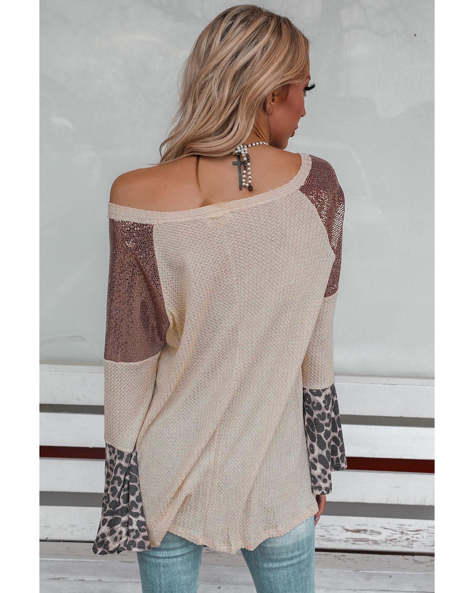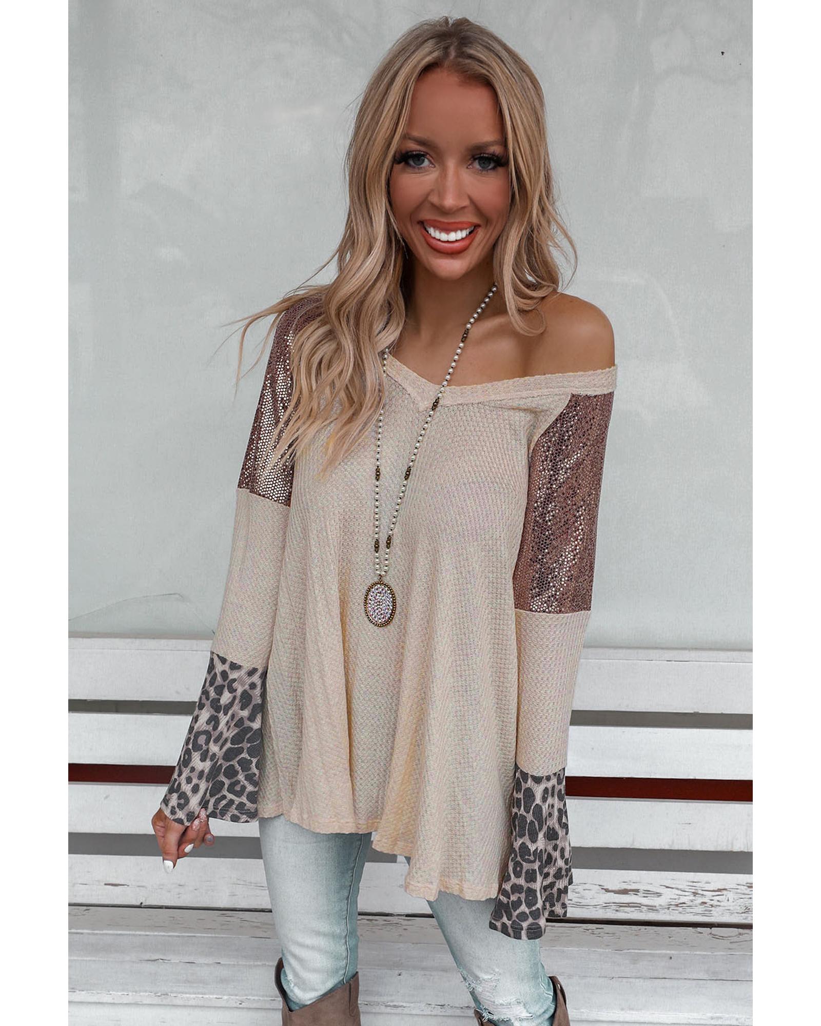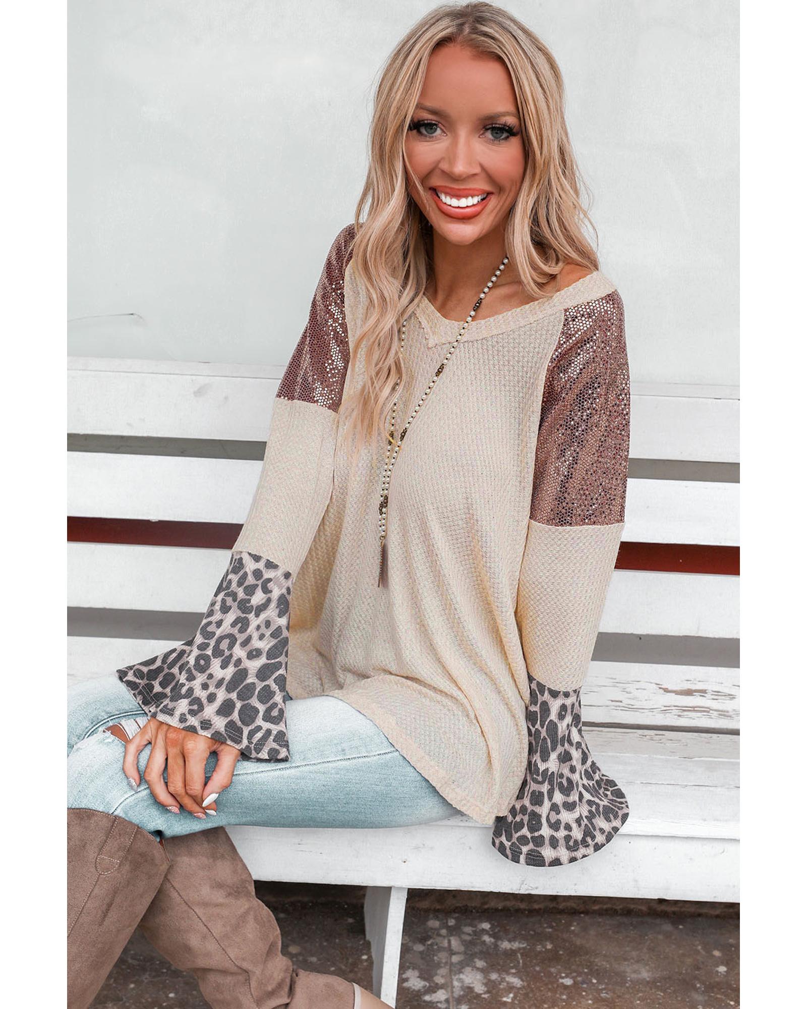 • Leopard Sequin Patchwork Bell Sleeve V Neck Tunic Top