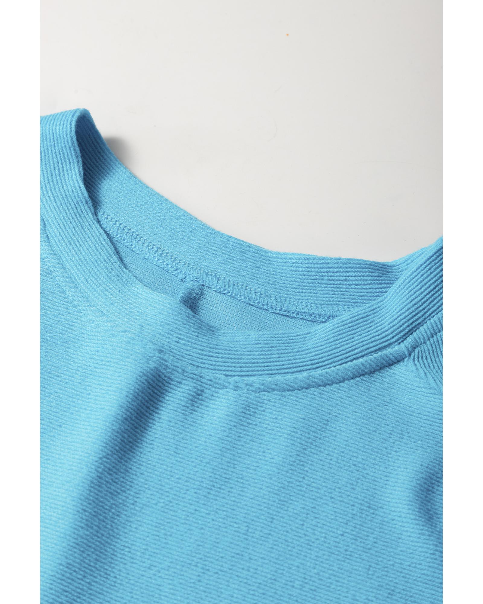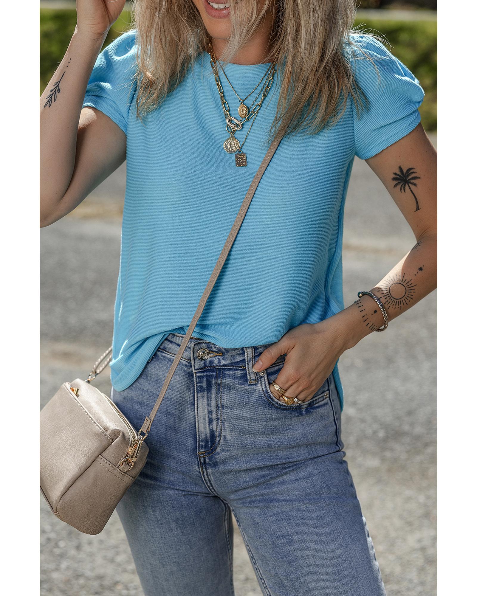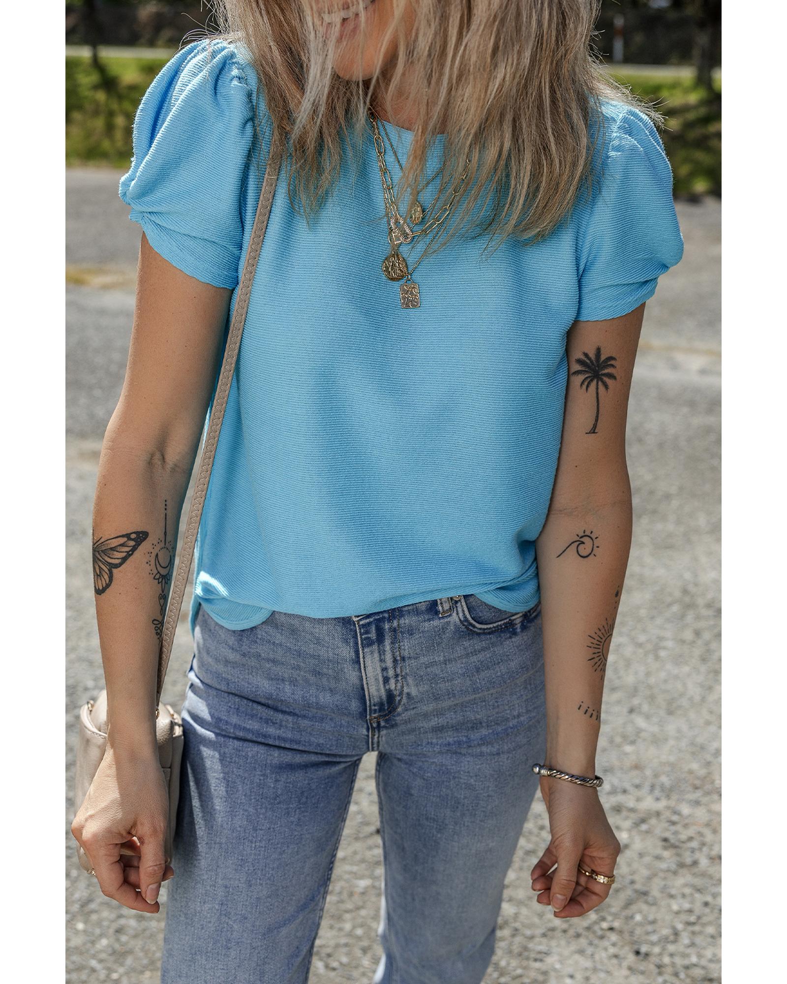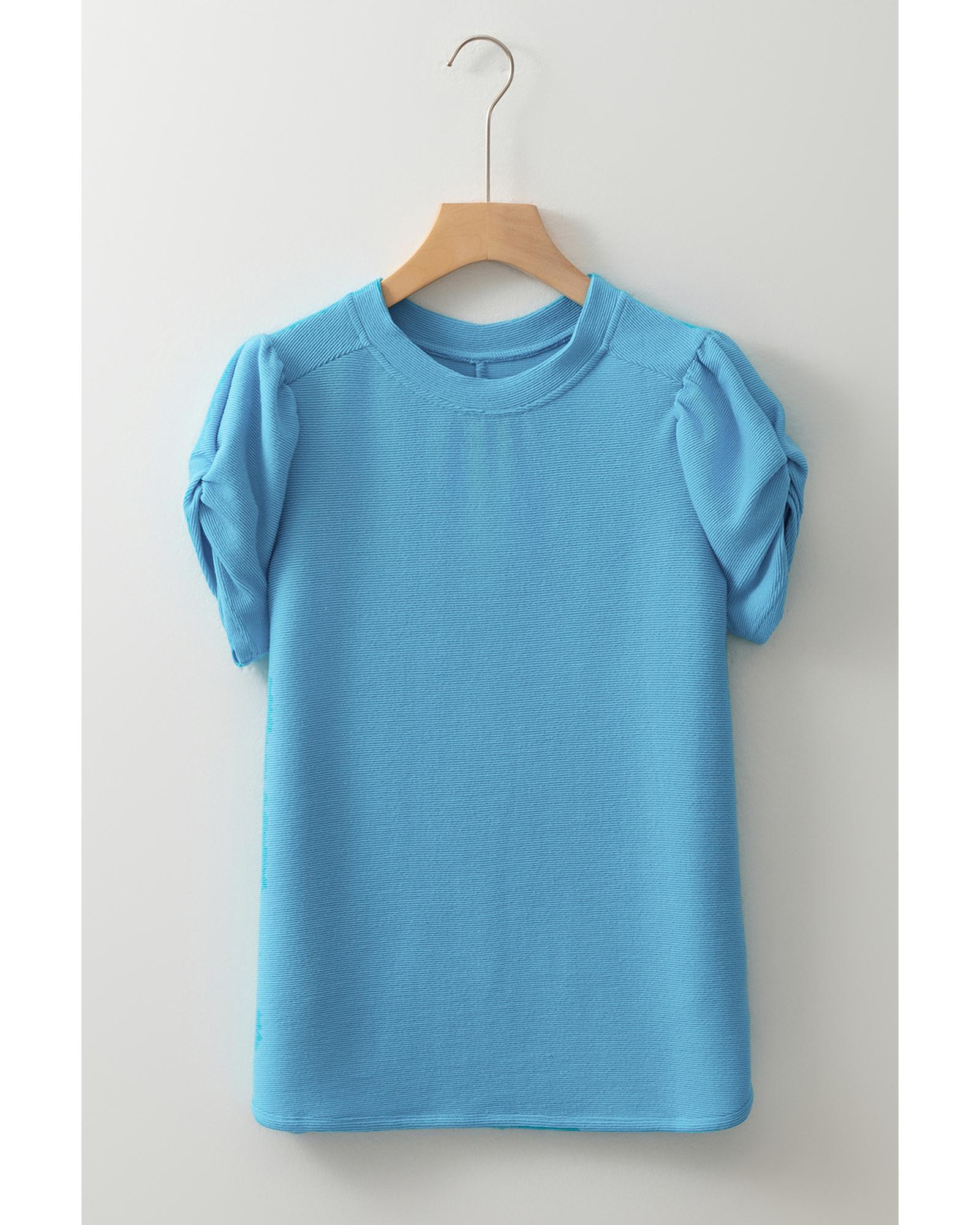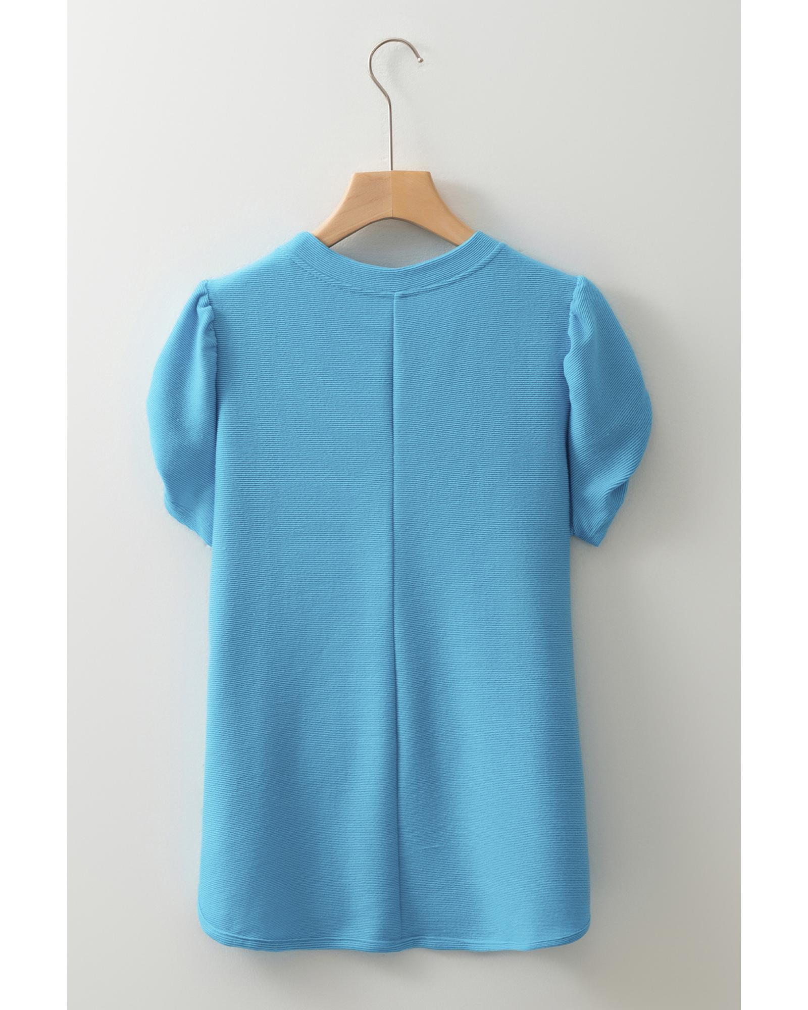 Light Blue Bubble Sleeve Solid Color Elegant T-Shirt – XL