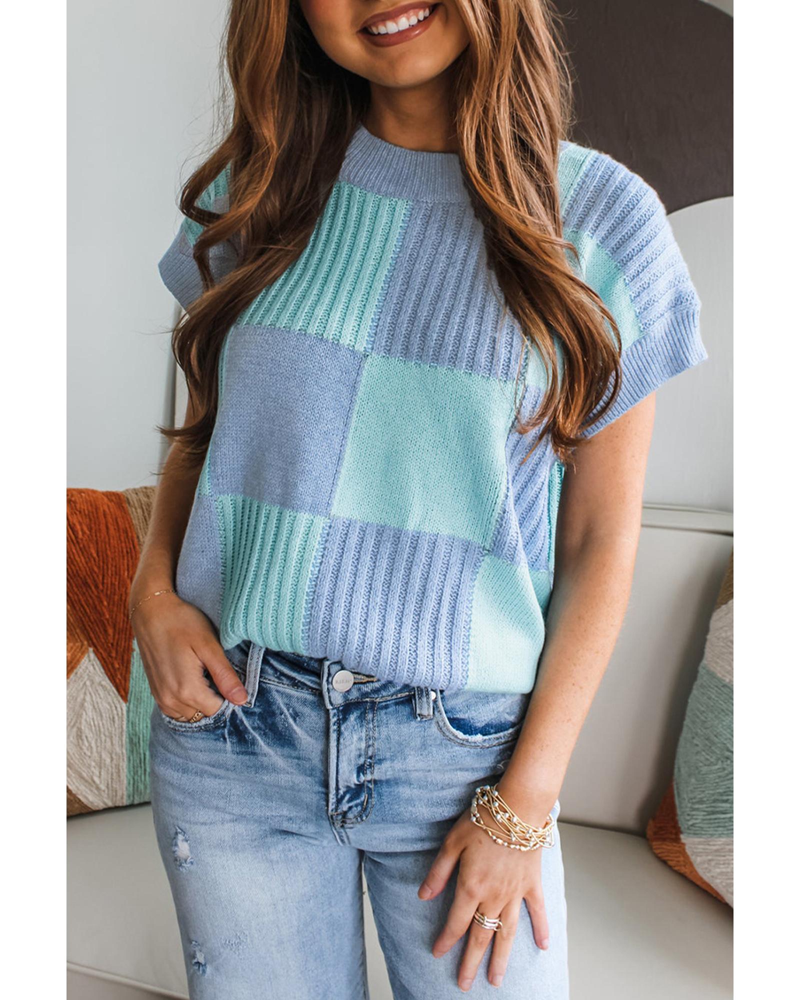 Light Blue Checkered Color Block Crew Neck Short Sleeve Sweater – XL