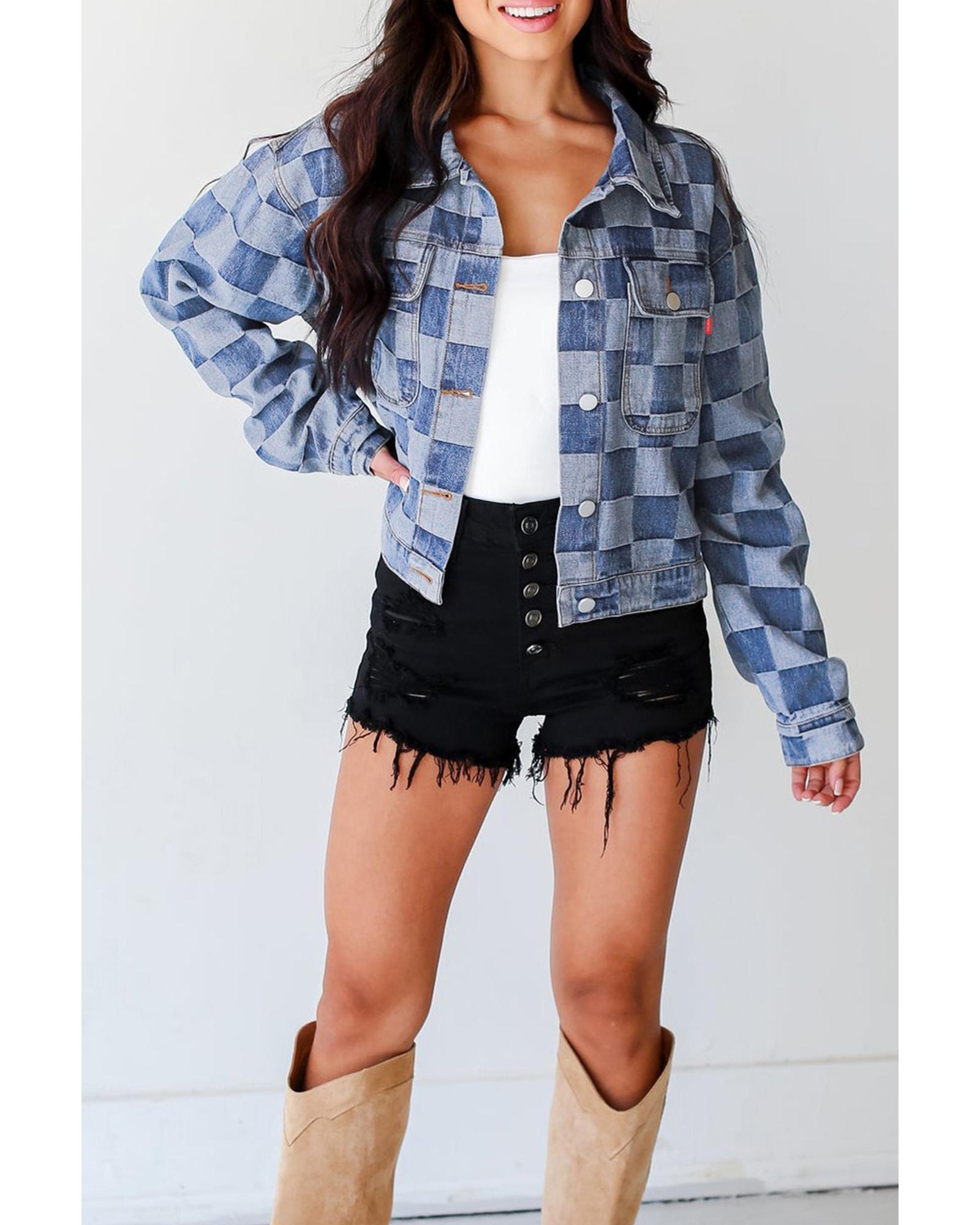 - Light Blue Checkered Patchwork Button up Denim Jacket