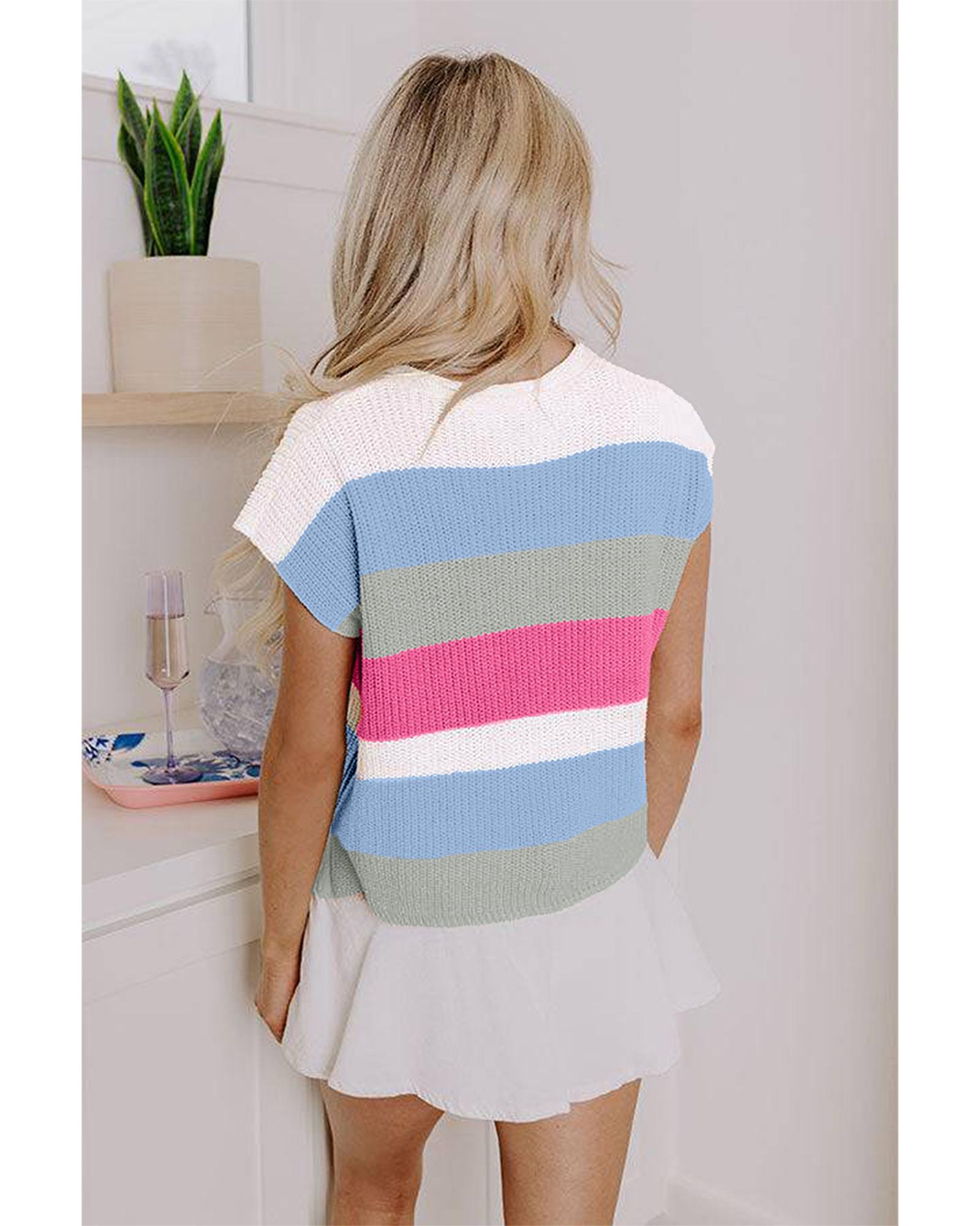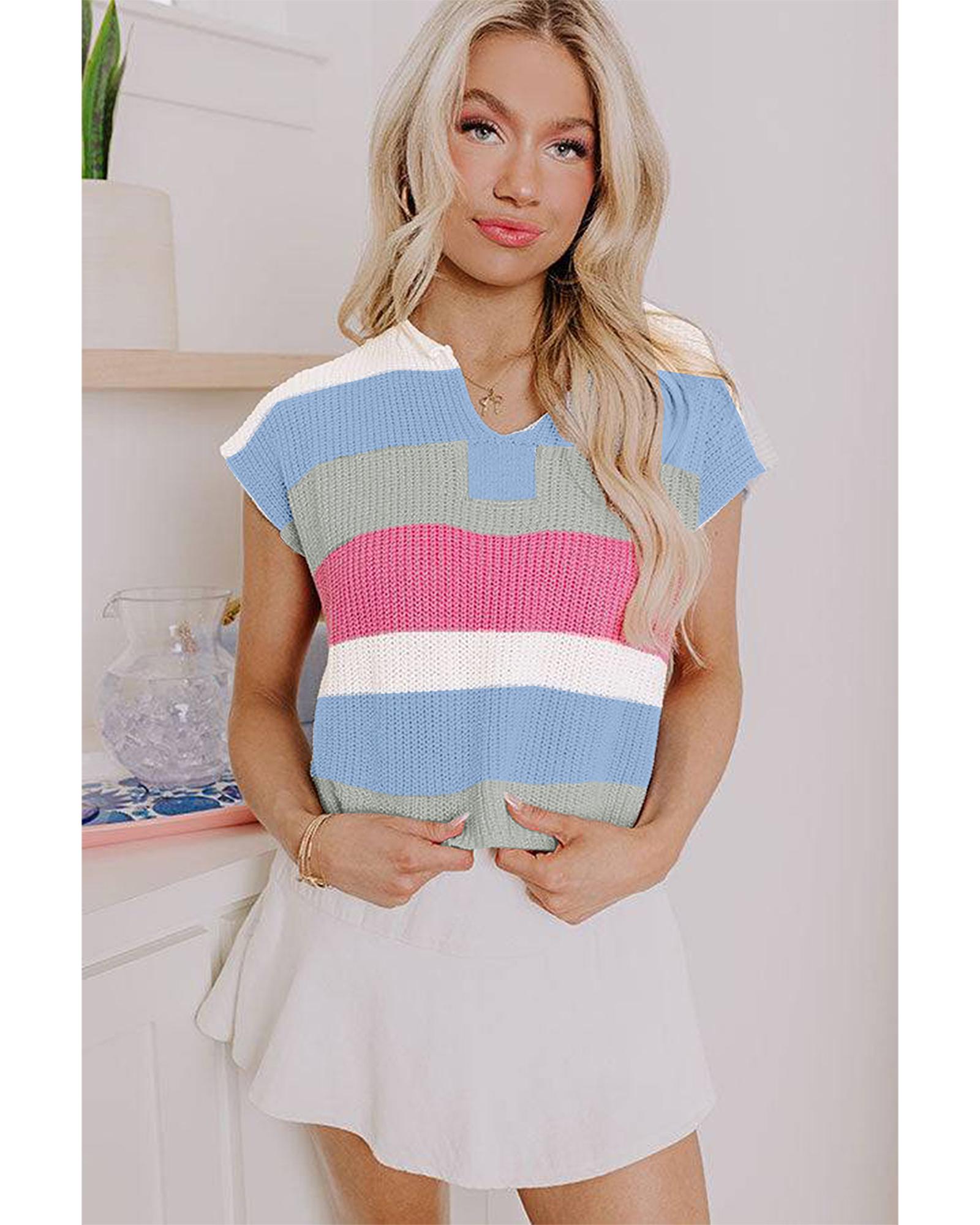 Light Blue Color Block Notch V Neck Sweater T Shirt – M