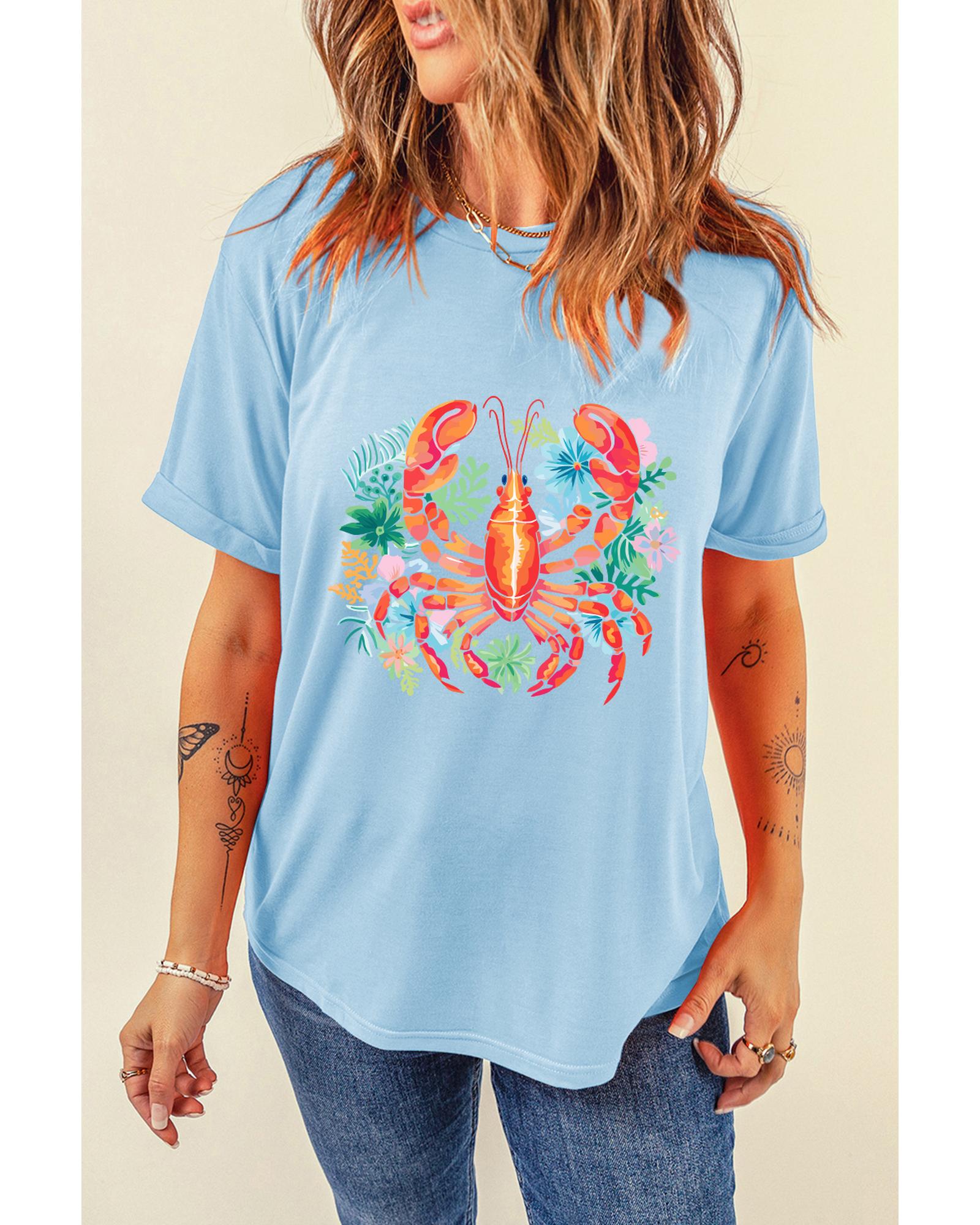 Light Blue Floral Summer Lobster Graphic Tee – XL