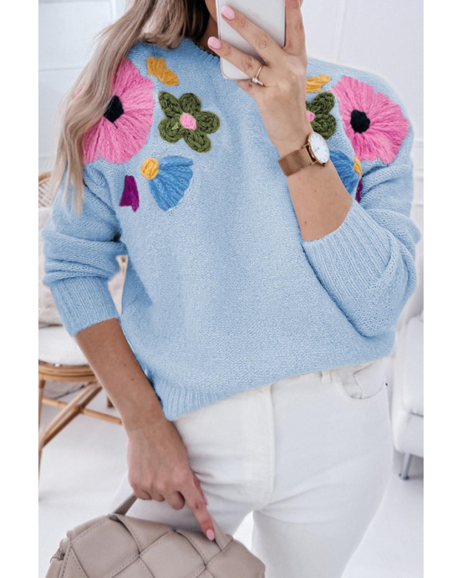Light Blue Knitted Flower Pattern Ribbed Edge Sweater – M