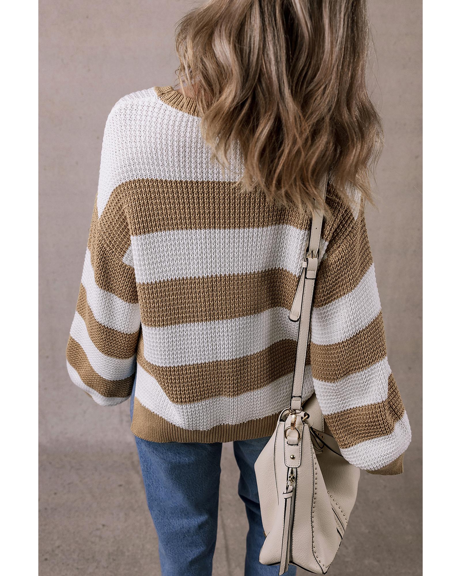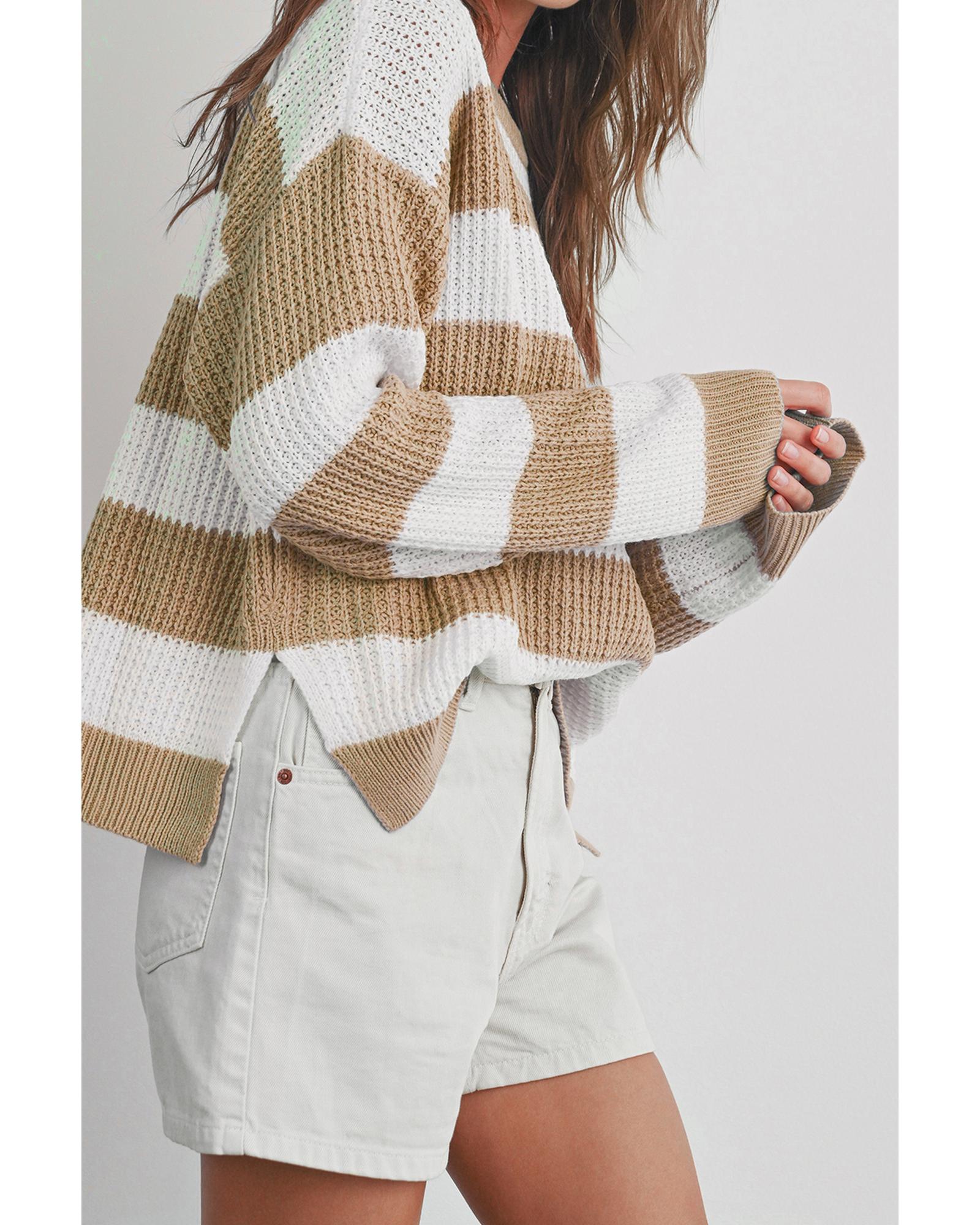 Light French Beige Colorblock Striped Drop Shoulder Side Slit Sweater – L