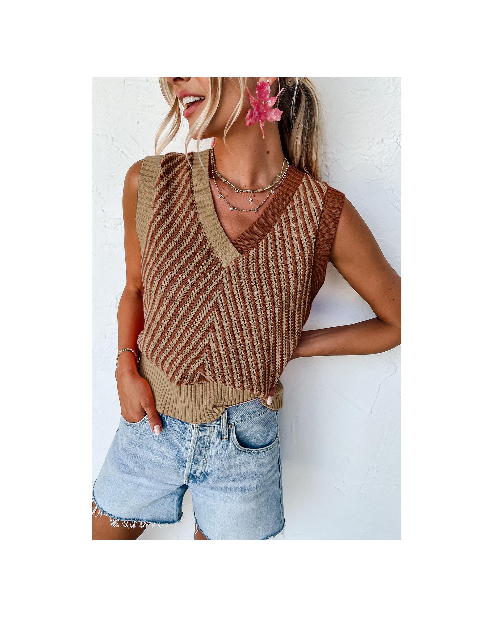 • Light French Beige Contrast Chevron Knit V Neck Sweater Vest