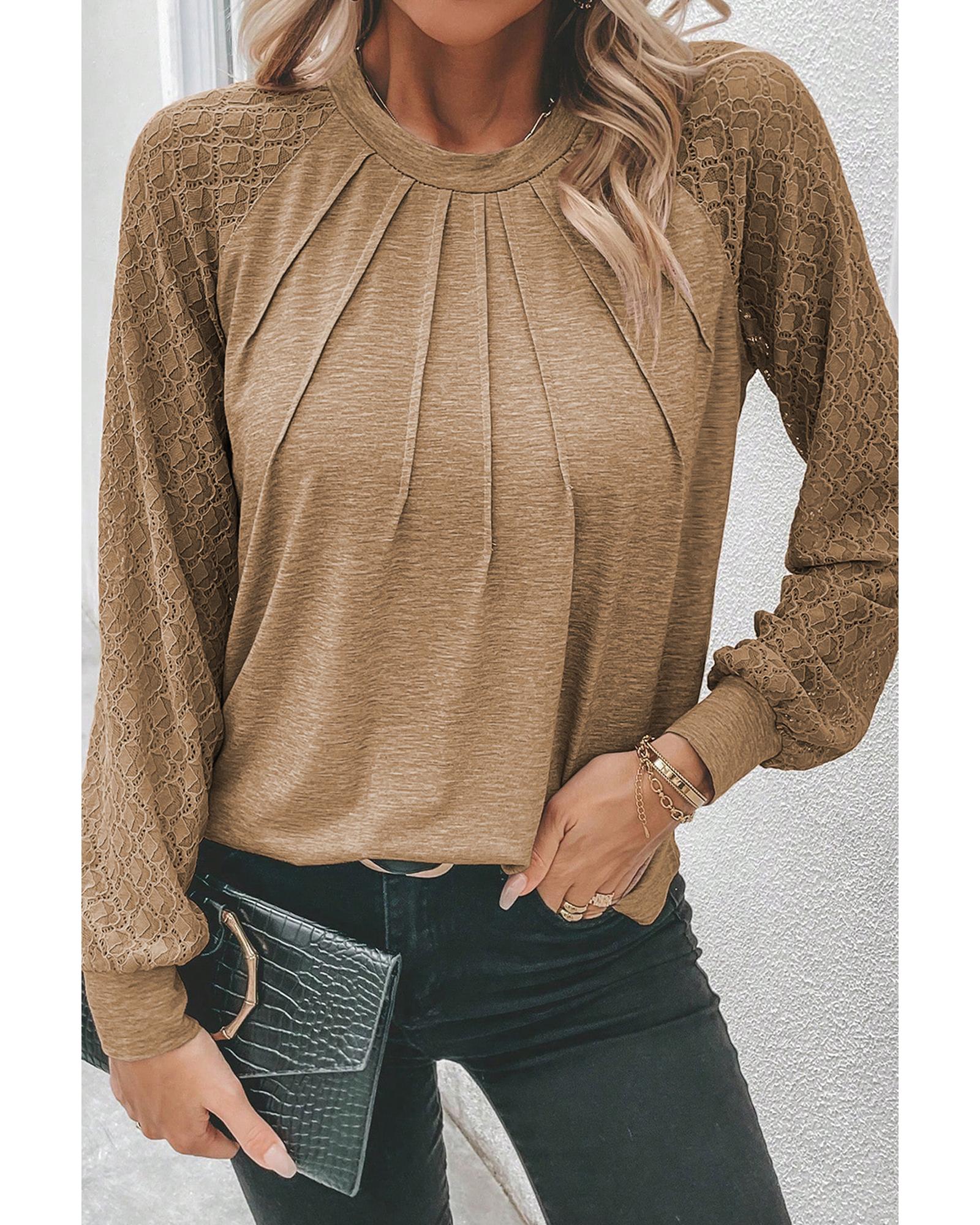 Light French Beige Contrast Lace Raglan Sleeve Plicate Round Neck Top – S