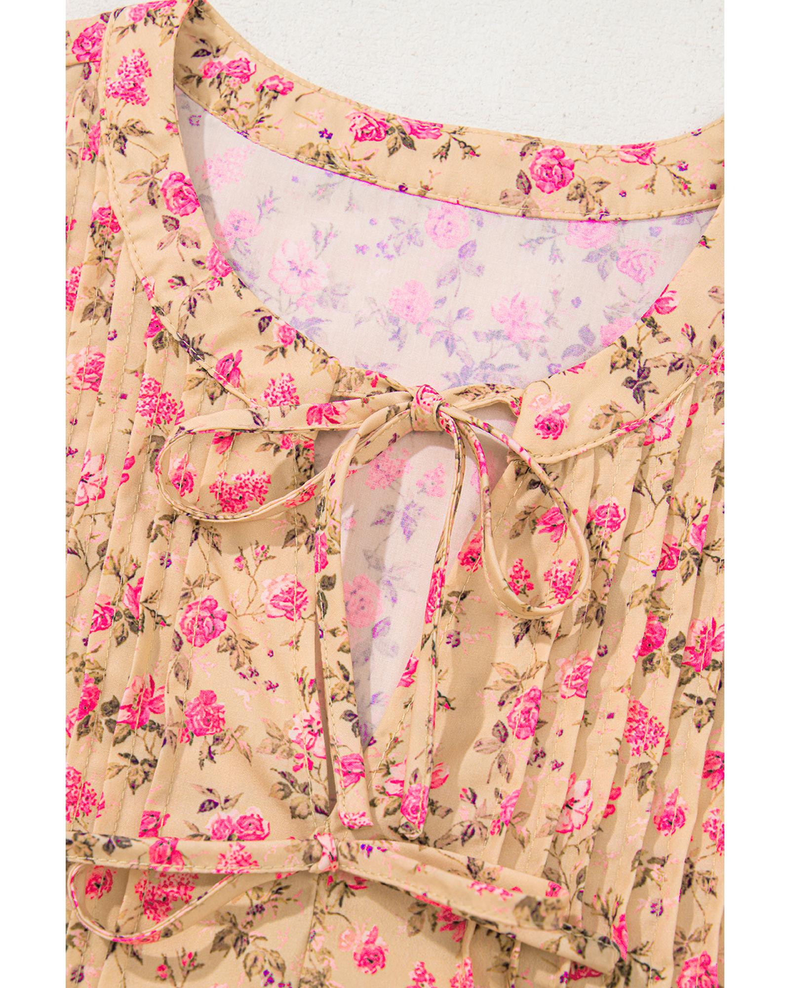 Light French Beige Floral Print Bow Pintuck Bust Half Puff Sleeve Blouse Top – S